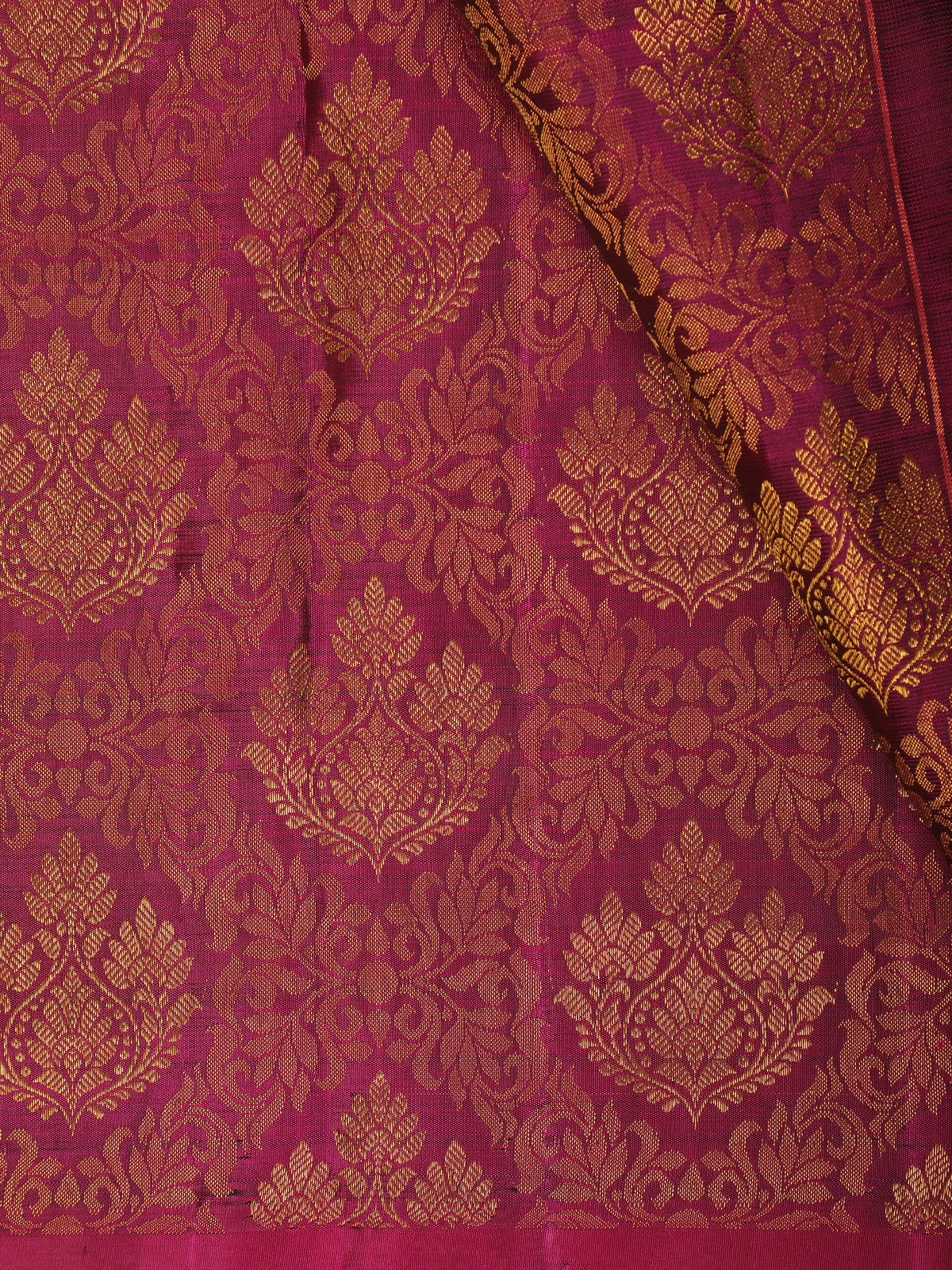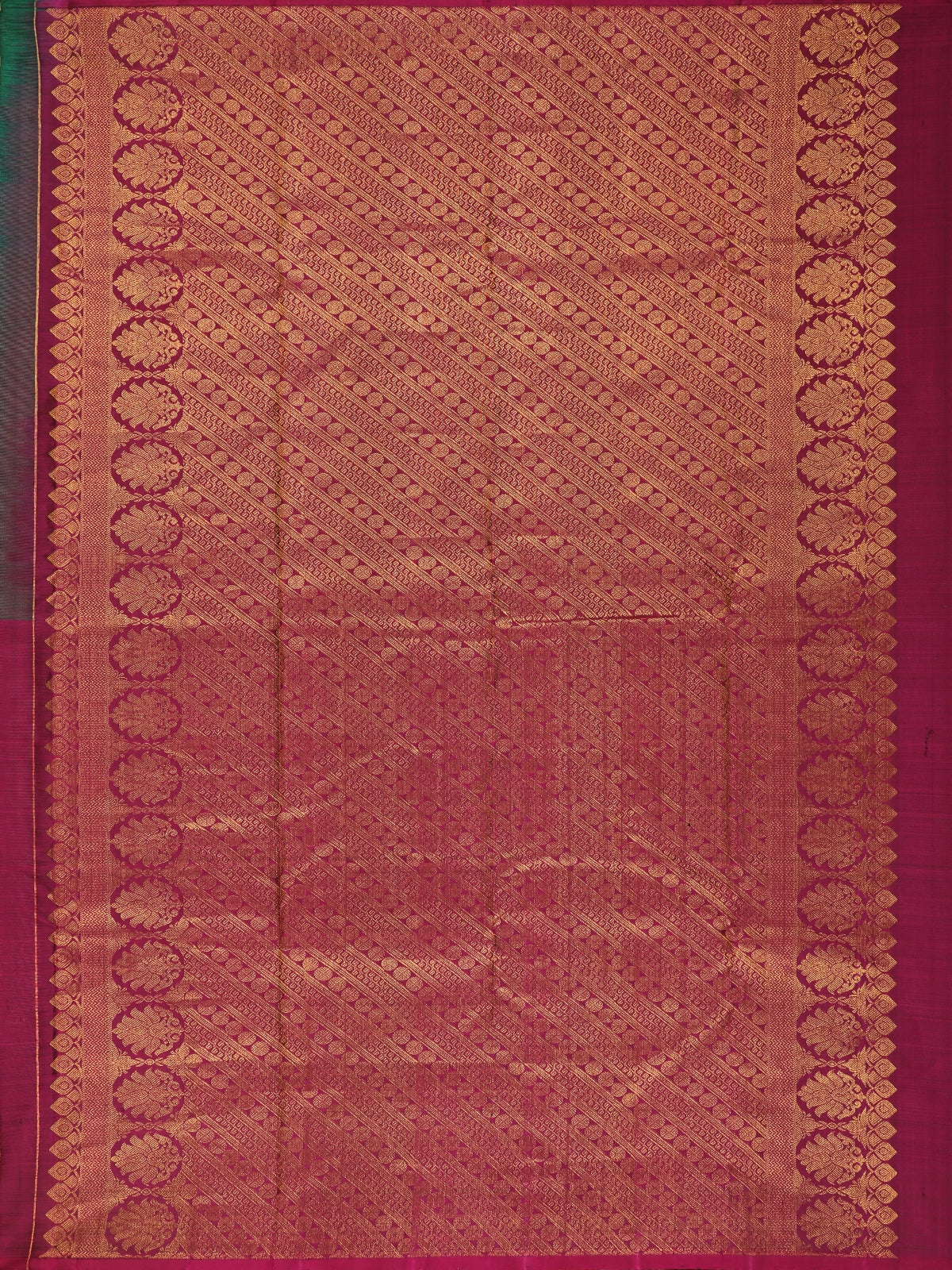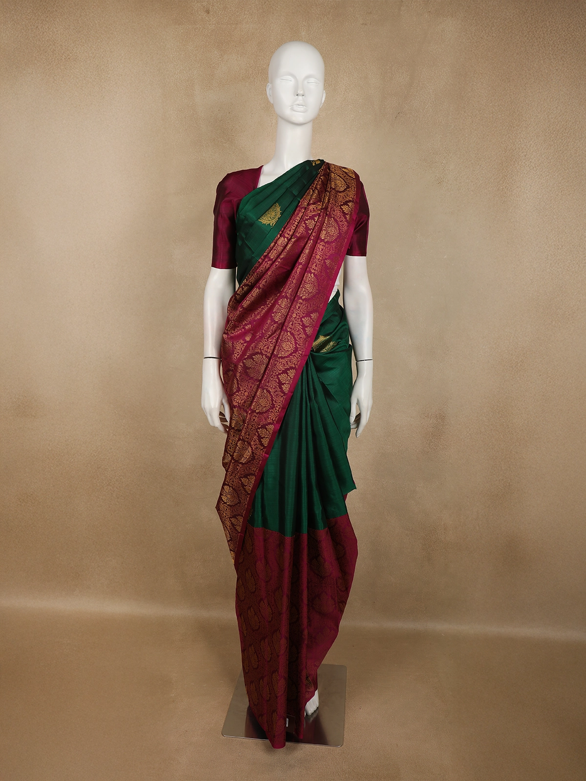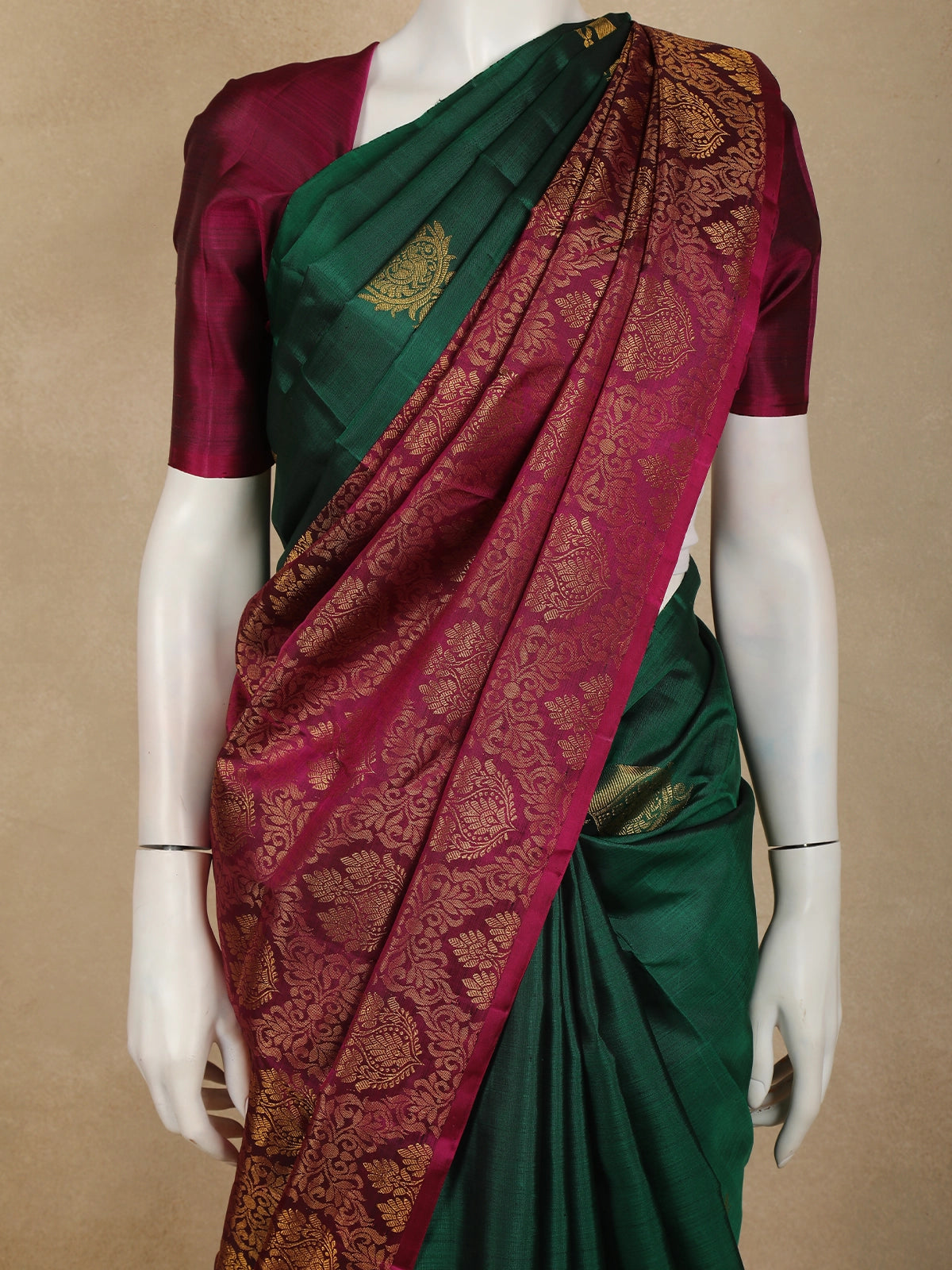 A striking contrast floral border in deep wine maroon, intricately woven with antique gold zari detailing, frames the saree beautifully. The richly designed border adds warmth, grandeur, and a regal finish, perfectly complementing the dark green base. The coordinated pallu continues the ornate floral weaving, completing the look with traditional finesse.