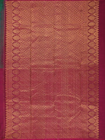 Crafted from pure Kanchipuram silk, the saree features delicate floral woven motifs subtly integrated into the body, adding depth and texture while maintaining an elegant, understated appeal. The natural sheen of the silk enhances the richness of the green, giving the saree a smooth, structured drape.