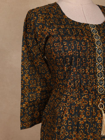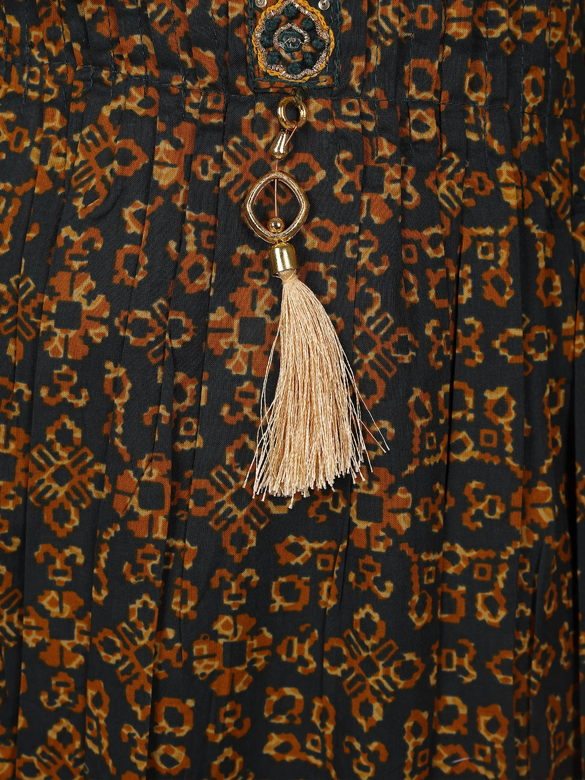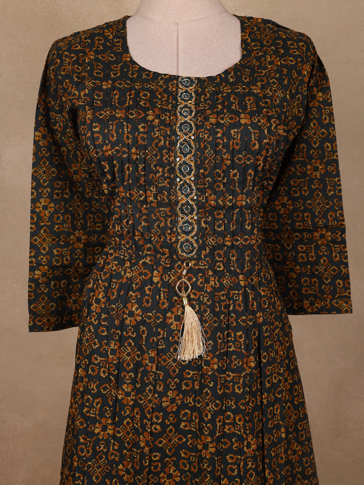 Step into timeless elegance with this dark green cotton salwar suit, adorned with intricate geometric block prints in earthy brown hues. The kurta features a round neckline with a delicately embroidered placket enhanced with sequins and finished with a charming tassel detail, adding a hint of festive allure. Designed in a straight cut silhouette with fine pleats, it ensures both comfort and style. The look is completed with a coordinating printed dupatta framed with contrasting striped borders, creating a graceful and refined ensemble.