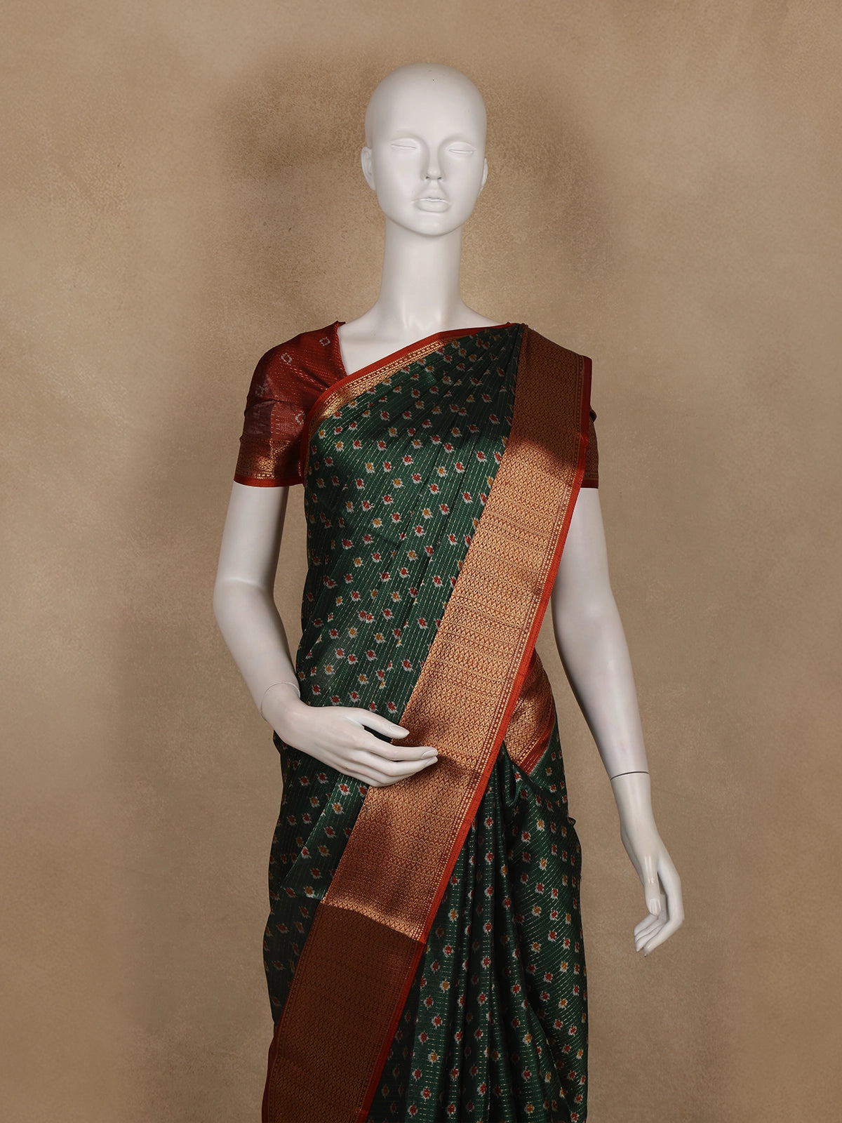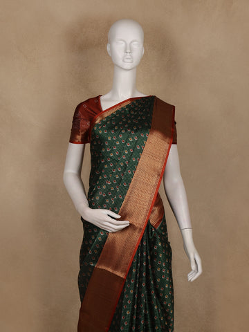 Step into traditional elegance with this Dark Green Pochampally Ikat Design Cotton Saree, a beautiful fusion of heritage weaving and timeless appeal. The deep green body is intricately adorned with traditional Pochampally Ikat motifs, giving it a sophisticated ethnic charm. The striking contrast red zari border and pallu add a regal touch, infusing the ensemble with festive vibrance and grandeur.