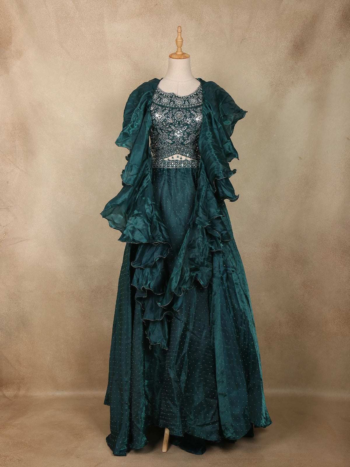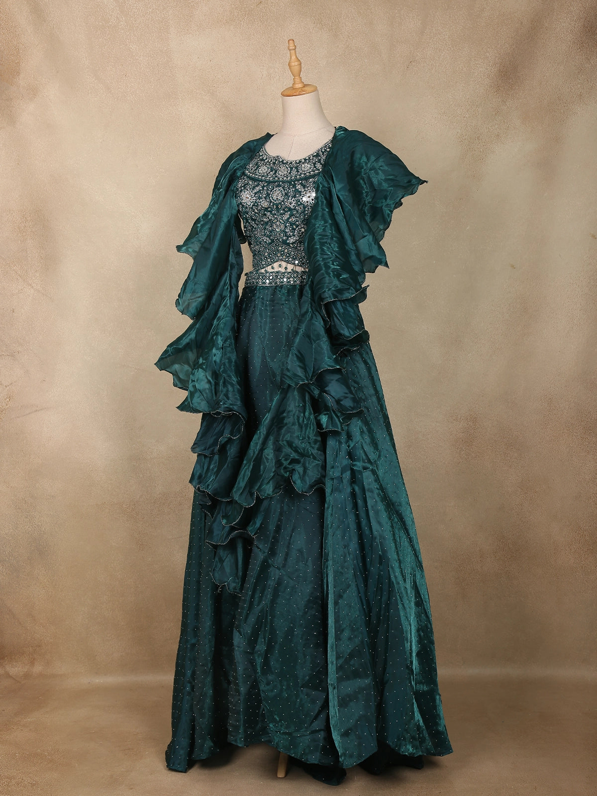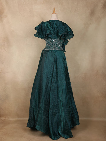 Dark Green Sequins Embroidered Design Organza Ruffle Lehenga with Cape Dupatta