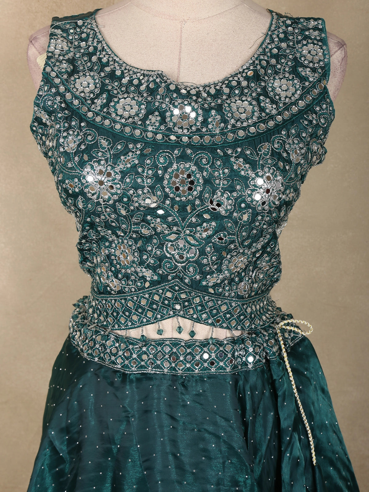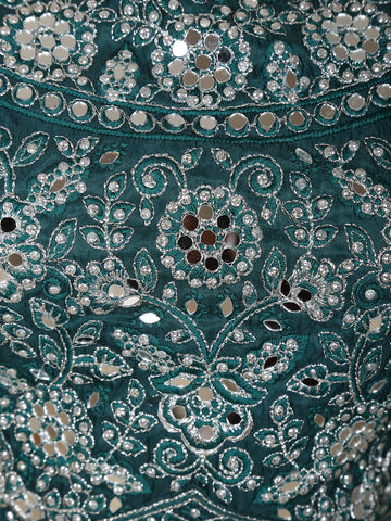 The voluminous lehenga is adorned with scattered sequin motifs that lend a celestial glow, complementing the dark green hue reminiscent of royal sophistication. Whether it’s a bridesmaid’s celebration or a glamorous evening gala, this outfit ensures you steal the spotlight with effortless grace.