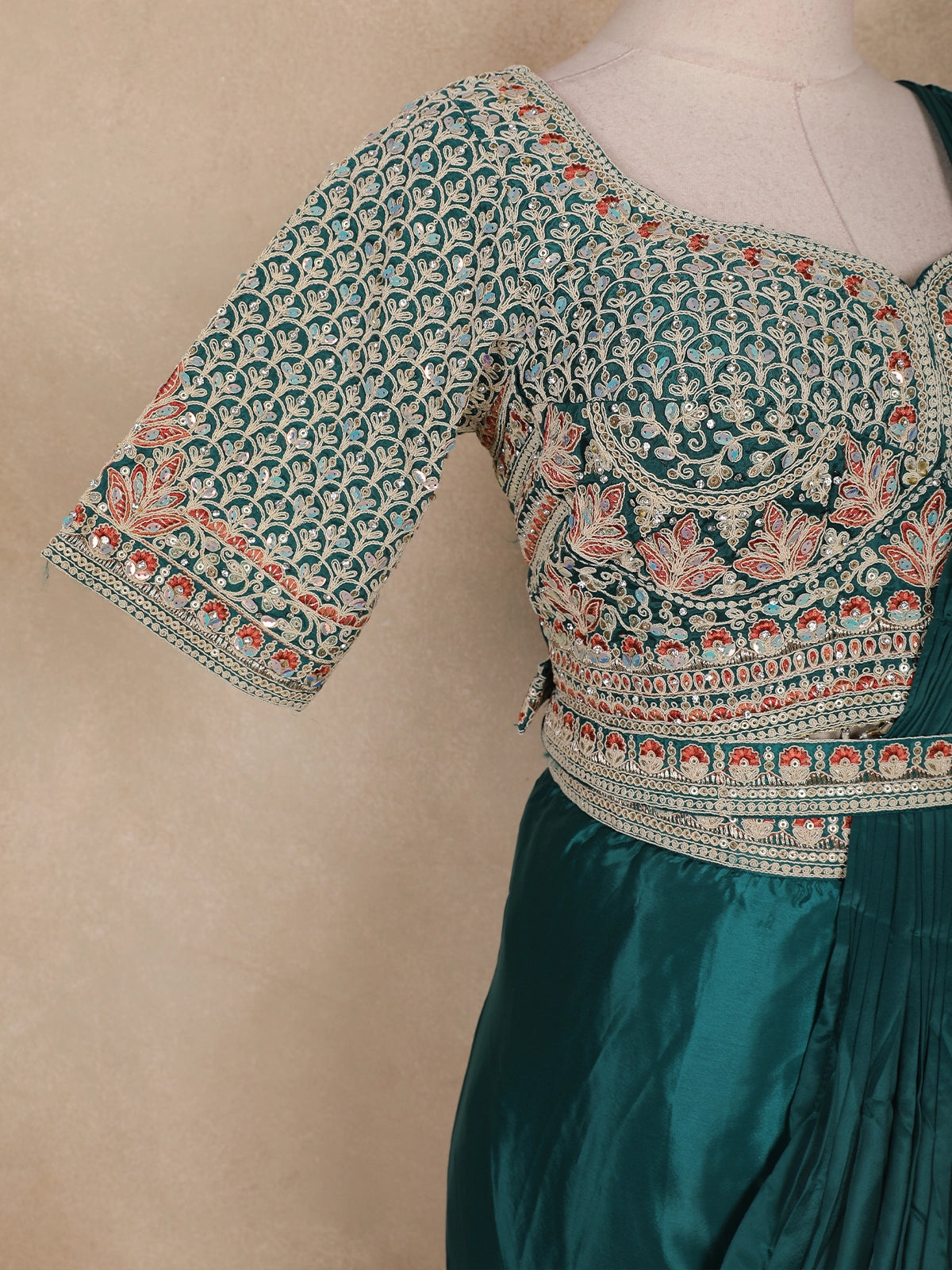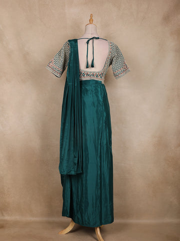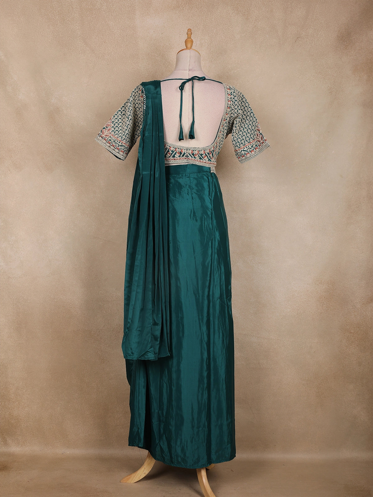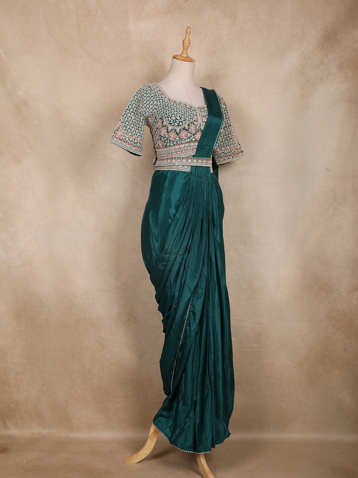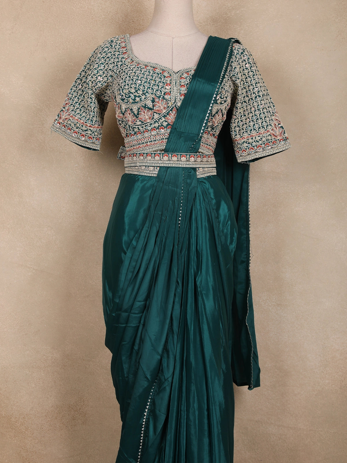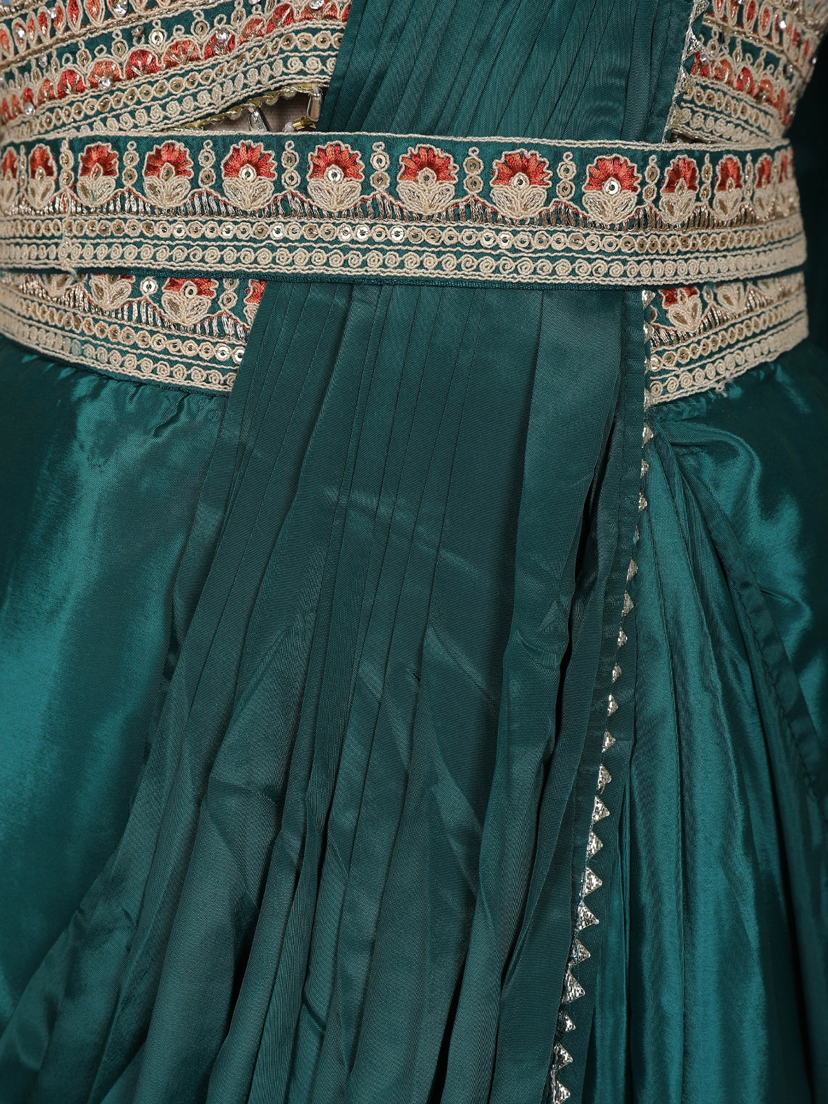 Dark Green Solid Design Satin Ready To Wear Ruffle Saree with Designer Blouse