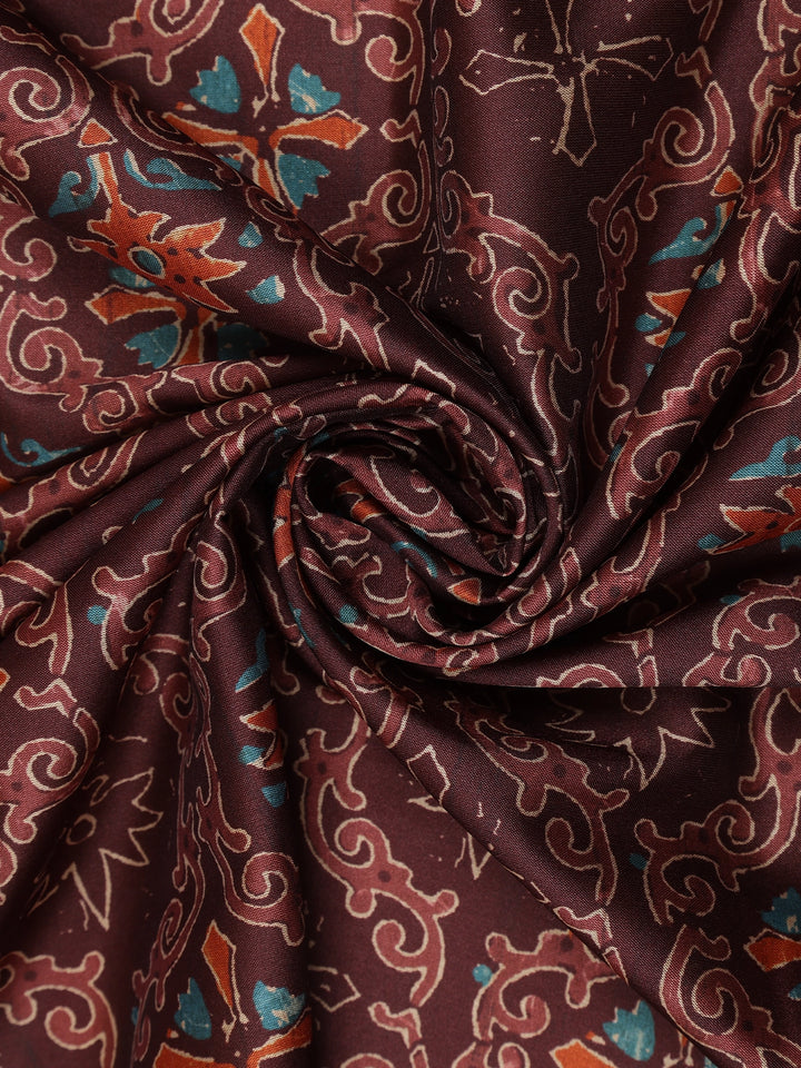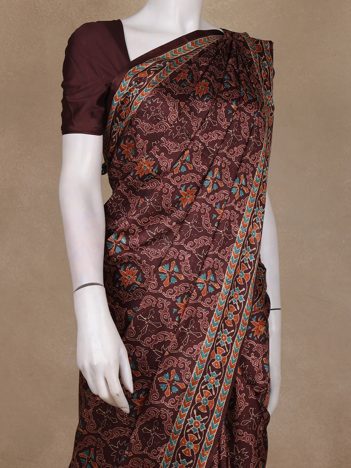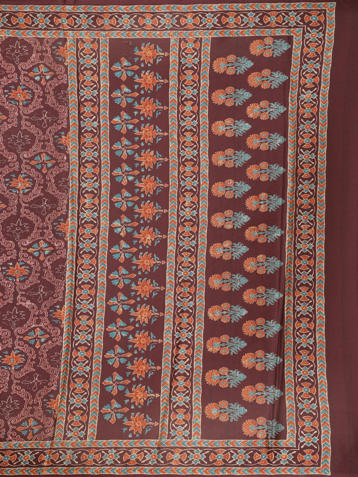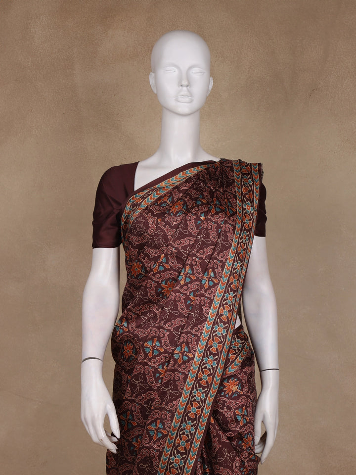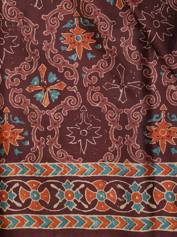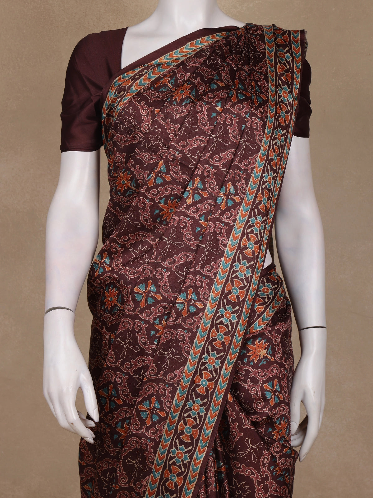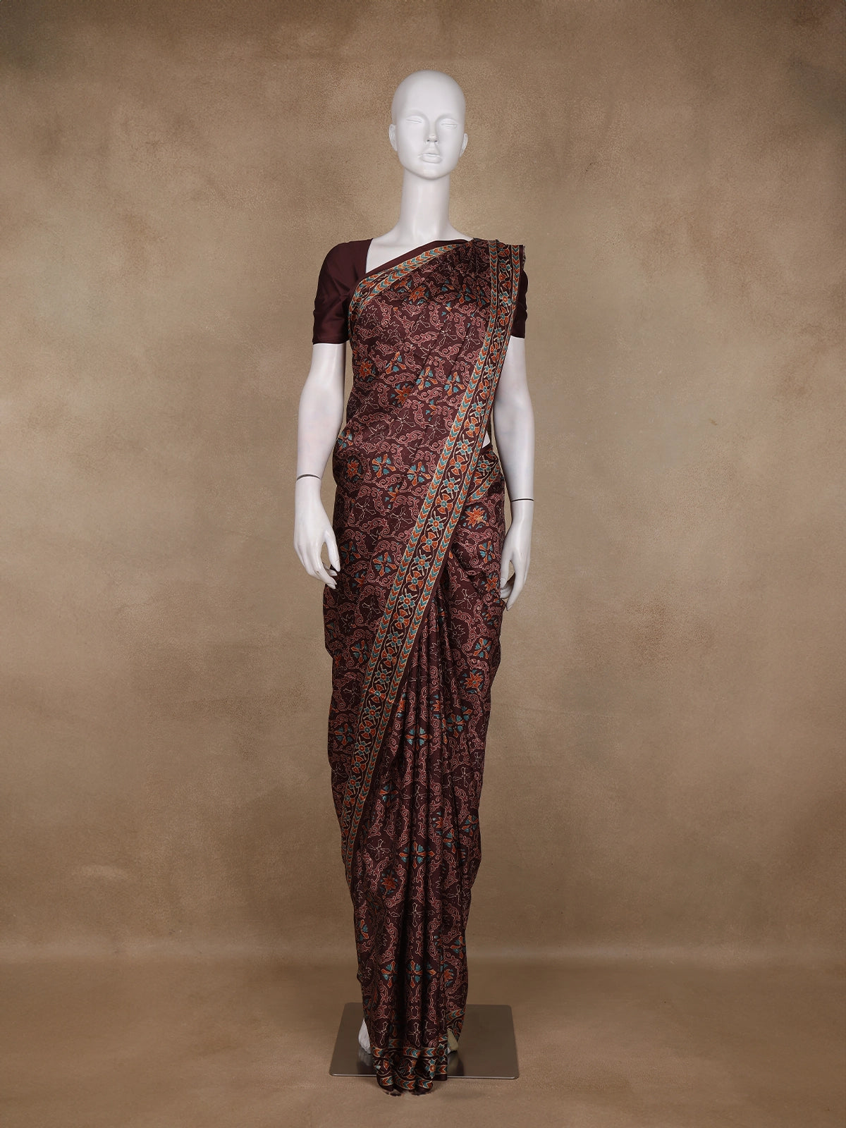 Embrace heritage charm with this stunning dark maroon Tussar saree featuring intricately detailed floral and traditional motifs across the drape. The earthy palette blends beautifully with hints of teal, orange and beige, creating a look that is both artistic and timeless. The saree is elevated with a vibrant contrast designer border showcasing symmetrical floral patterns, adding a refined aesthetic that highlights the silhouette gracefully.