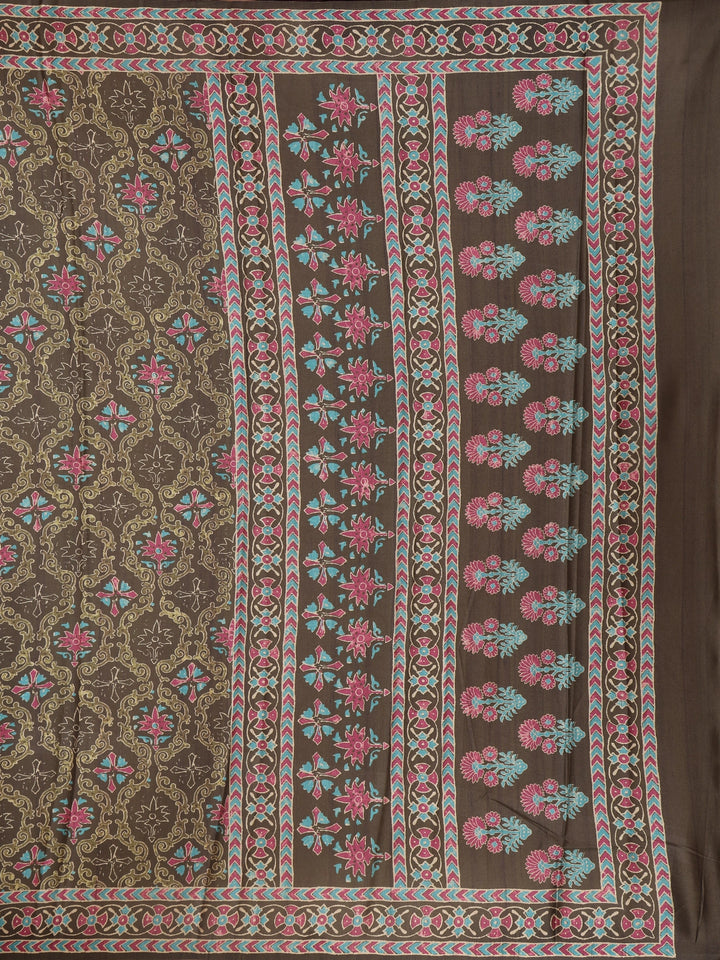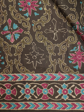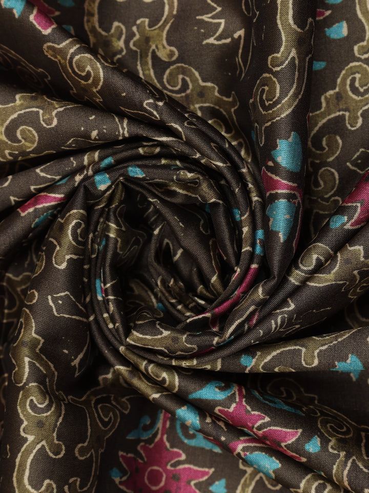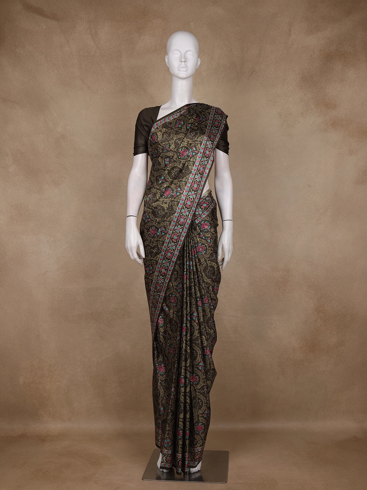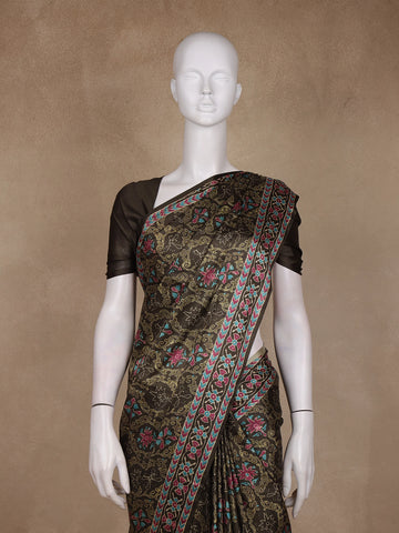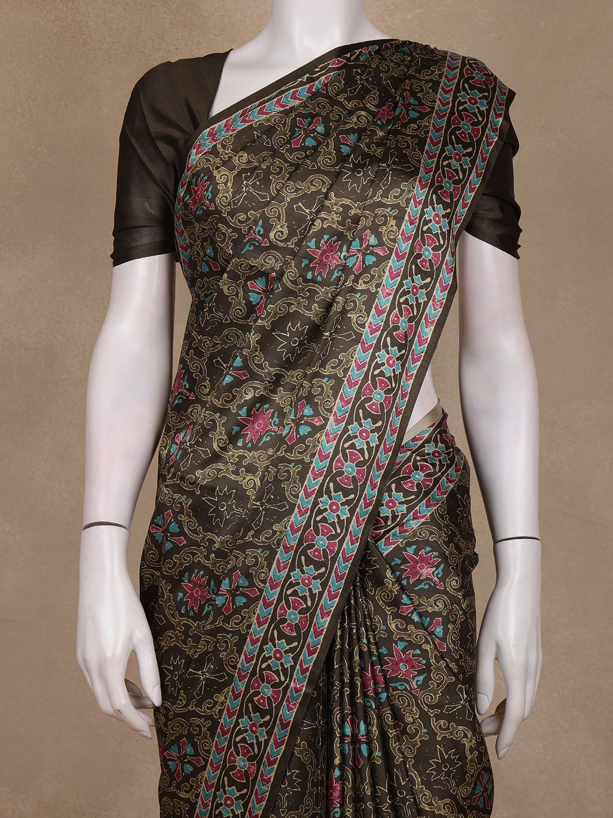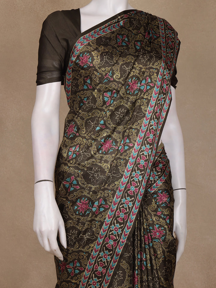 Embrace traditional elegance with this Dark Olive Green Tussar Saree featuring an intricate all-over floral print highlighted by vibrant hues of pink and teal. The saree is adorned with delicate golden vine motifs that add a rich ethnic charm to the drape. A beautifully designed contrast border with geometric and floral patterns enhances the visual appeal and gives a striking finish to the ensemble. The lightweight Tussar fabric ensures graceful fall and effortless comfort, making it a perfect pick for festive occasions, family gatherings, and cultural celebrations. Pair it with traditional jewellery and a complementing blouse to complete your sophisticated ethnic look.