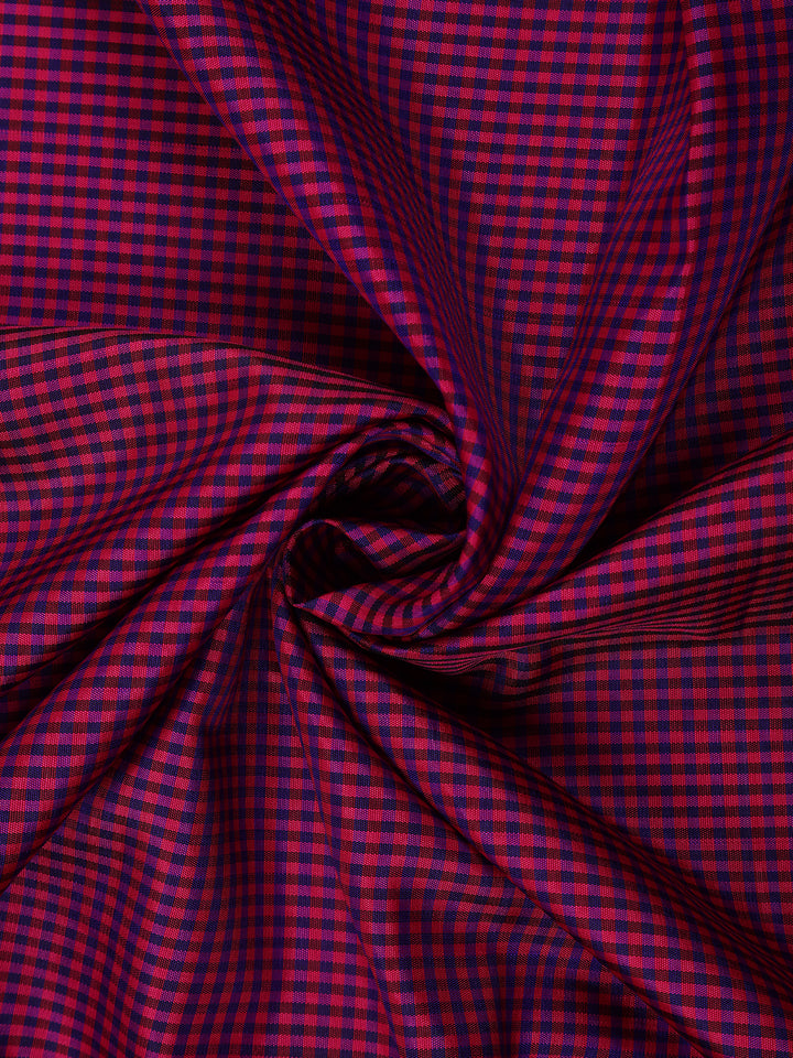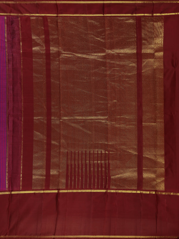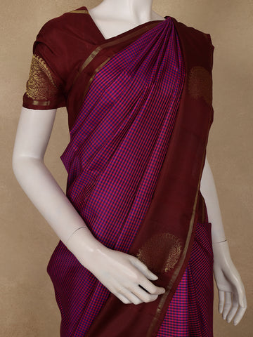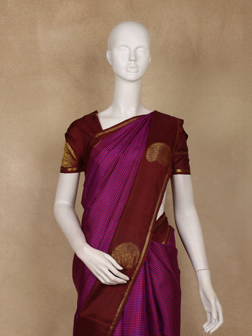 A timeless creation of elegance and heritage, this Dark Pink and Violet Checked Woven Pure Kanchipuram Silk Saree showcases the beauty of traditional craftsmanship. The body features intricate micro-checked patterns in dark pink and violet, balanced by a rich contrast maroon pallu and blouse that radiate sophistication.
