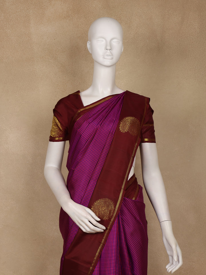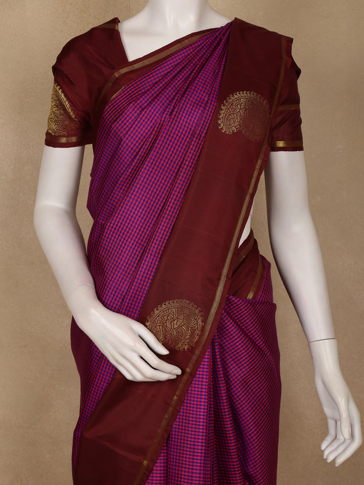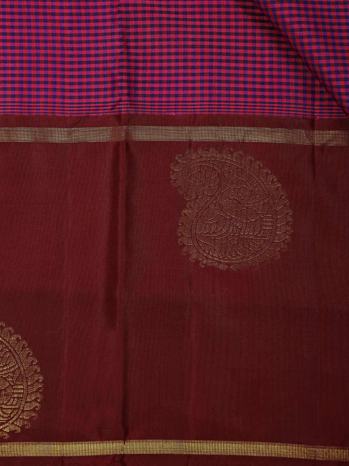 Dark Pink and Violet Checks Woven Pure Kanchipuram Silk Saree