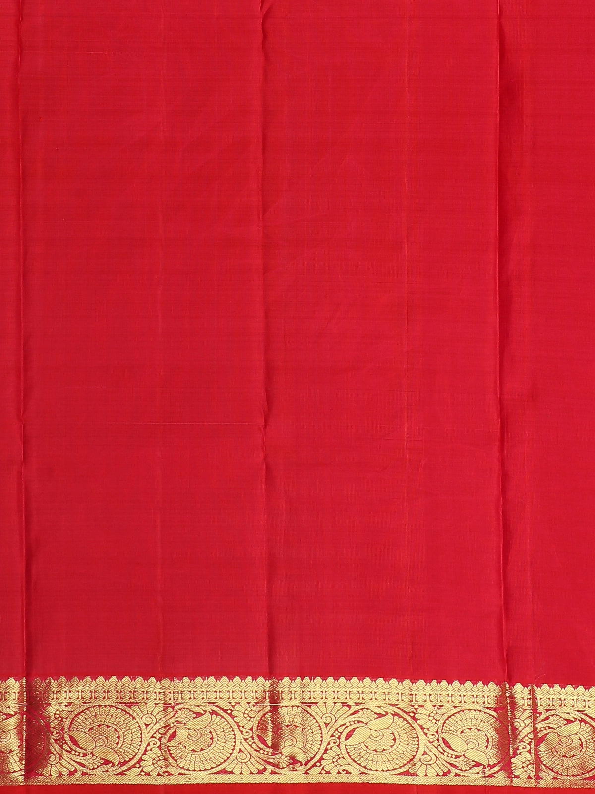 Accentuating its grandeur is a luxurious gold zari border, intricately woven to enhance the saree’s regal appeal. The natural sheen and firm texture of pure Kanchipuram silk ensure a flawless drape, giving the saree a structured yet graceful fall that elevates every movement.