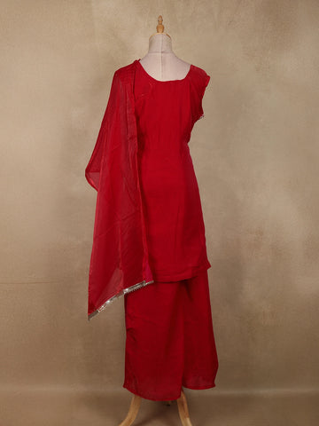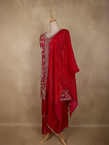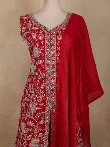 Crafted in airy organza fabric, the outfit offers a lightweight feel with a soft, flowing drape that moves effortlessly. The matching palazzo pants provide a modern silhouette with comfortable ease, perfectly complementing the ornate kurta. A coordinating dupatta, finished with subtle embellished edging, completes the ensemble with refined charm.