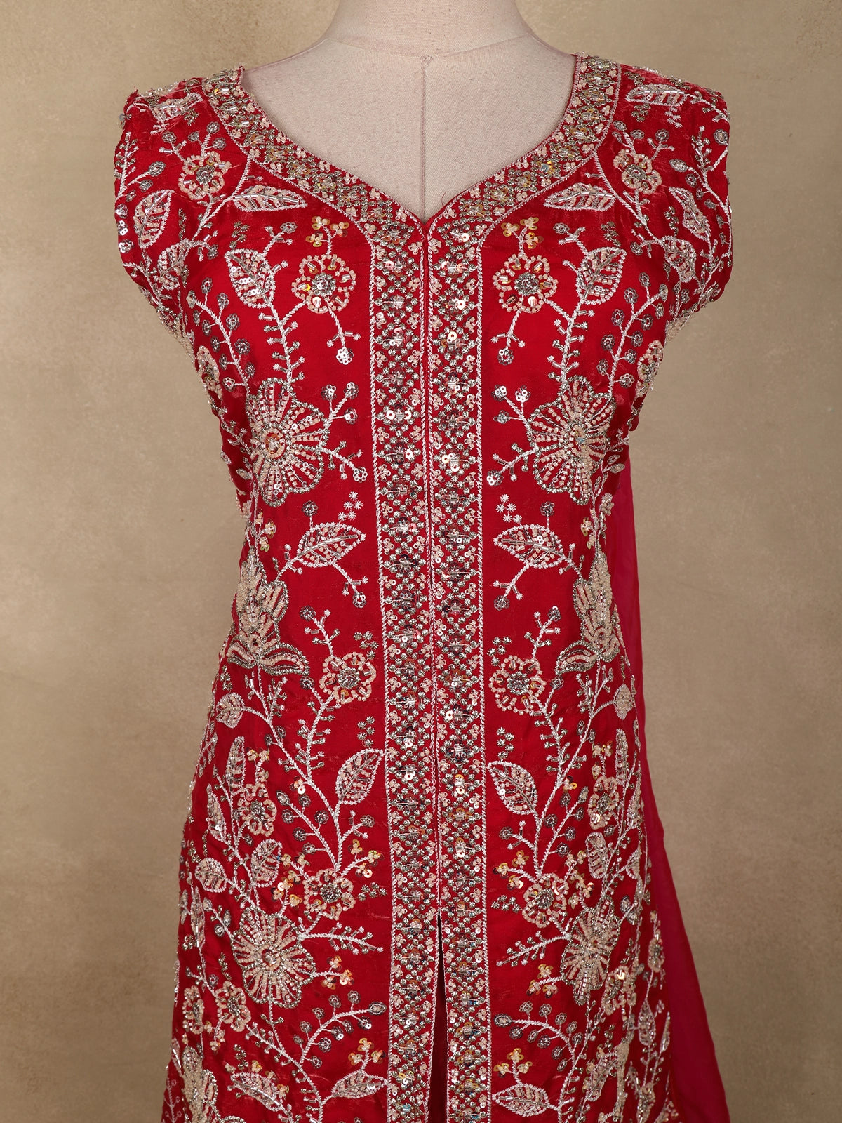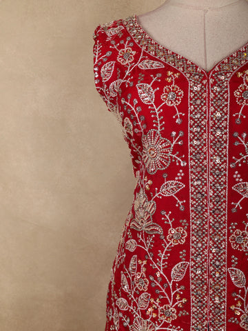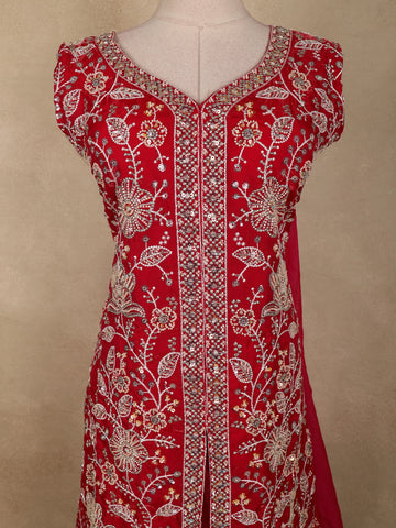 This Dark Pink Organza Palazzo Suit is a striking expression of festive elegance, designed to stand out with its rich colour and intricate detailing. The kurta showcases exquisite floral bead embroidery, delicately arranged to create a refined shimmer that enhances the deep pink base. The beautifully embellished neckline and borders add a touch of grandeur while maintaining a graceful, balanced look.