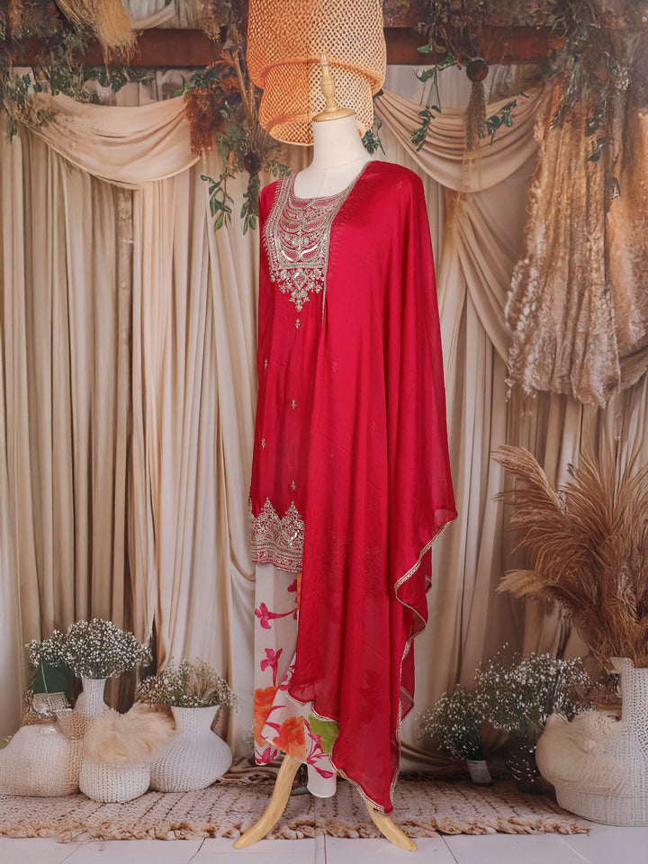 The outfit is paired with vibrant floral-printed palazzo pants in contrasting hues, offering a refreshing and contemporary twist to the traditional silhouette. A matching chiffon dupatta with delicate embroidery and shimmer border completes the look, giving it a polished, festive-ready finish. Perfect for semi-formal occasions, festive gatherings, or elegant daytime celebrations, this set captures effortless beauty with a touch of modern flair.