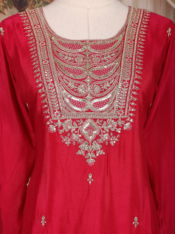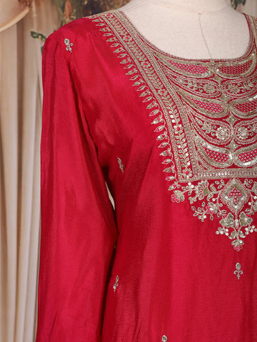 Dark Pink Floral Embroidered Design Chiffon Palazzo Suit