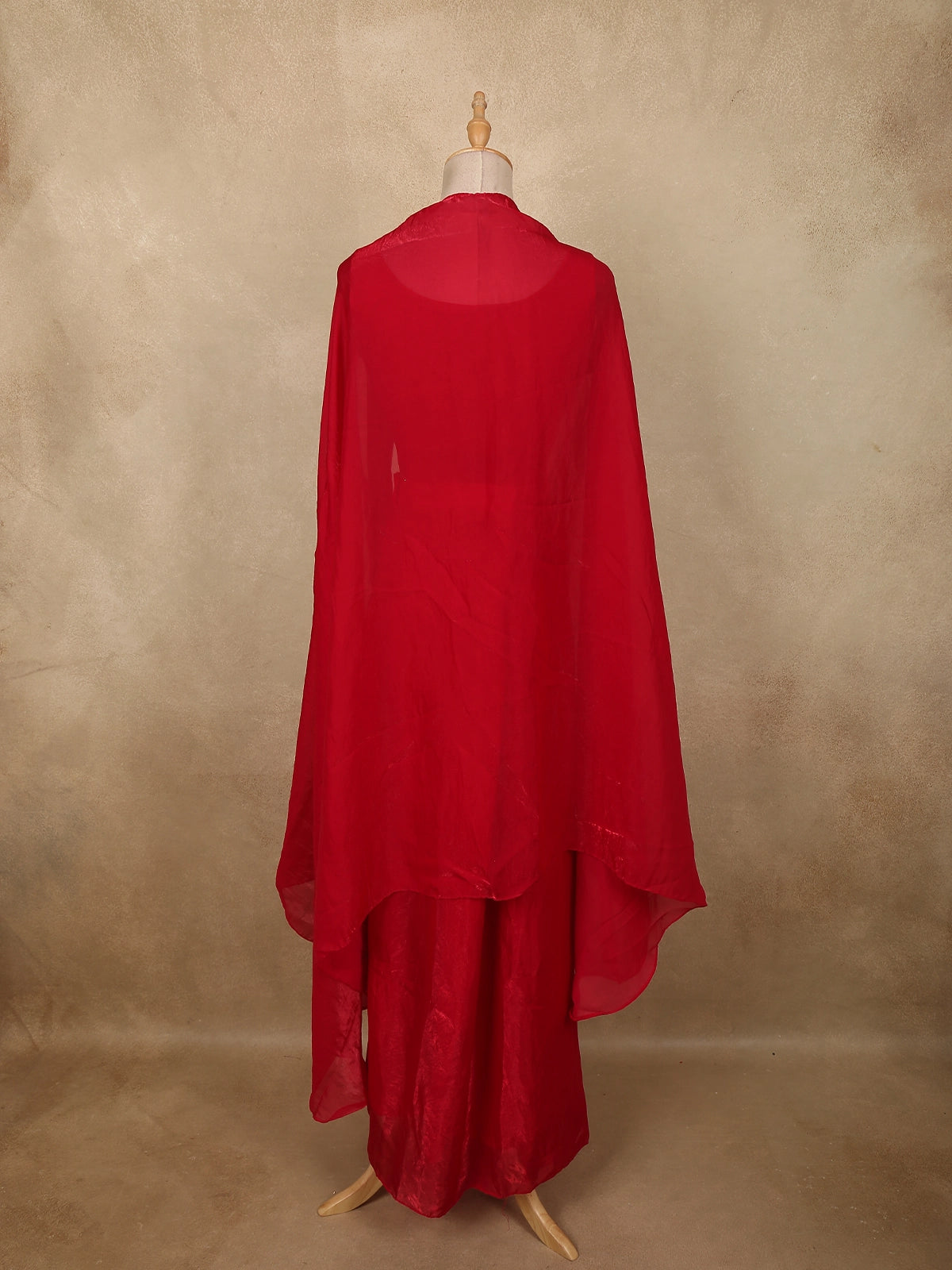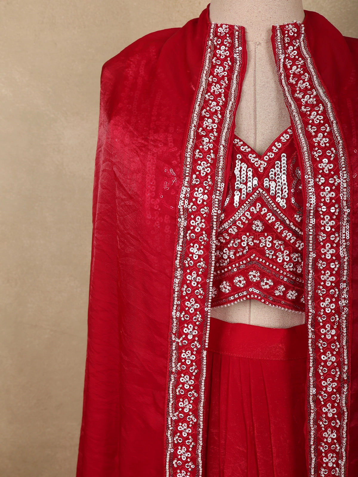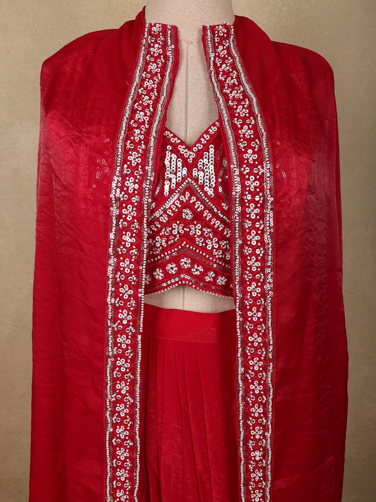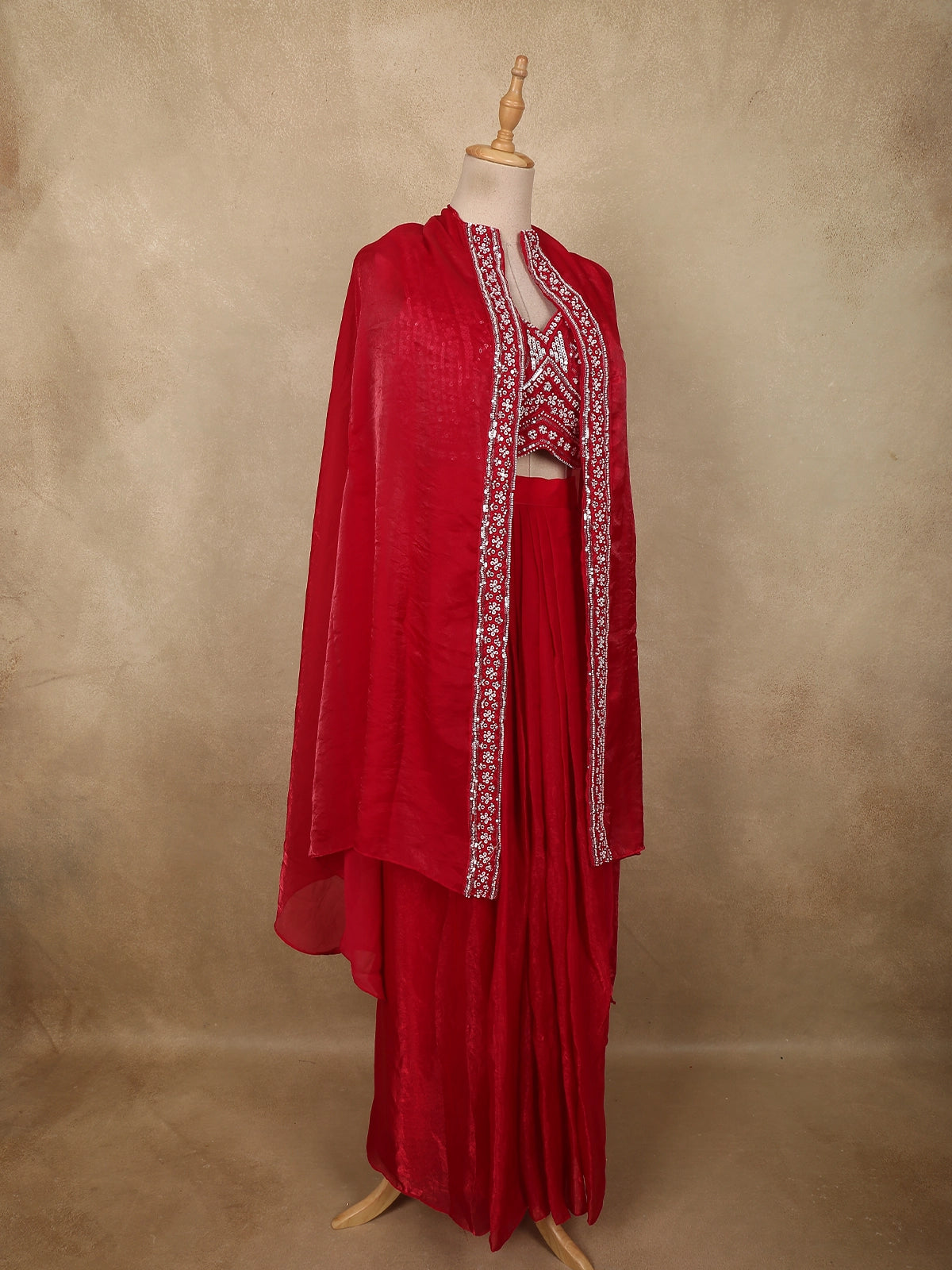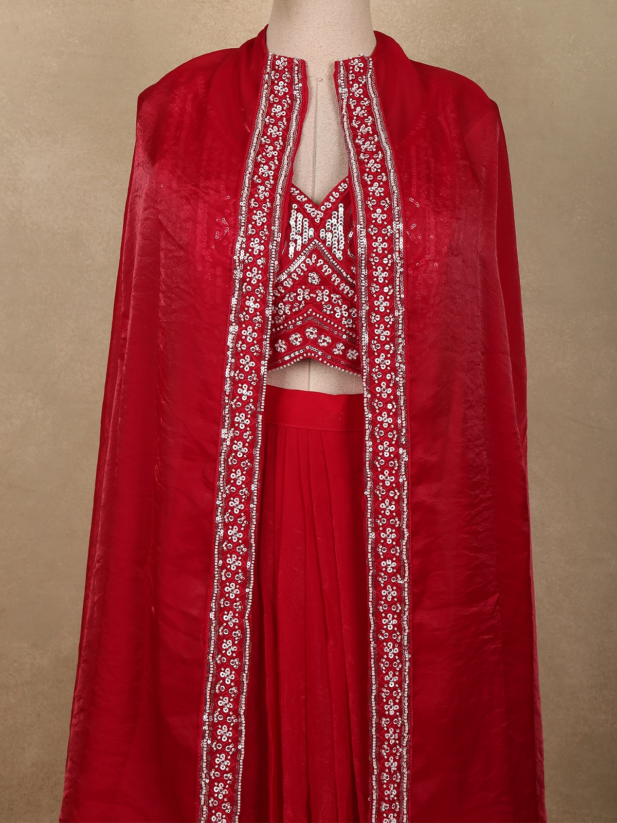Paired with the top is a flowing organza skirt that offers a graceful silhouette with soft movement. The lightweight organza fabric provides an elegant drape while maintaining a structured yet airy look, giving the outfit a modern festive charm.