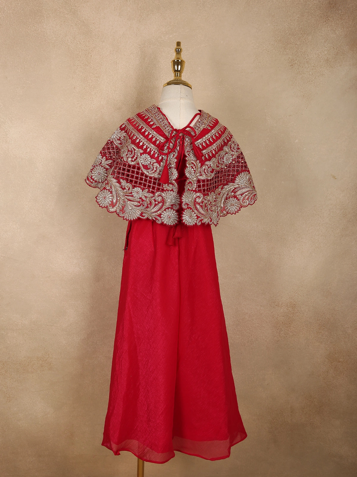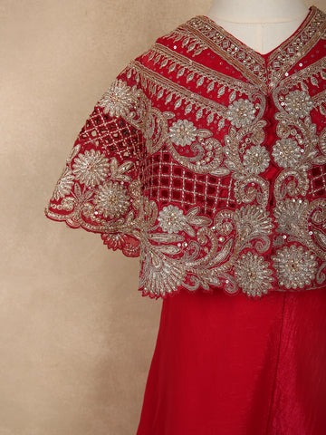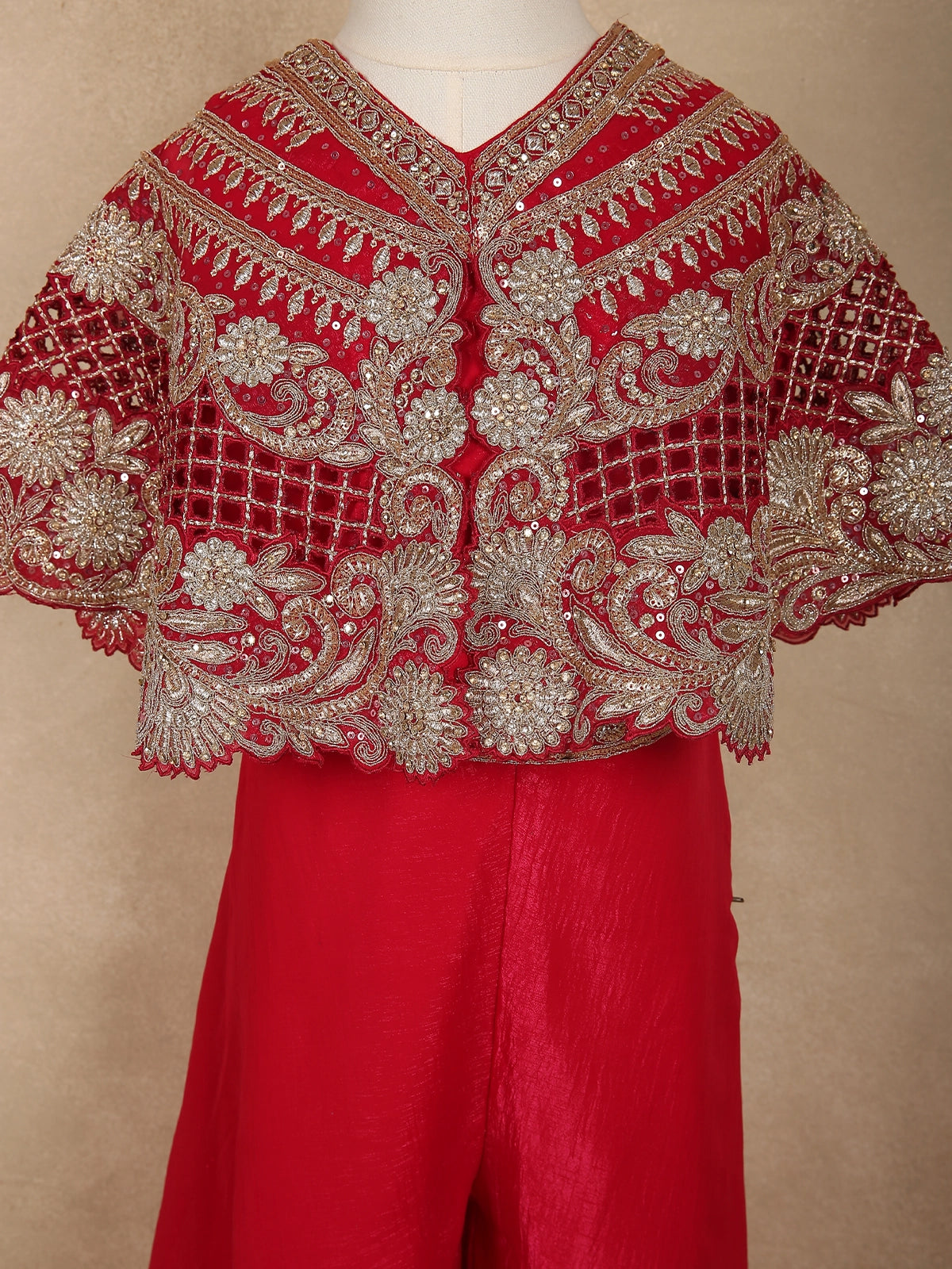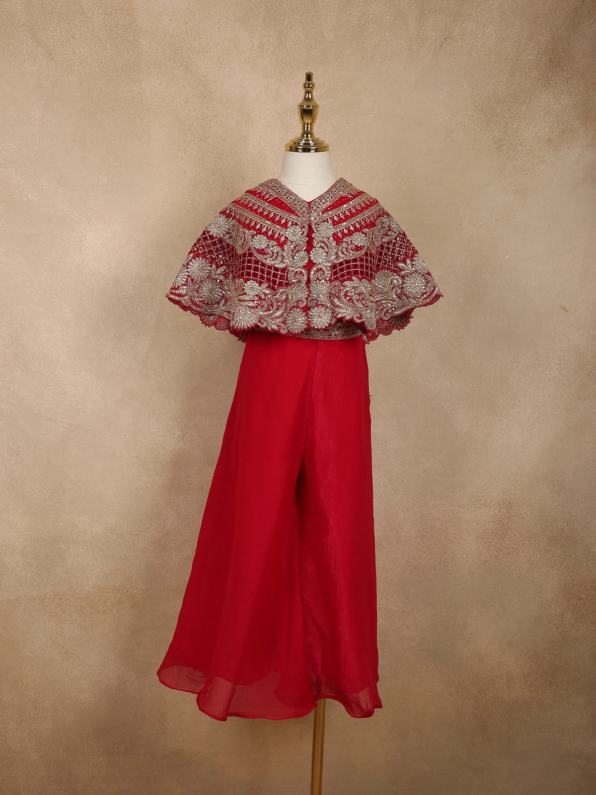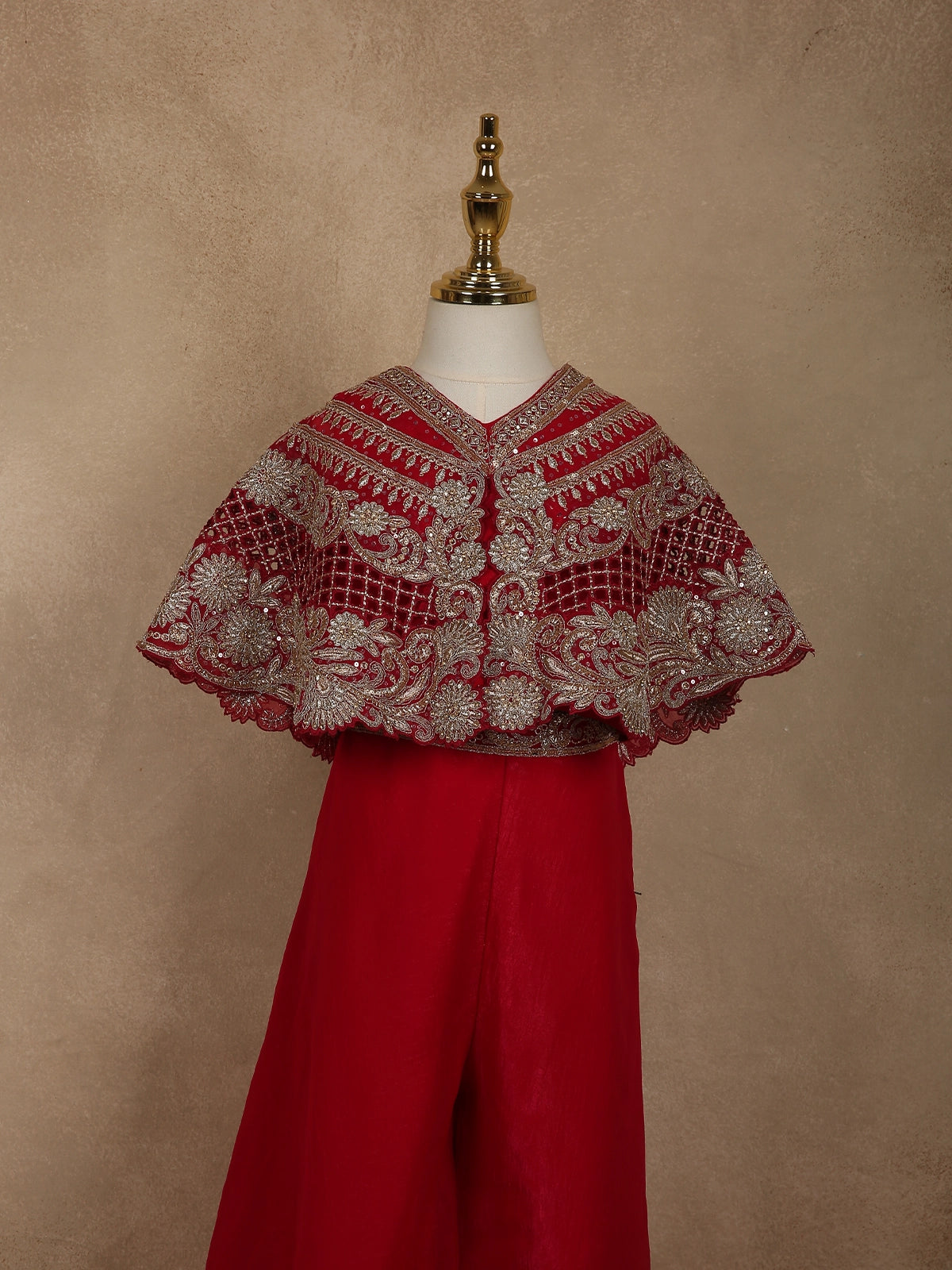 Dark Pink Floral Zari Embroidered Design Organza Kids Palazzo Suit with Cape