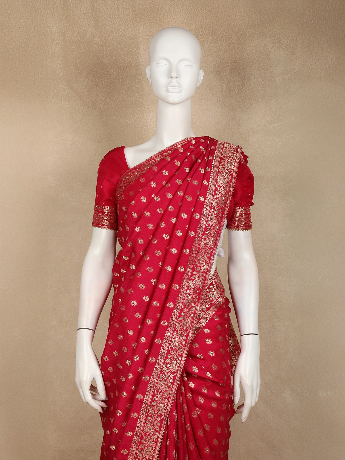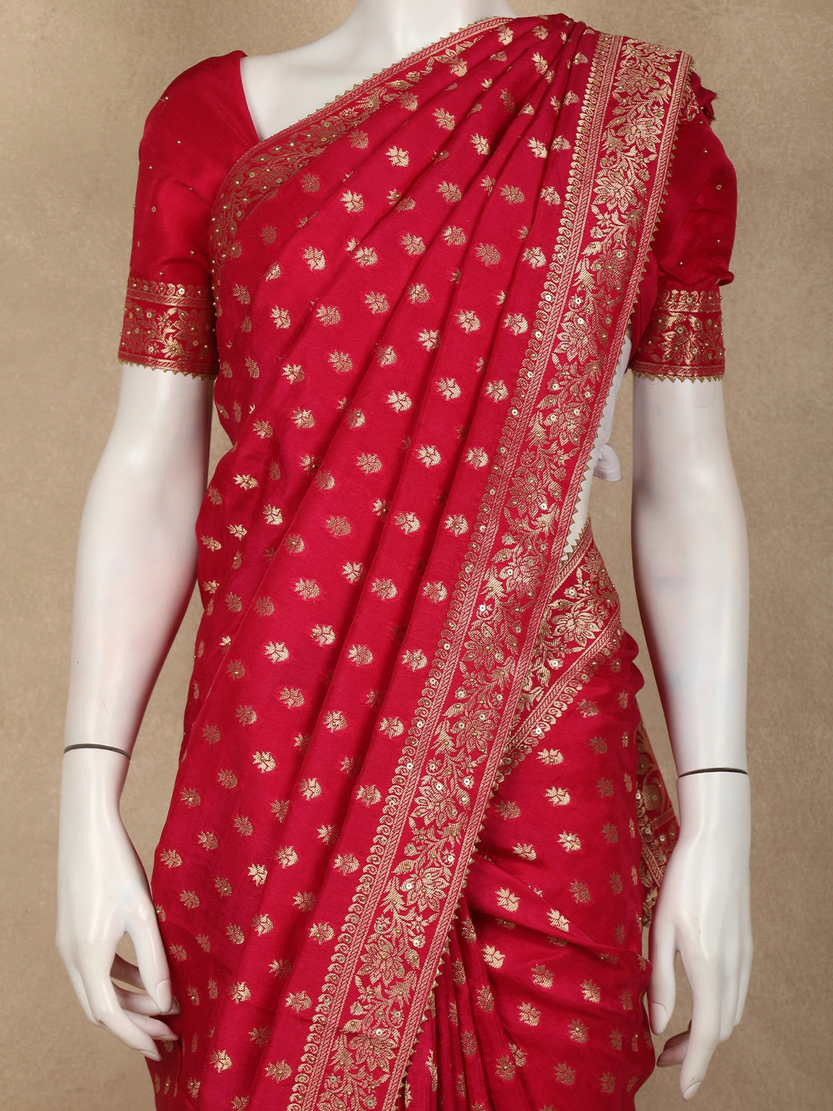 The body is beautifully adorned with delicate floral zari woven motifs, evenly placed across the dark pink base to create a refined and sophisticated look. Highlighting the saree is an intricately crafted designer zari border, adding richness and definition to the drape. The pallu is richly detailed with ornate floral zari weaving, reflecting authentic Banarasi craftsmanship and elevating the overall elegance of the saree.