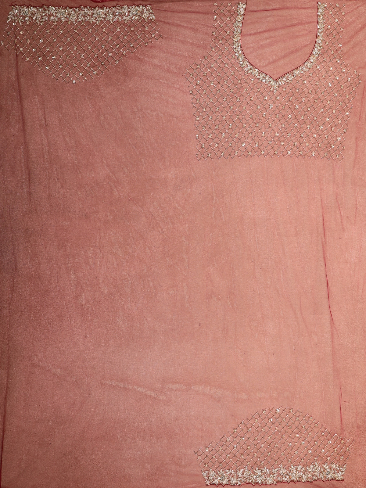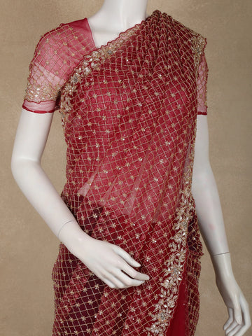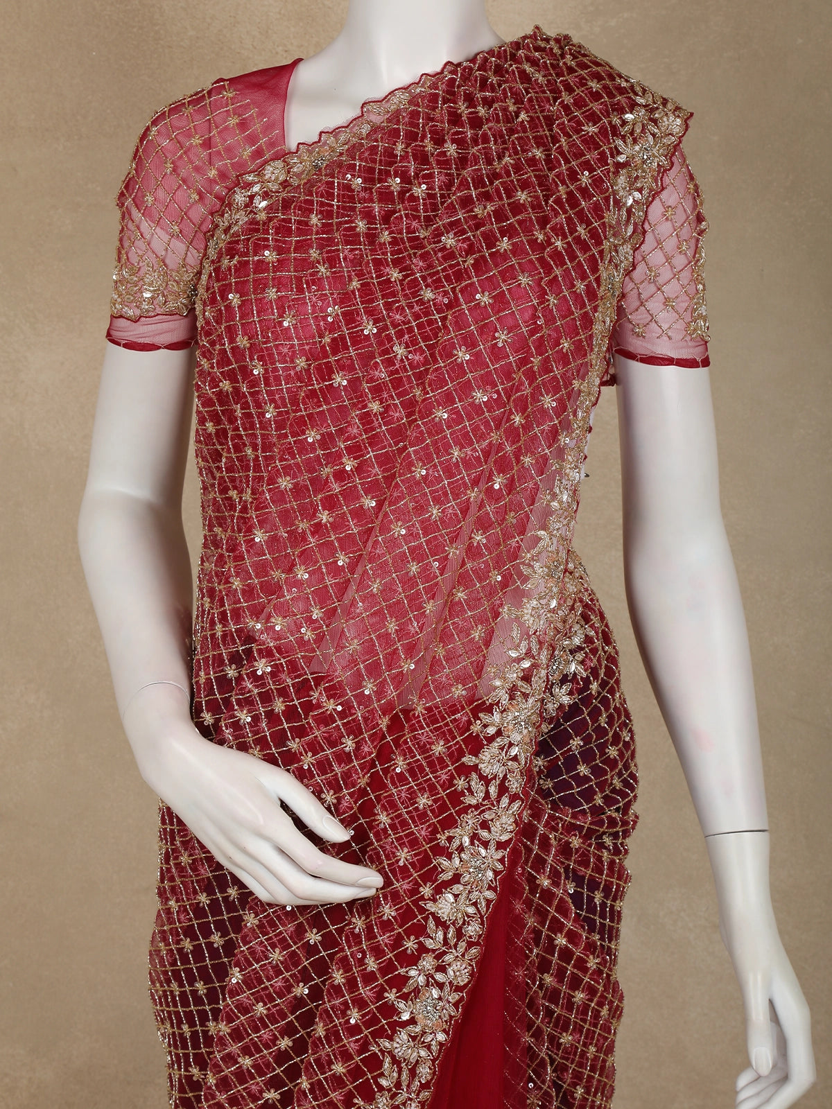 The deep dark pink hue adds richness and depth, while the intricate embellishments catch the light beautifully with every movement. A finely embroidered border enhances the silhouette, lending structure and a couture-like appeal to the drape. The sheer texture balances the heavy work, resulting in a look that is both luxurious and graceful.