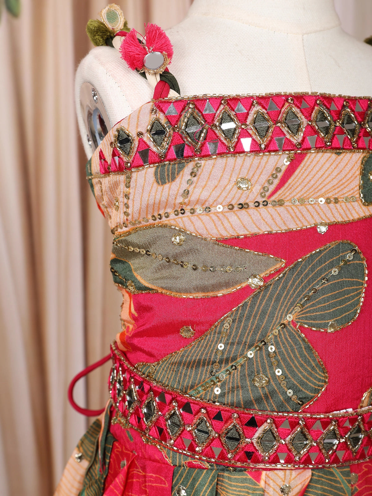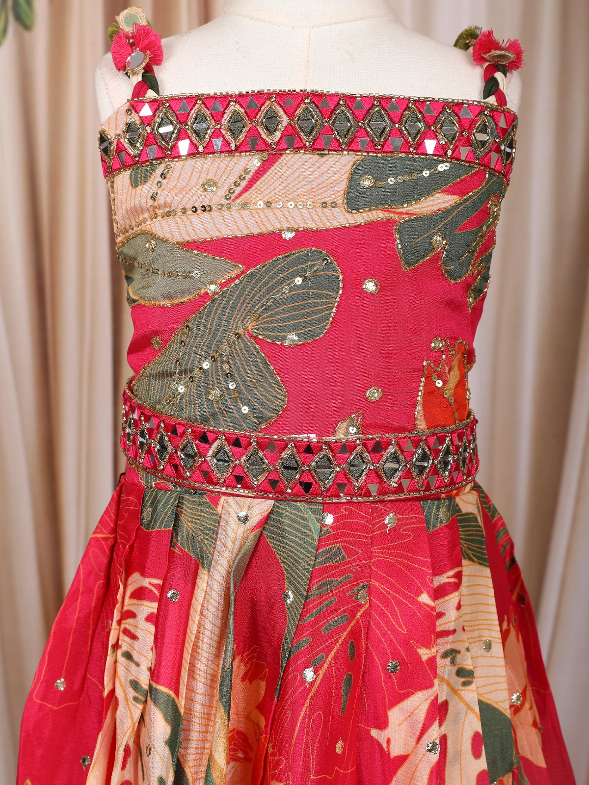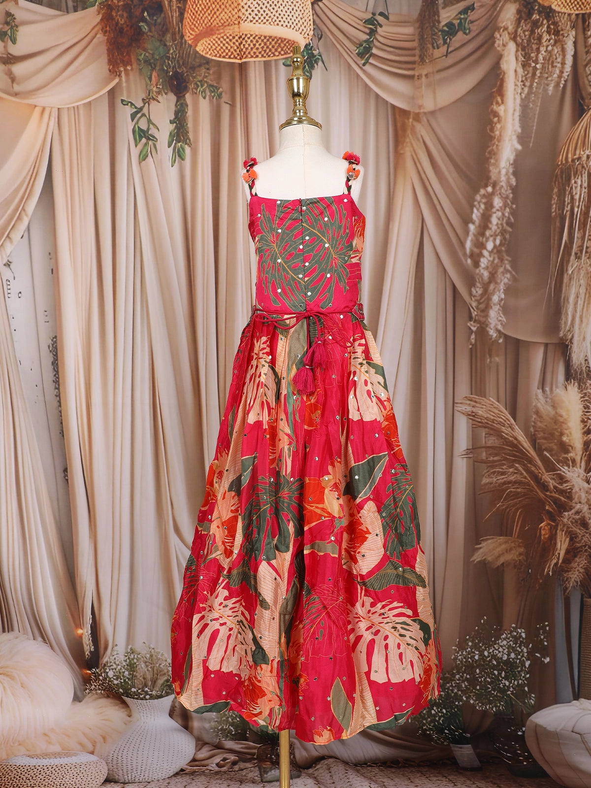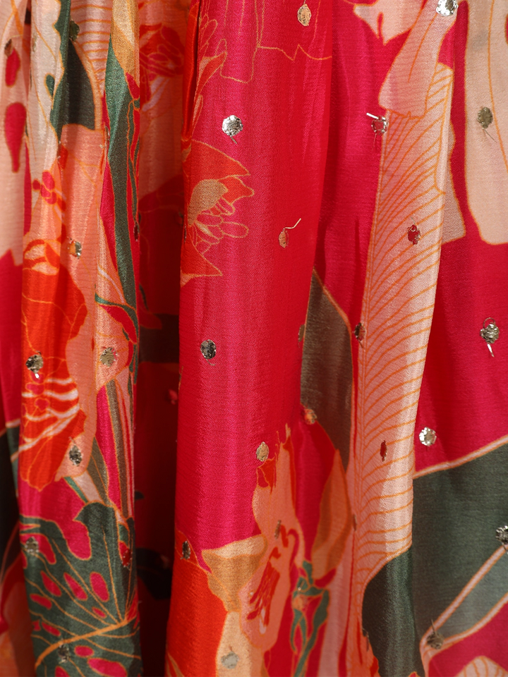 Make your little one shine in this delightful Dark Pink Crepe Silk Kids Gown, designed to blend elegance with playful charm. Crafted from smooth and lightweight crepe silk fabric, this gown features an eye-catching leaf print design that adds a refreshing, nature-inspired touch to its rich pink hue.