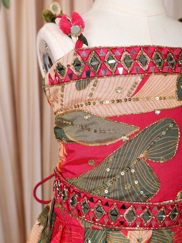Dark Pink Leaf Printed Design Crepe Silk Kids Gown
