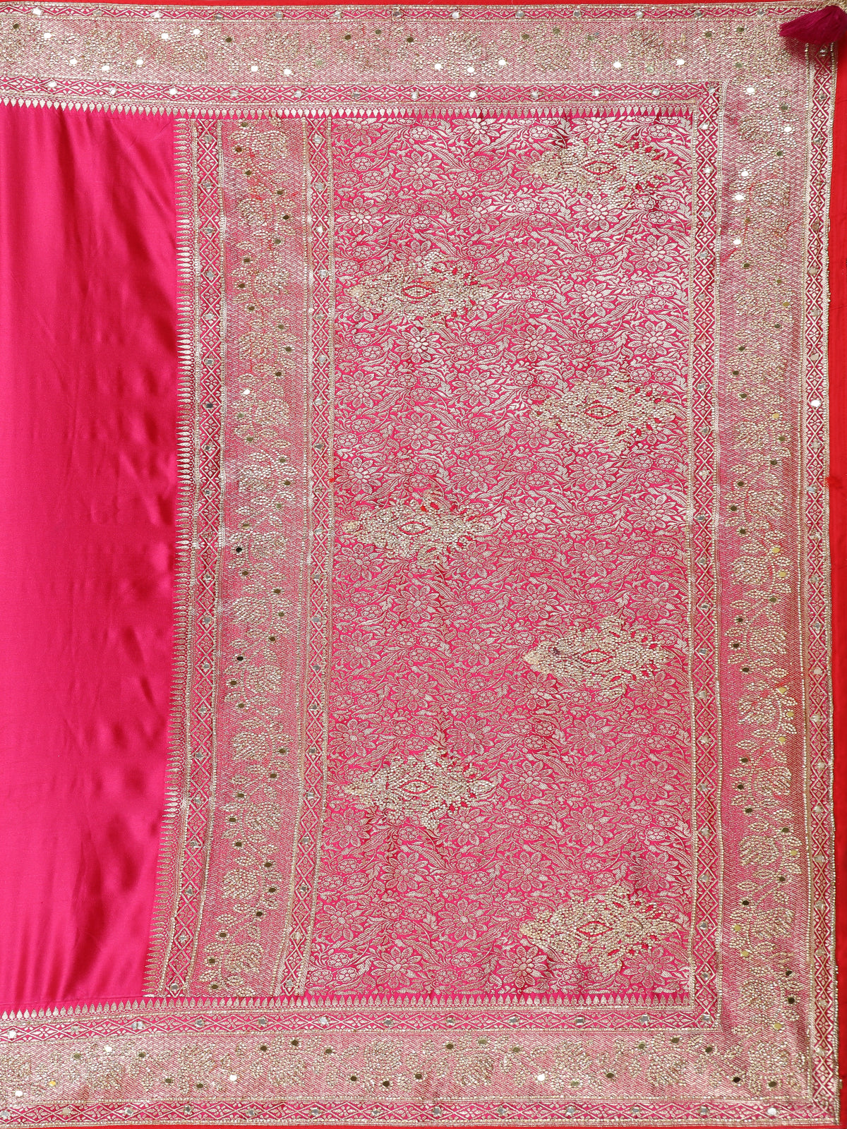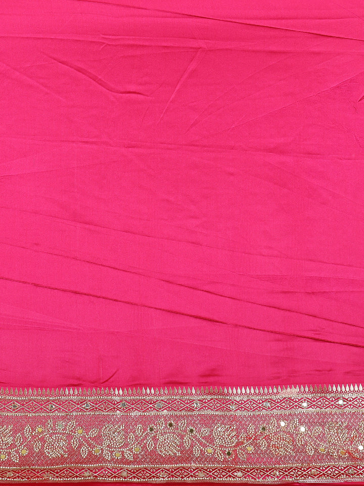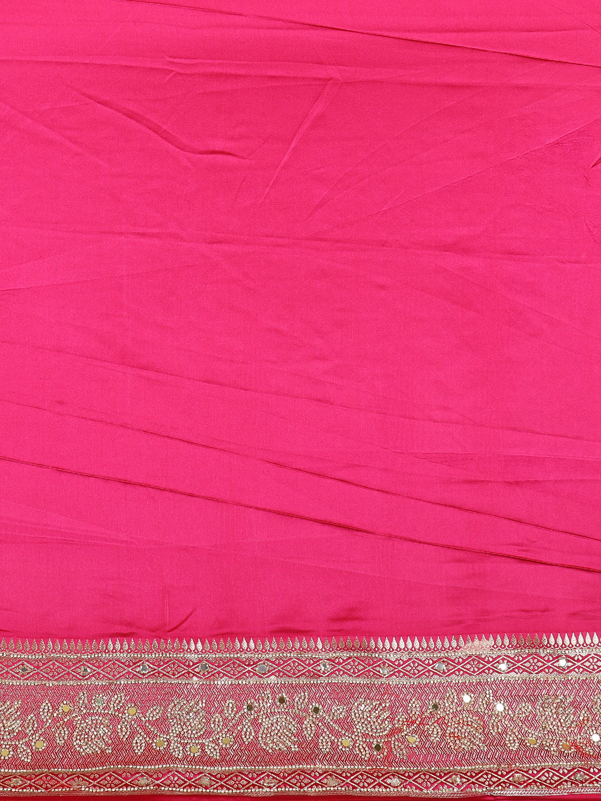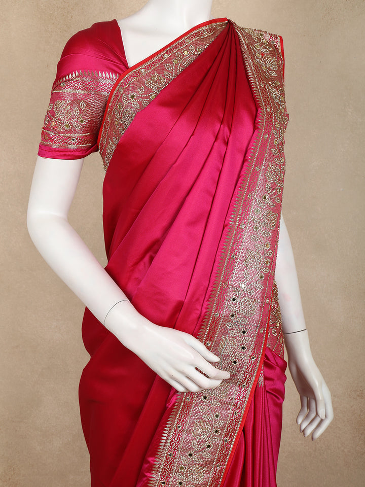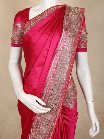 Elevate your ethnic wardrobe with this graceful Dark Pink Satin Saree featuring a smooth, lustrous finish that exudes luxury and sophistication. The saree is enhanced with a beautifully crafted designer border, adding a refined touch of shimmer to the drape. Lightweight and elegant, it pairs perfectly with festive and celebratory occasions.
