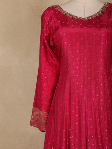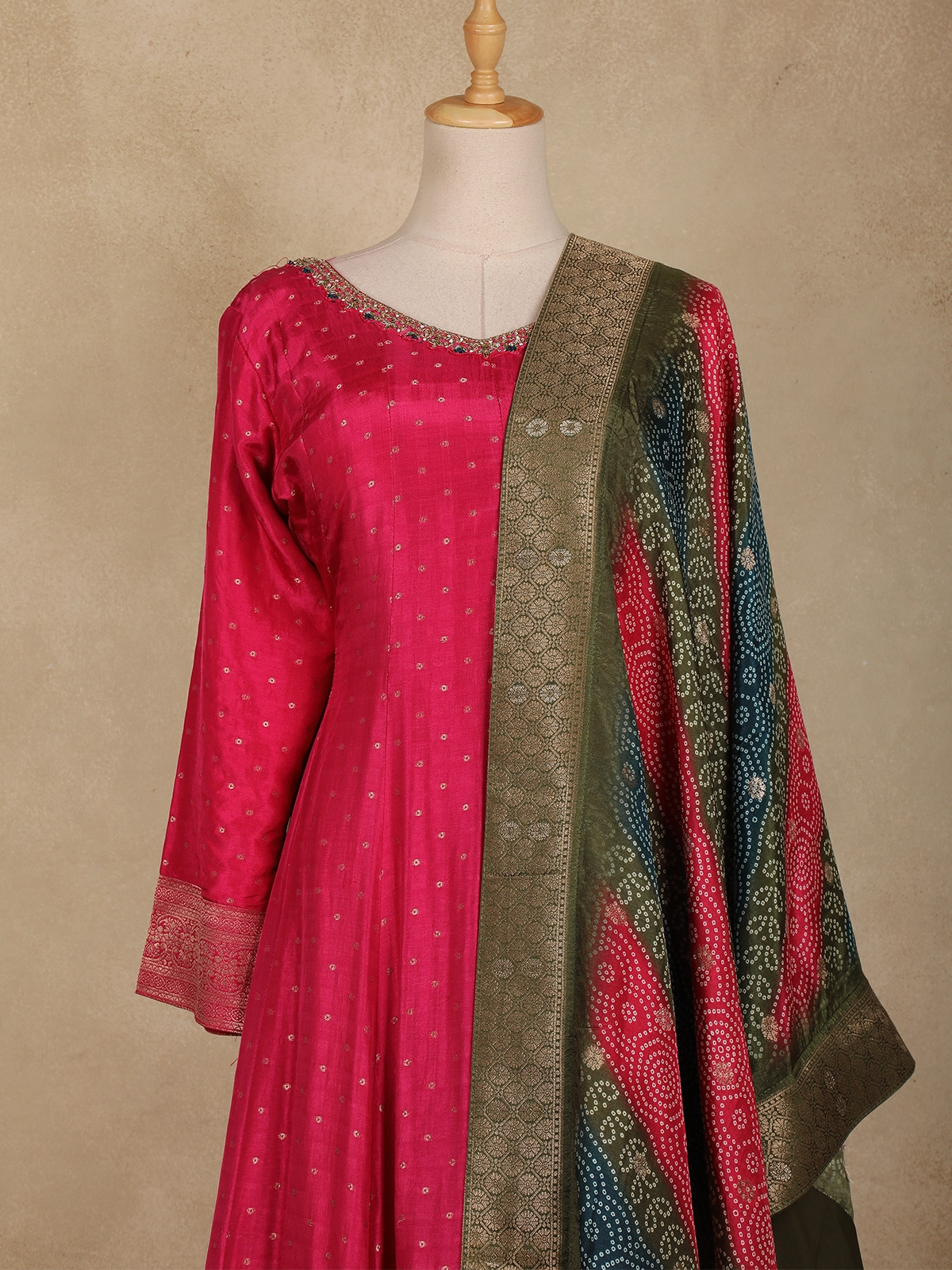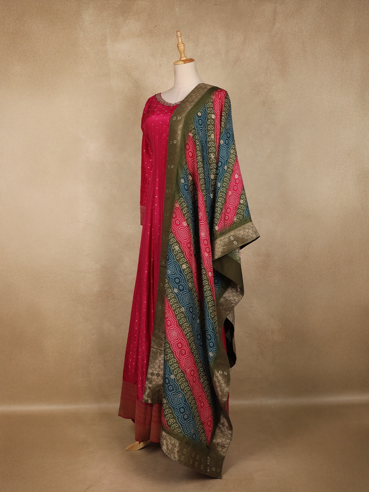 Exuding festive elegance and timeless charm, this Dark Pink Stone Embellished Design Silk Gown with Multicolor Dupatta is crafted to make a graceful statement at special occasions. Made from luxurious silk fabric, the gown features a rich dark pink hue adorned with delicate stone embellishments and subtle self-pattern detailing, adding a refined shimmer and texture to the ensemble.