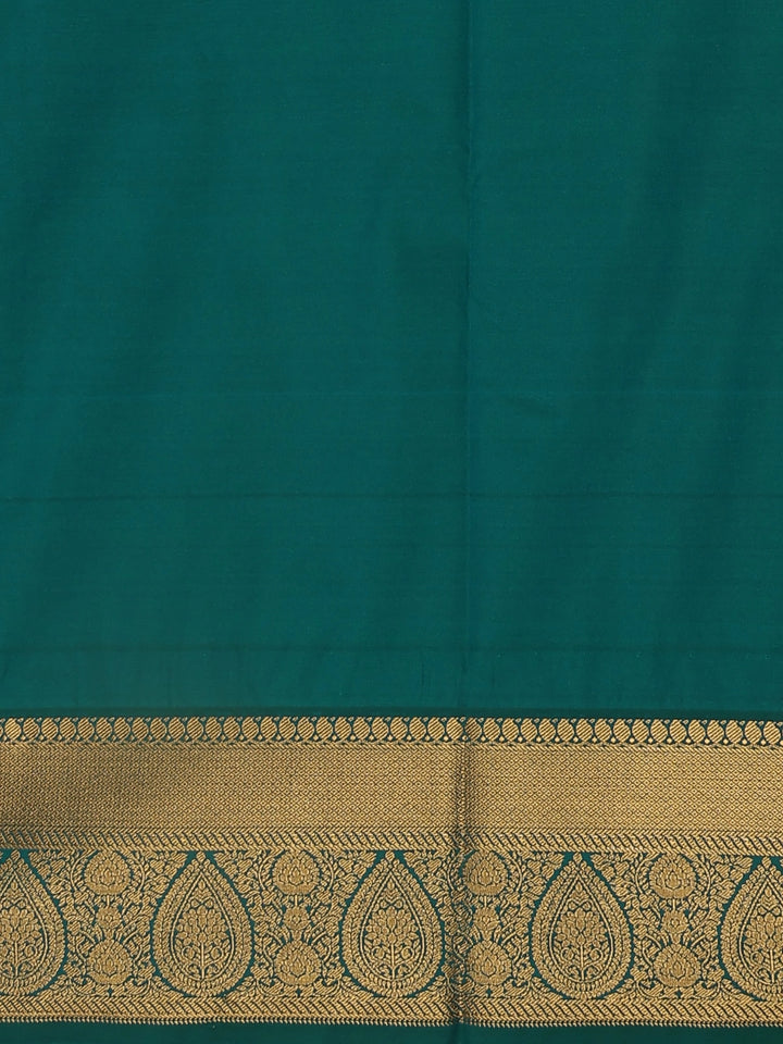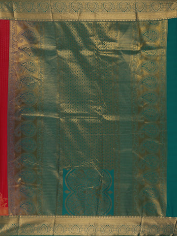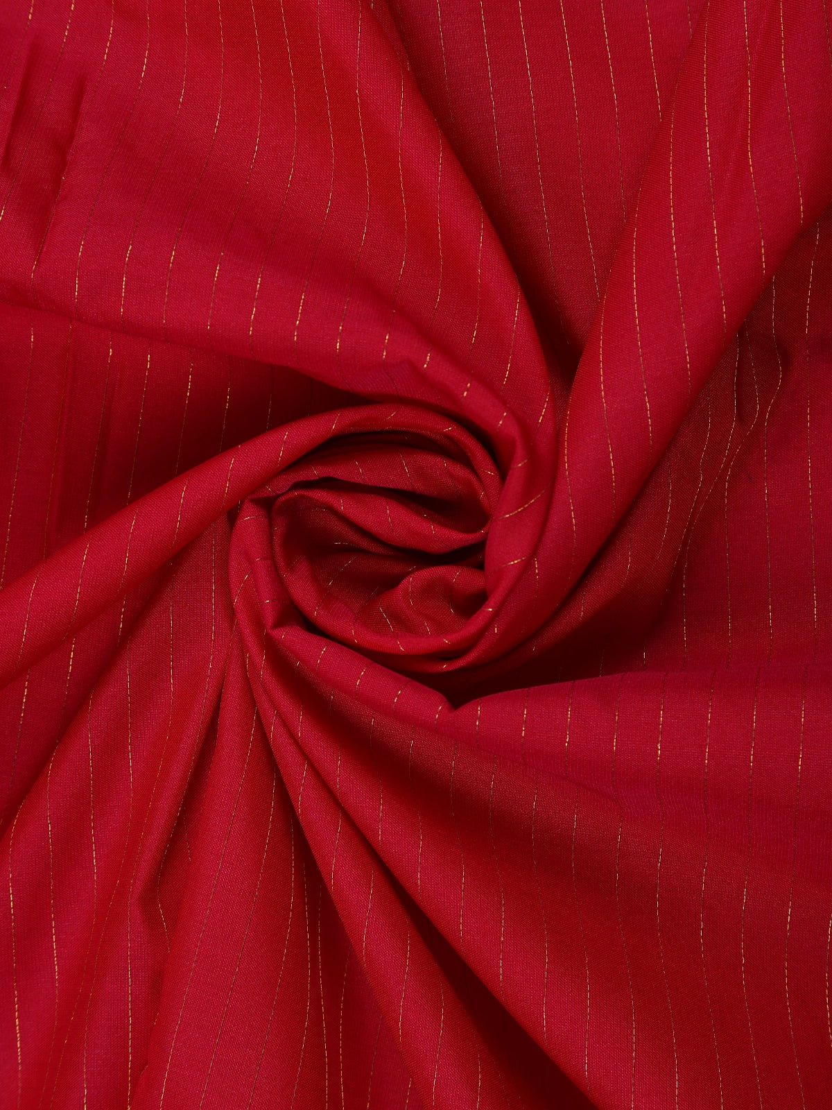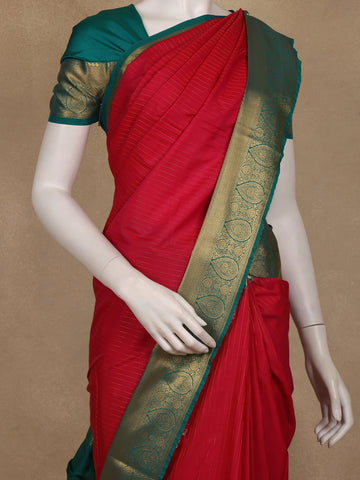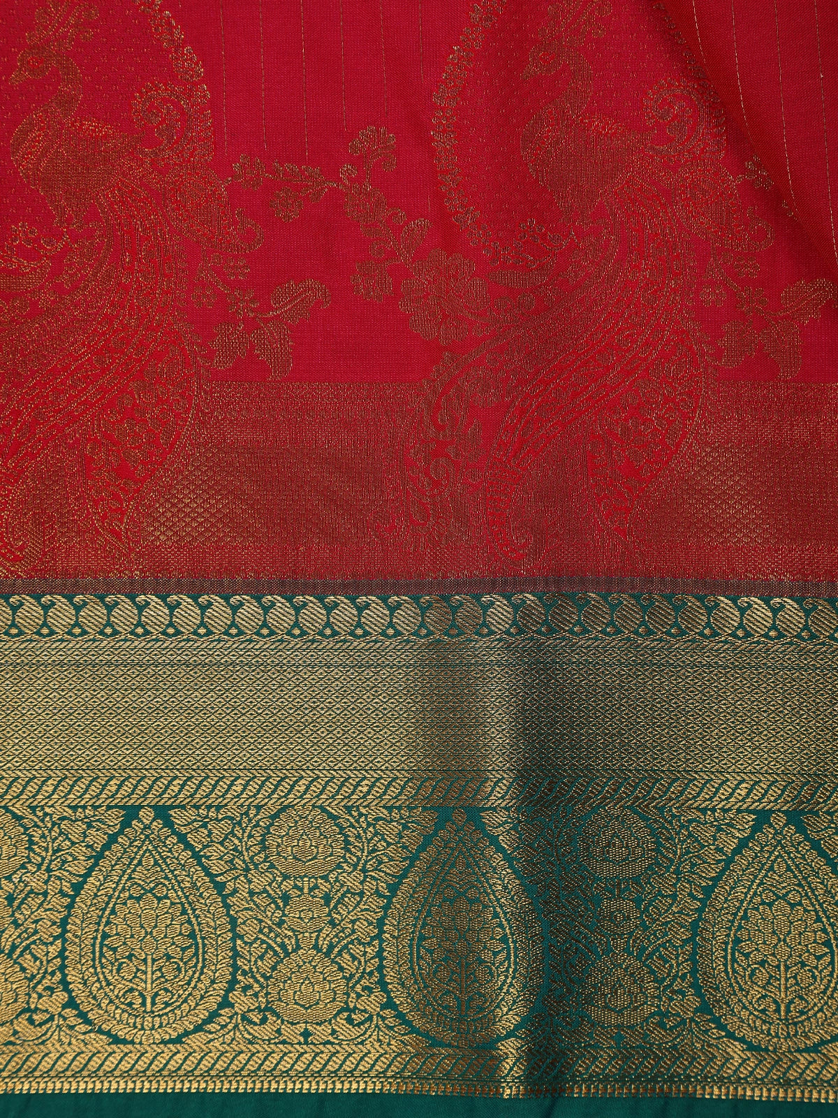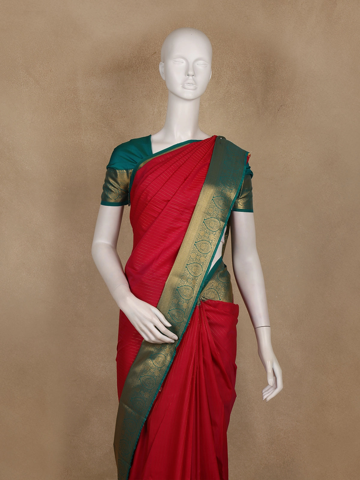 Elevate your festive wardrobe with this Red Semi Silk Saree, gracefully woven with fine golden stripes that bring a subtle shimmer to its lustrous texture. The saree is complemented by a contrast green zari border, exquisitely designed with paisley and floral motifs, lending it a regal and timeless touch. The green pallu, richly adorned with zari weaving, adds depth and grandeur, making it perfect for traditional celebrations, weddings, and festive occasions. The saree comes paired with a matching green blouse detailed with zari borders, completing the elegant ensemble with finesse.