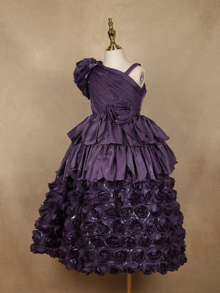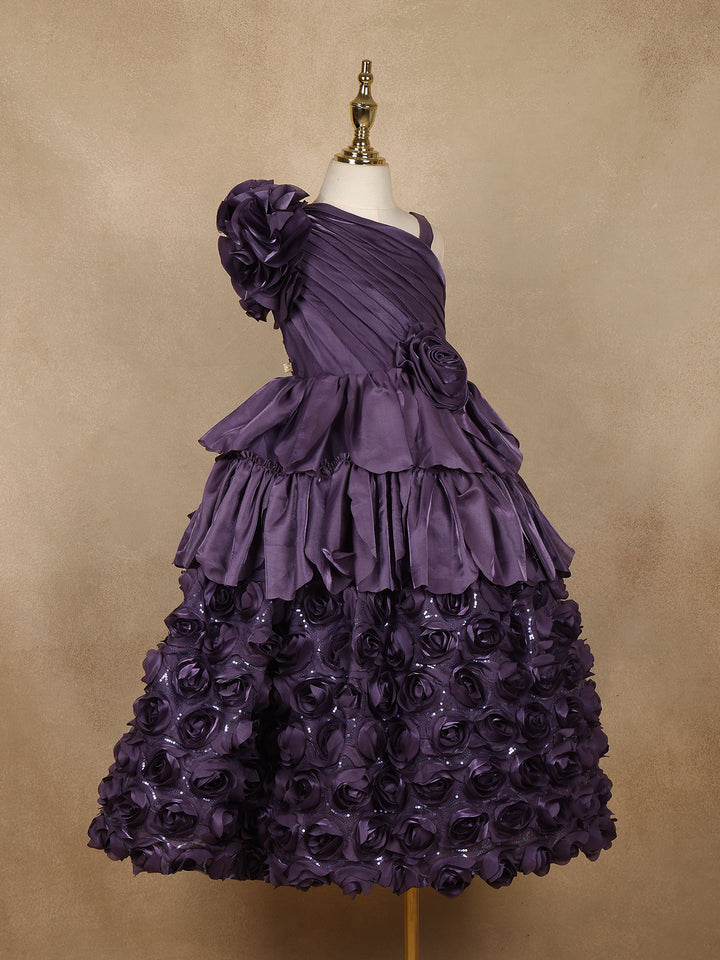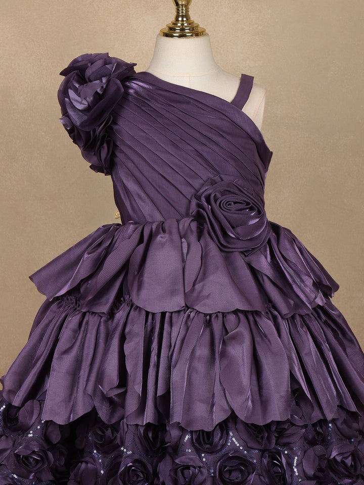 Dark Purple 3D Floral Layered One-Shoulder Satin Kids Gown