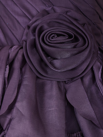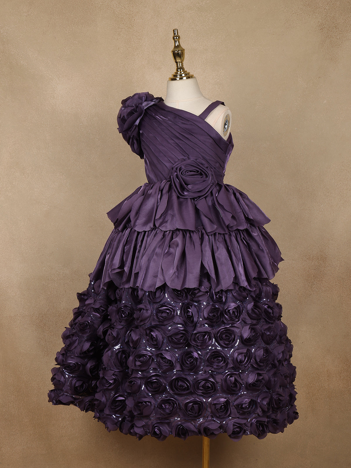 Grace your little one’s special moments with this exquisite Dark Purple one-shoulder party gown, crafted from a rich Satin fabric. The bodice features elegant diagonal pleats that add structure and sophistication, accentuated with an oversized rosette on the shoulder and waist for a statement finish. The layered midsection flows into a voluminous skirt adorned with 3D floral appliqués and sequins, creating a dreamy rose-garden effect.