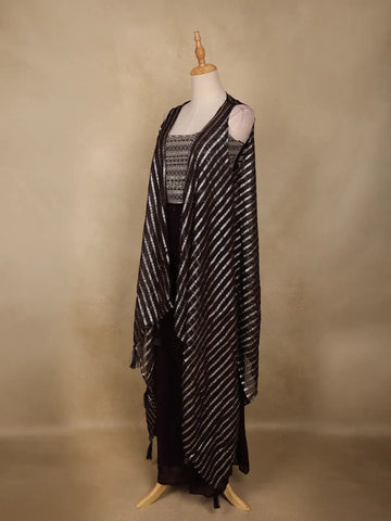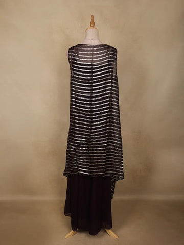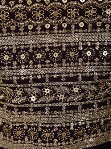 The blouse is intricately embroidered with shimmering details, while the striped dupatta adds a touch of modern sophistication. Delicate embroidery work enhances the overall richness, making this ensemble perfect for evening parties, receptions, or festive occasions.