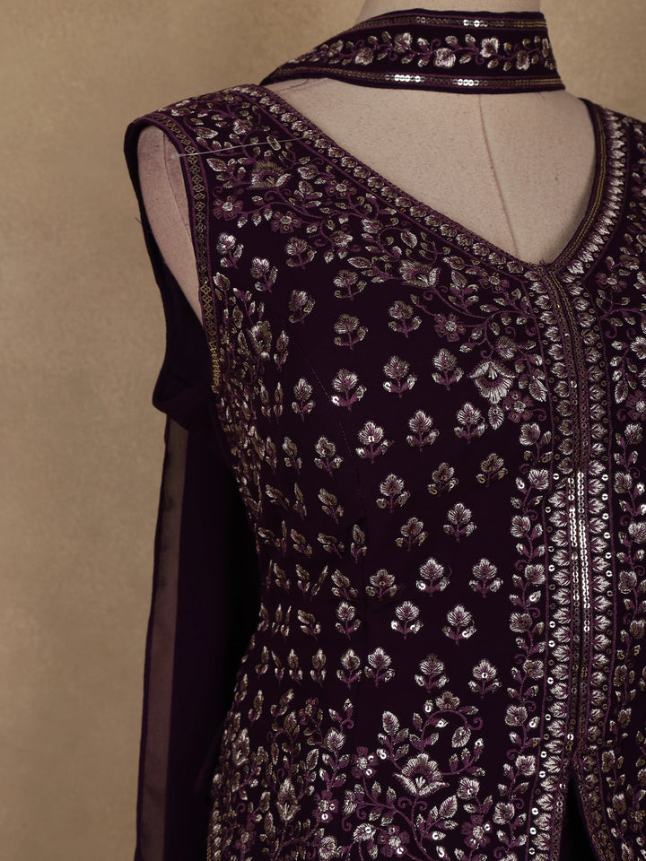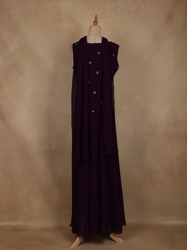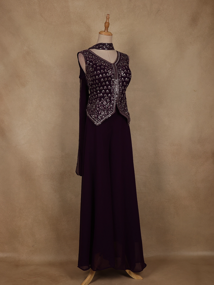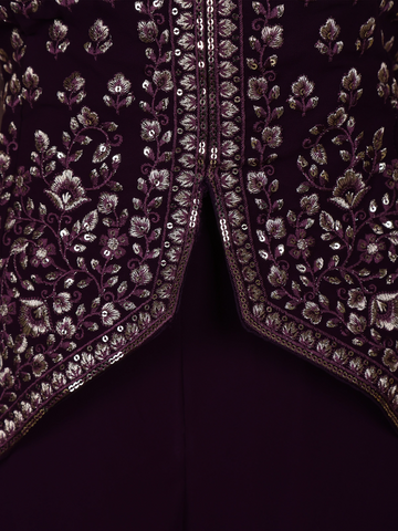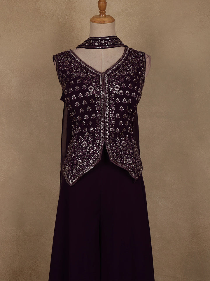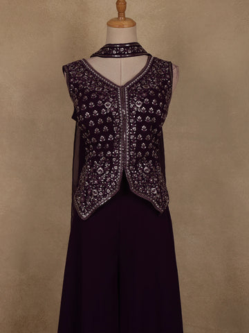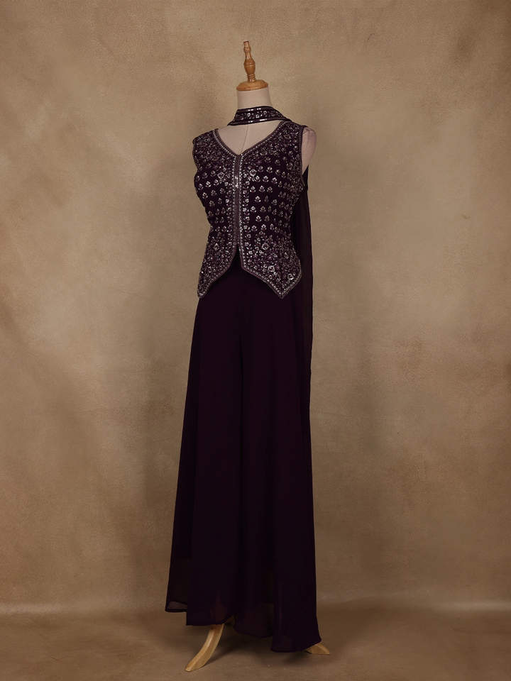 Dark Purple Floral Embroidered Georgette Palazzo Suit