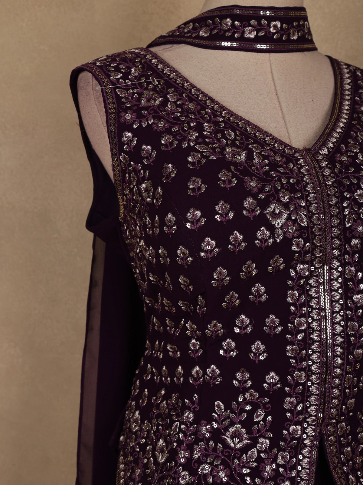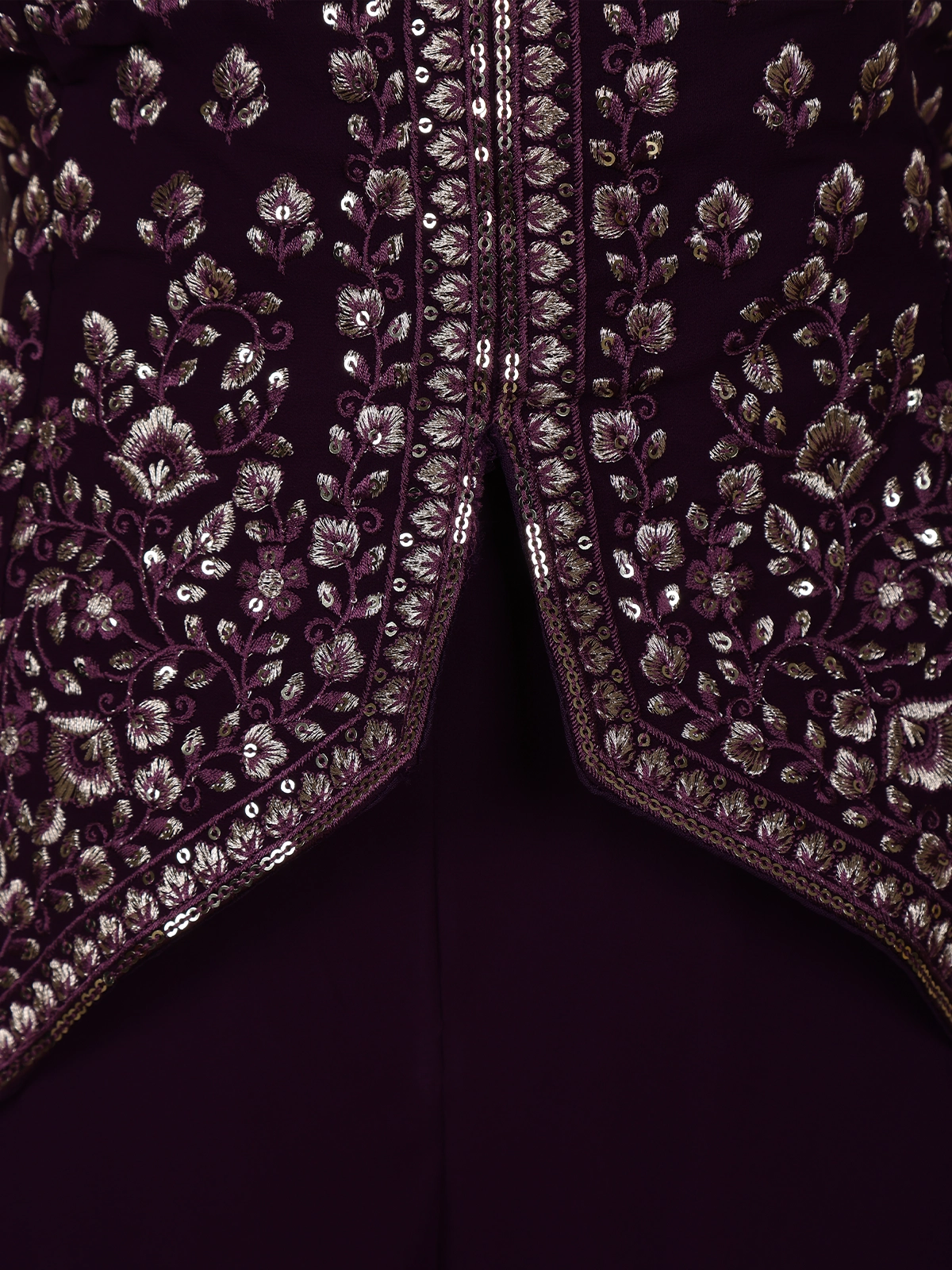 Drape yourself in elegance with this Dark Purple Floral Embroidered Georgette Palazzo Suit, a masterpiece of timeless beauty and modern sophistication. Crafted from lightweight georgette, this ensemble features exquisite floral embroidery highlighted with sequins and thread work, creating a delicate shimmer that catches the light beautifully.