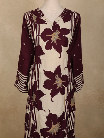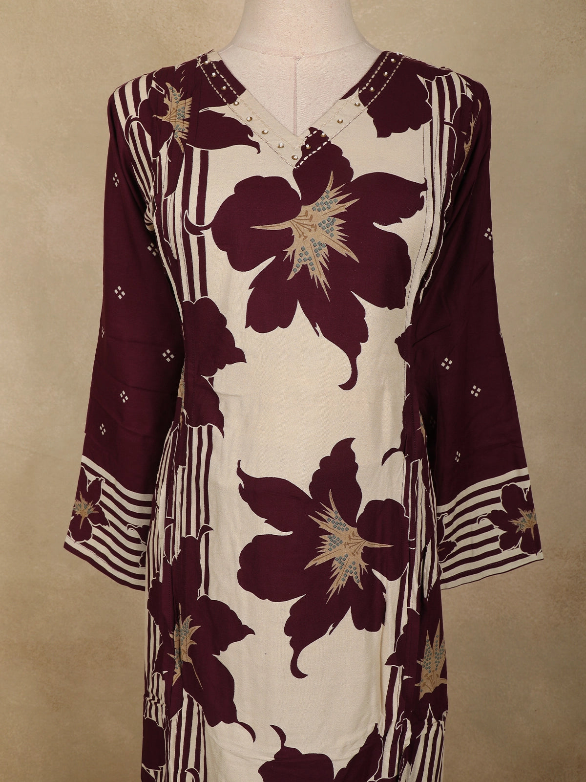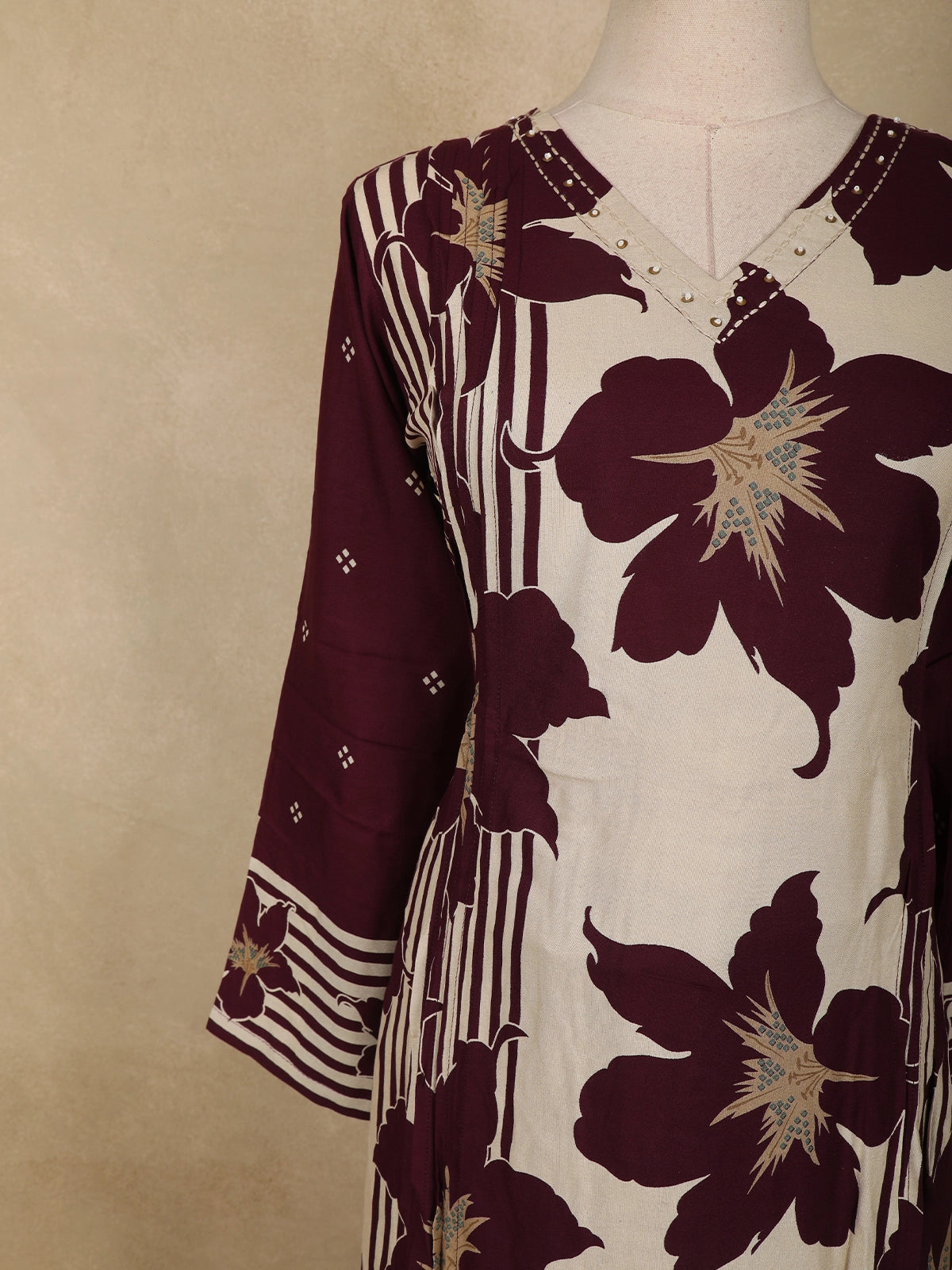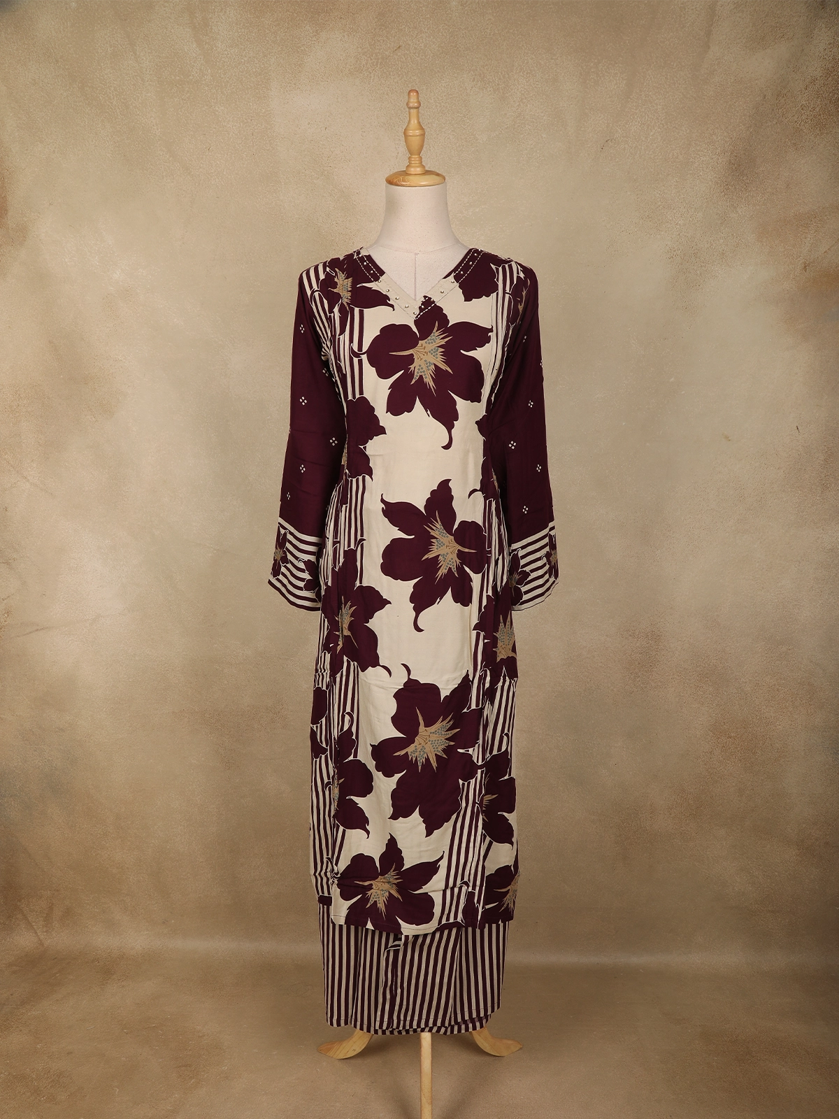 The kurti features a classic straight-cut silhouette adorned with bold floral prints in contrasting ivory tones, enhanced by subtle striped detailing that adds a modern touch. The V-neckline lends a flattering finish, while the three-quarter sleeves with printed border accents elevate the overall appeal. Paired with matching straight pants featuring coordinated stripe patterns, this ensemble creates a balanced and polished look.