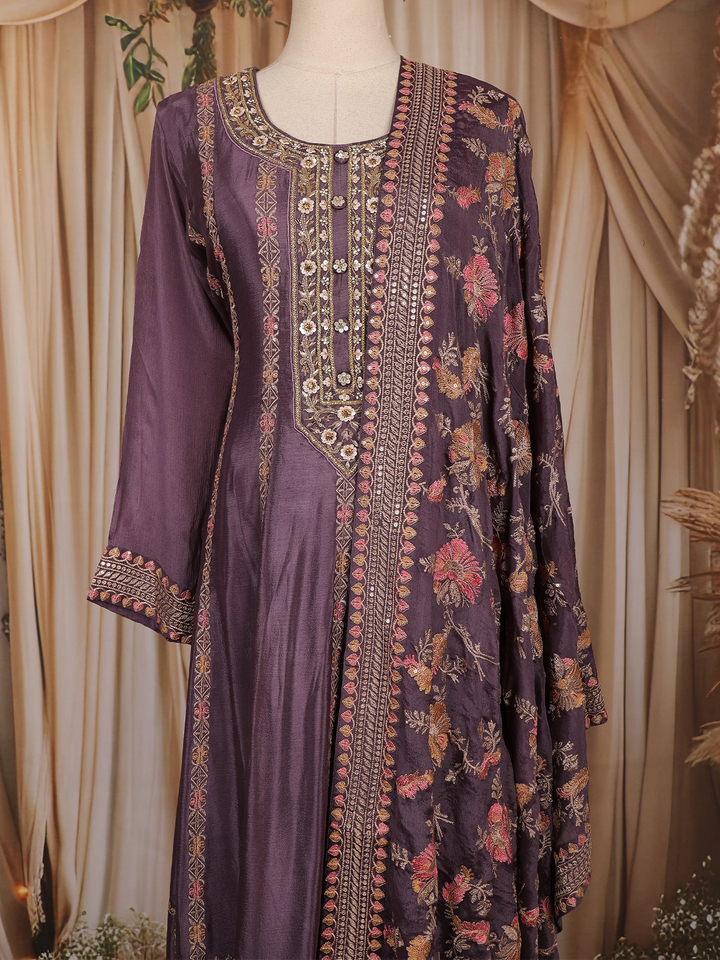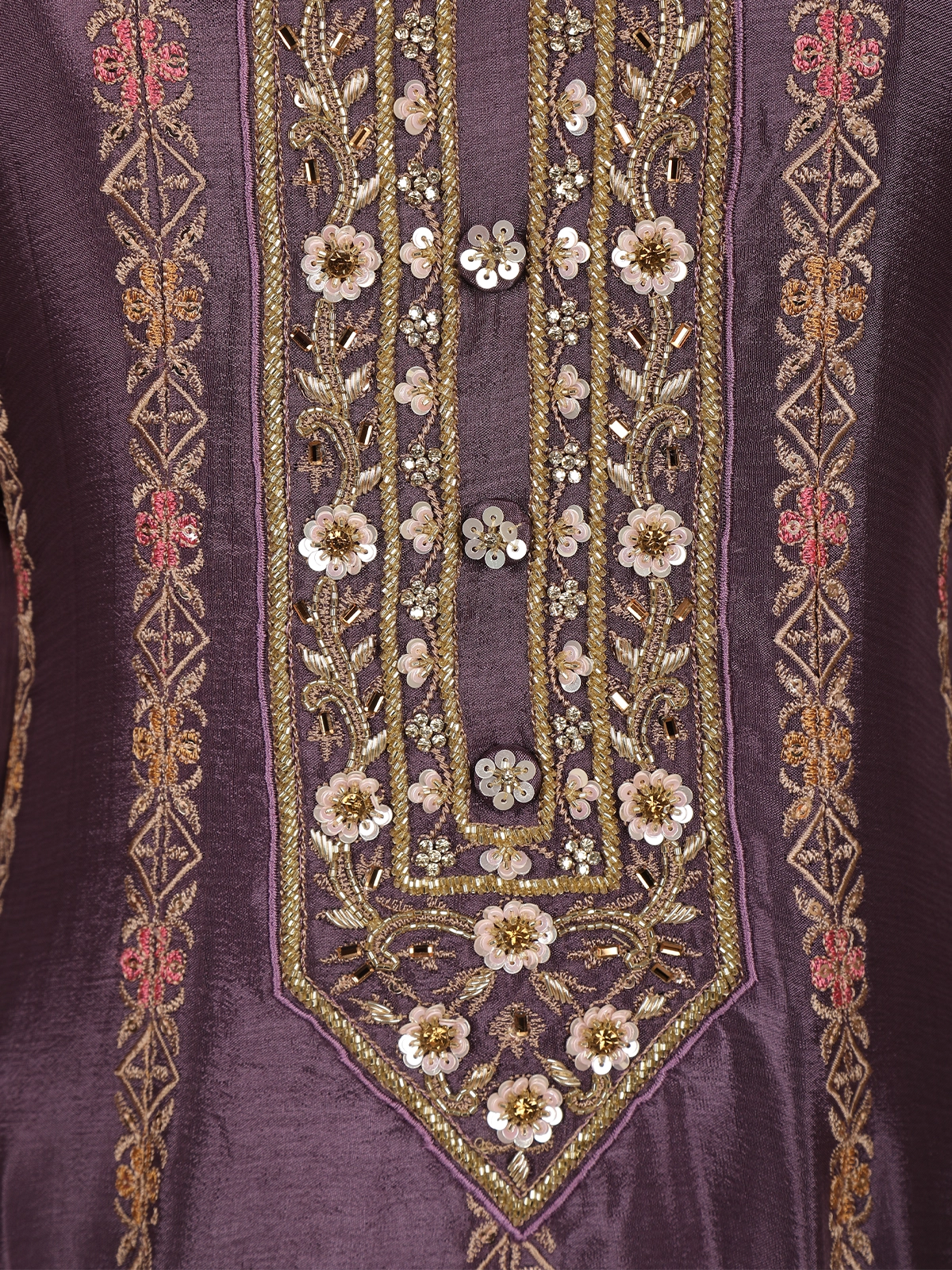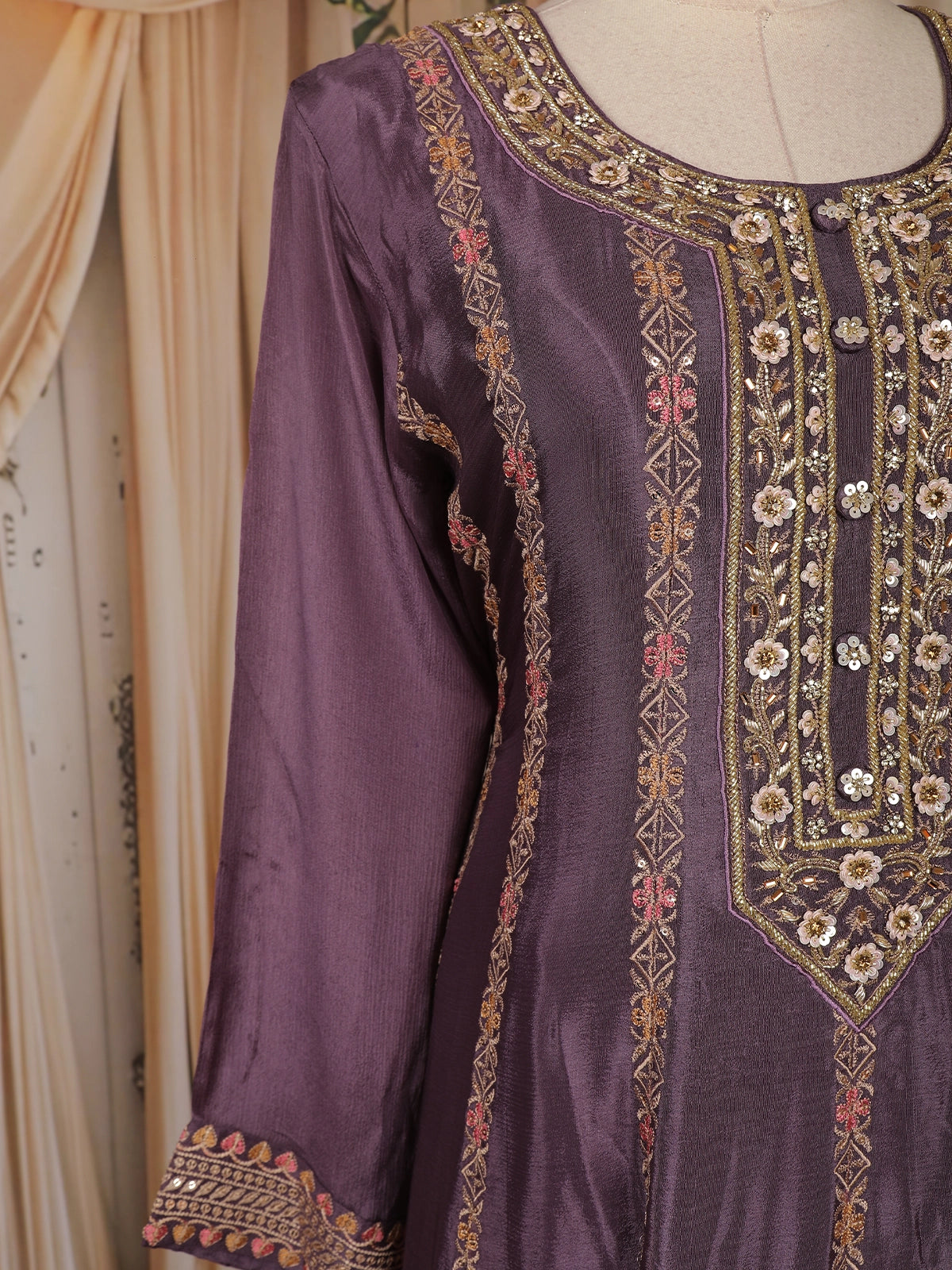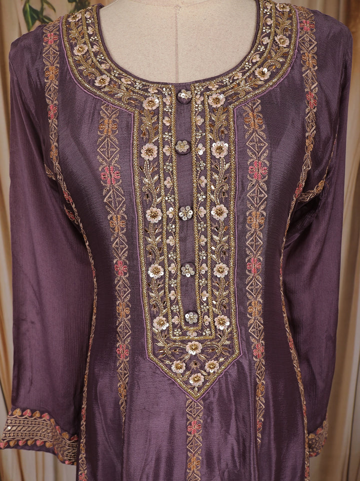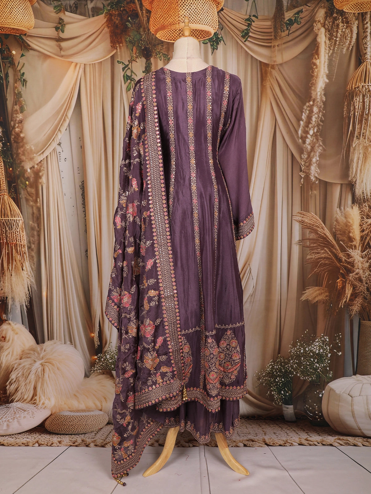 Dark Purple Floral Thread and Sequins Embroidered Design Crepe Palazzo Suit