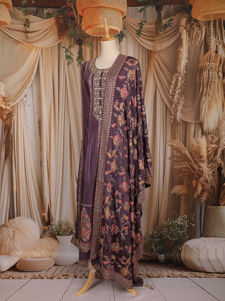 Step into refined elegance with this Dark Purple Floral Thread and Sequins Embroidered Crepe Palazzo Suit, a beautiful blend of richness, comfort, and traditional artistry. The deep purple shade exudes a regal charm, making this ensemble a standout choice for festive and celebratory occasions.