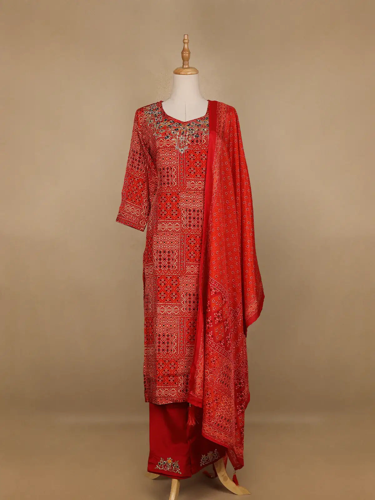 Make a bold and stylish statement with this Dark Red Abstract Printed Semi Silk Salwar Suit, crafted for the modern woman who appreciates both tradition and artistic flair. The straight-cut silhouette is tailored in soft semi silk fabric, offering a fluid drape and a touch of sheen that enhances the suit’s sophisticated appeal.
