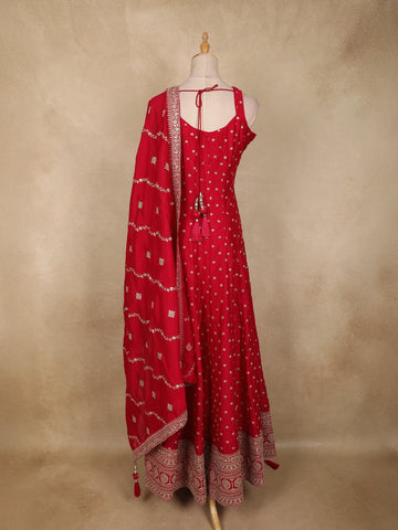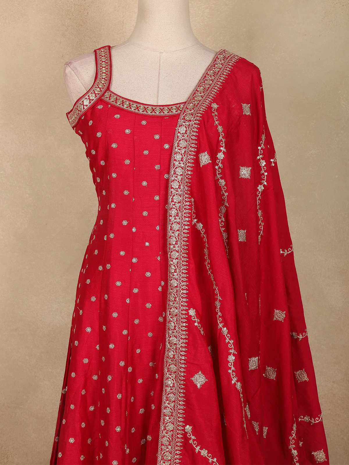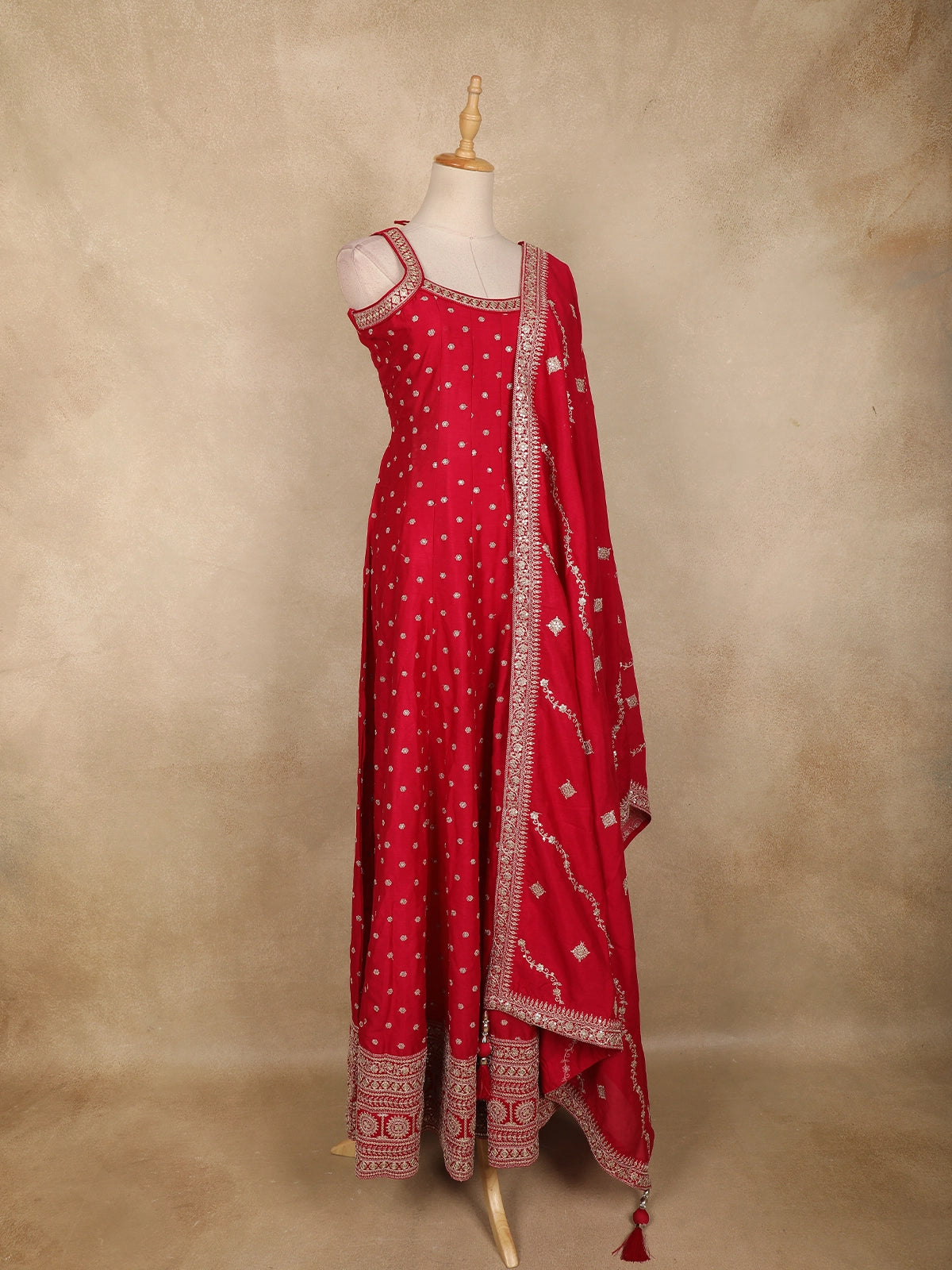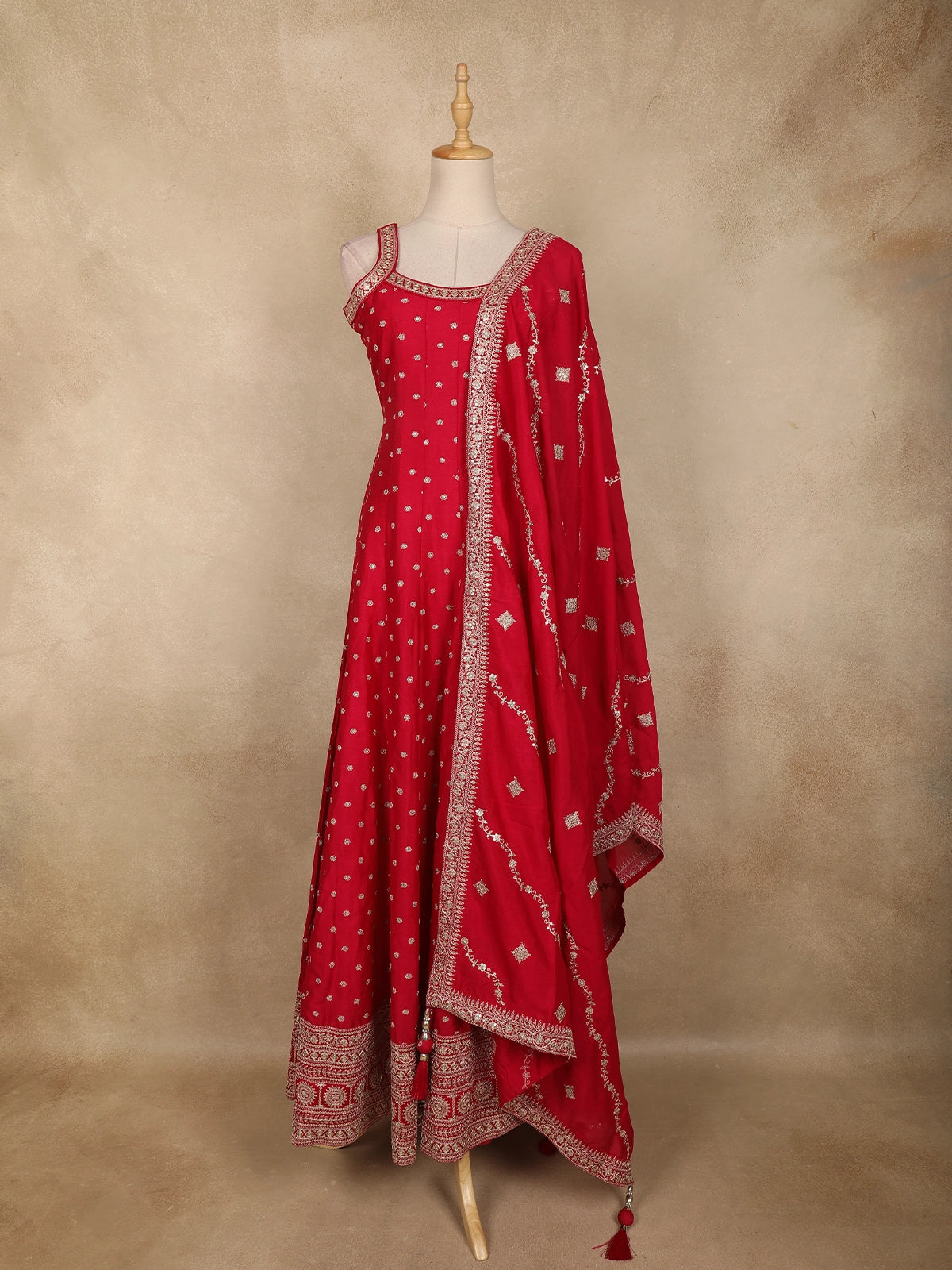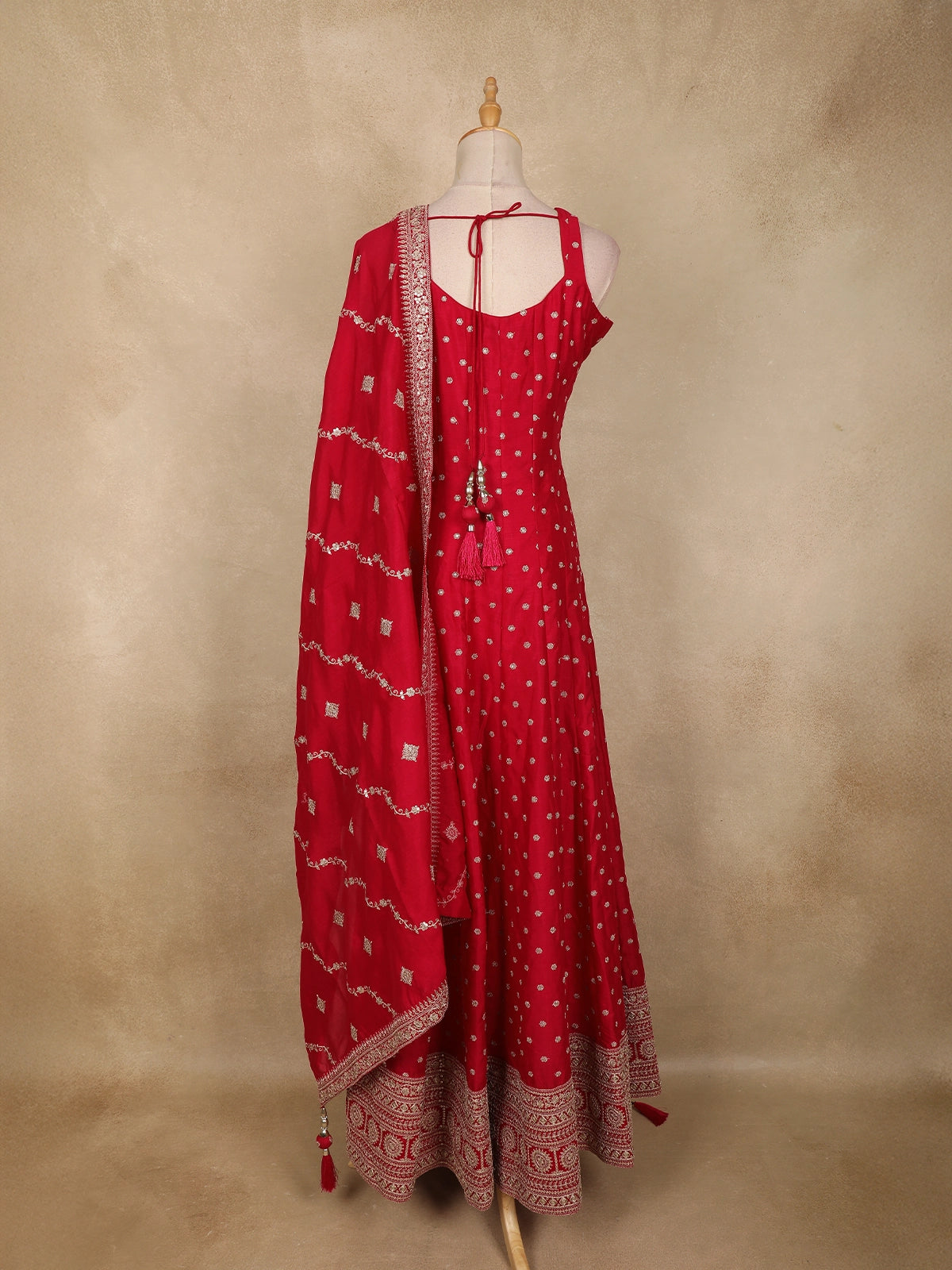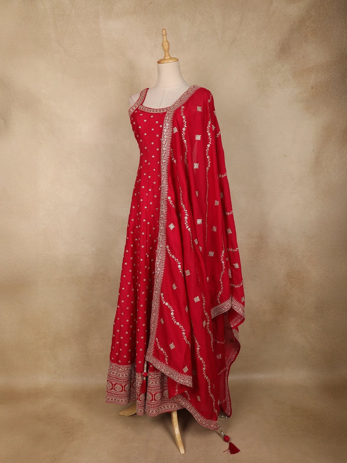 Dark Red Dotted and Floral Embroidered Design Georgette Gown with Dupatta