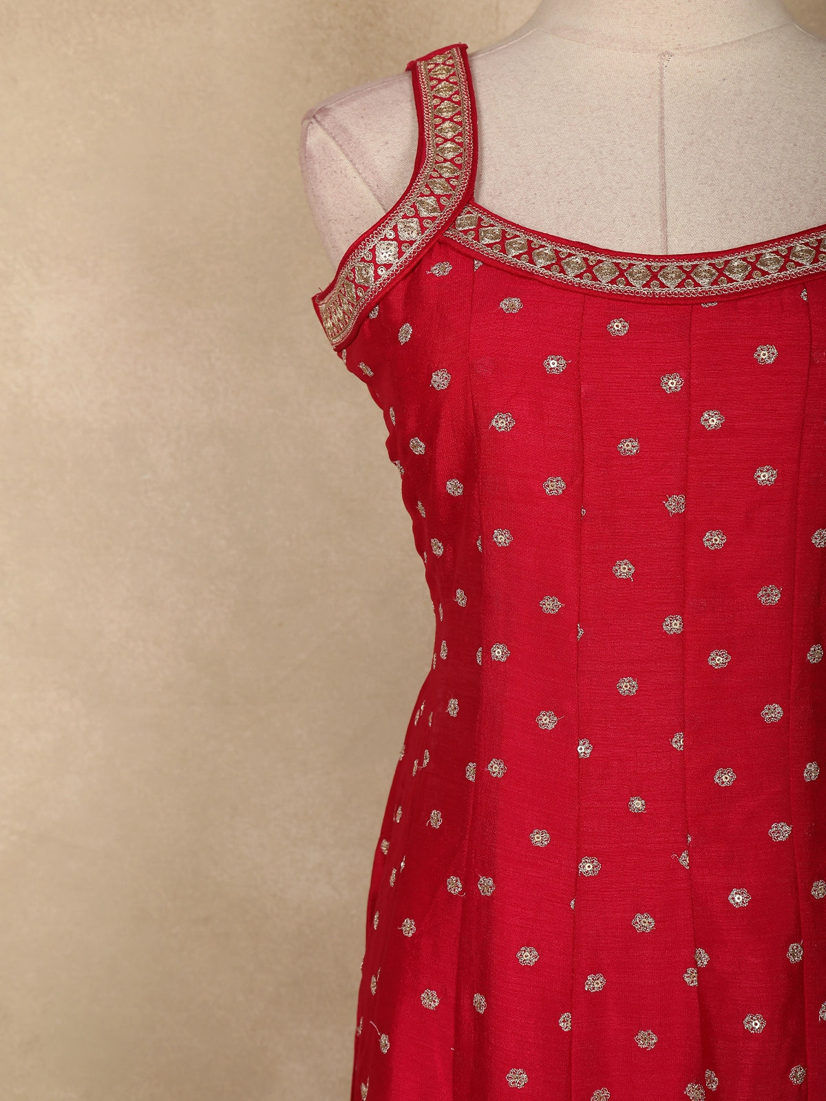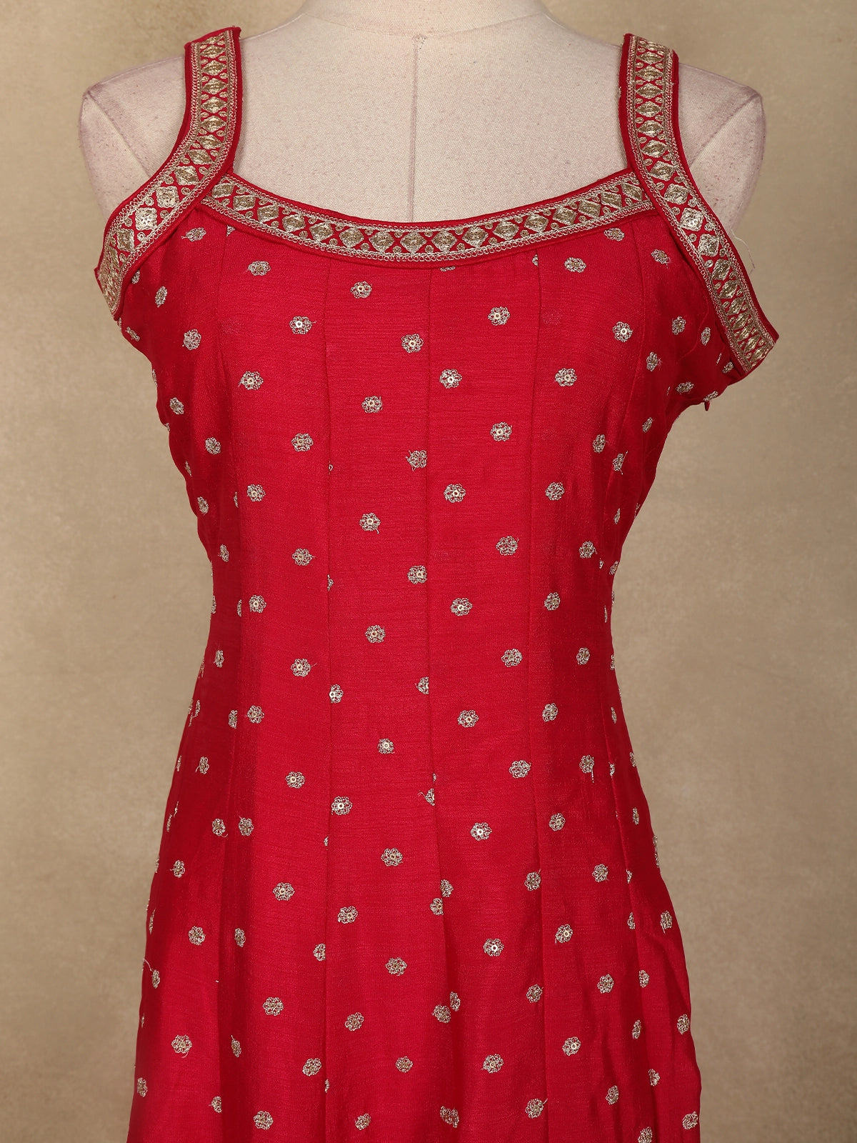 Elegant and effortlessly graceful, this dark Red georgette gown is designed to make a refined festive statement. Crafted in lightweight, flowy georgette, the gown drapes beautifully, creating a flattering silhouette with fluid movement. The bodice is adorned with delicate all-over dotted embroidery that adds subtle texture and shimmer, while the neckline is finished with intricate thread and zari detailing for a polished ethnic touch.
