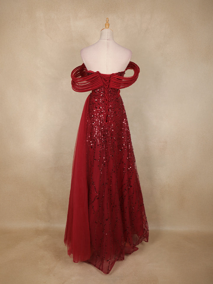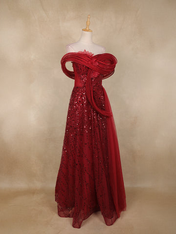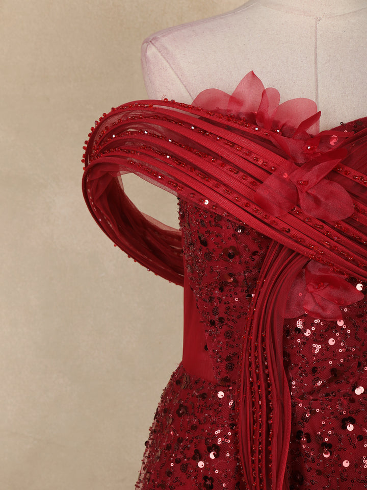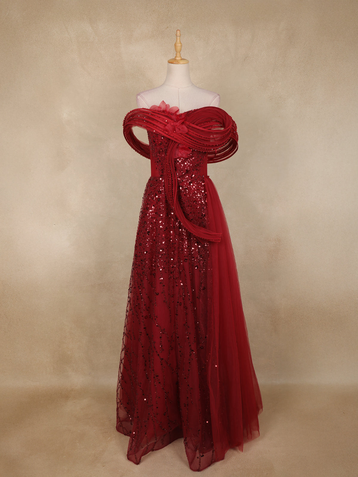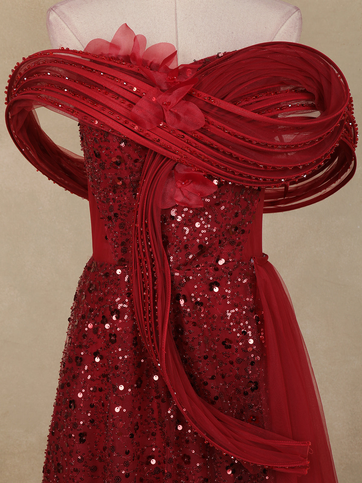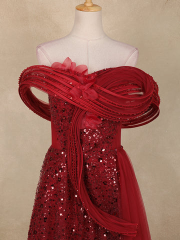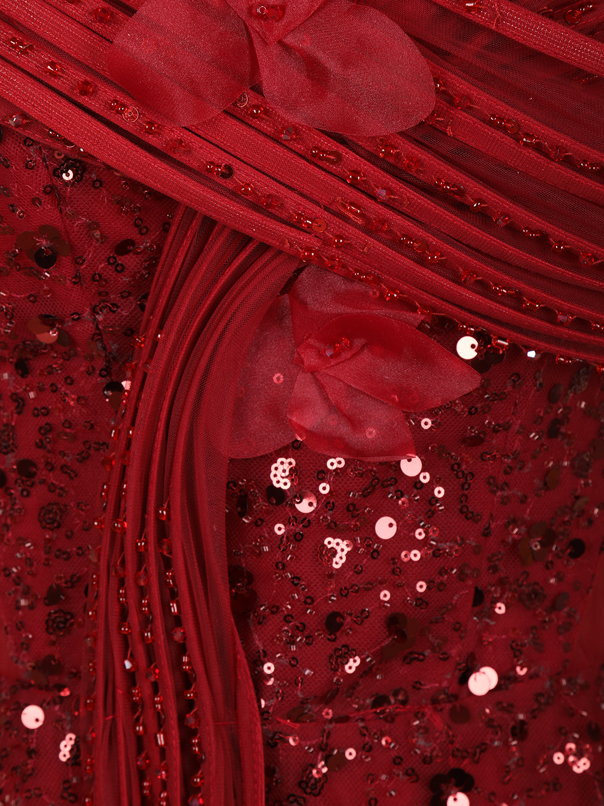 Dark Red Sequins Embellished Design Net Mermaid Gown with 3D Draped Shoulder Design