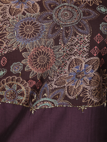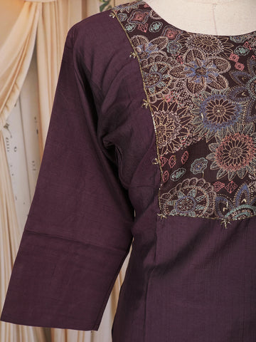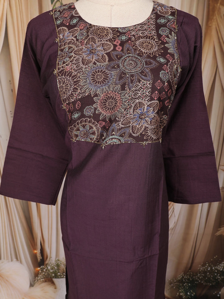 The kurta features a straight-cut silhouette in a rich dark wine shade, beautifully complemented by a printed yoke panel adorned with intricate floral and mandala motifs in muted tones of grey, beige, and blue. The round neckline and three-quarter sleeves add a timeless appeal, making it suitable for both traditional and modern styling.