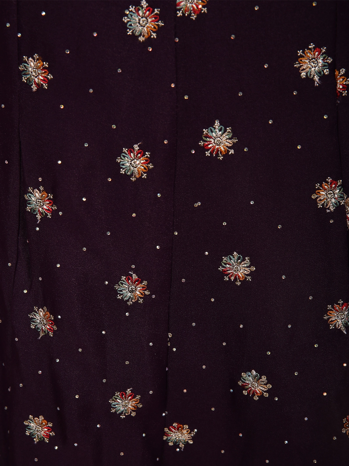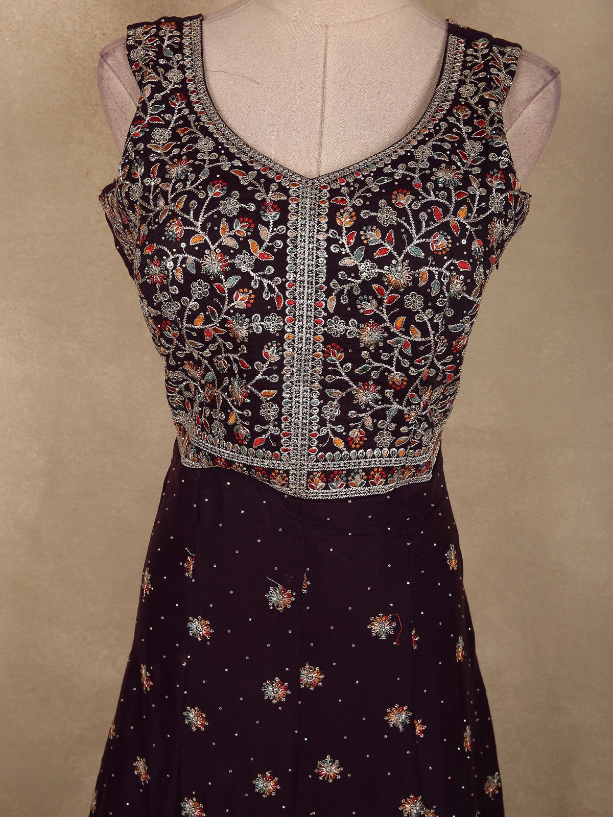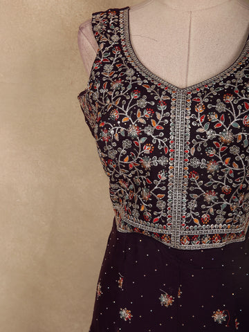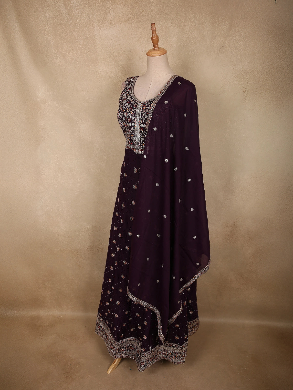 Deep Aubergine Wine Purple Floral Thread Embroidered Design Georgette Gown with Dupatta