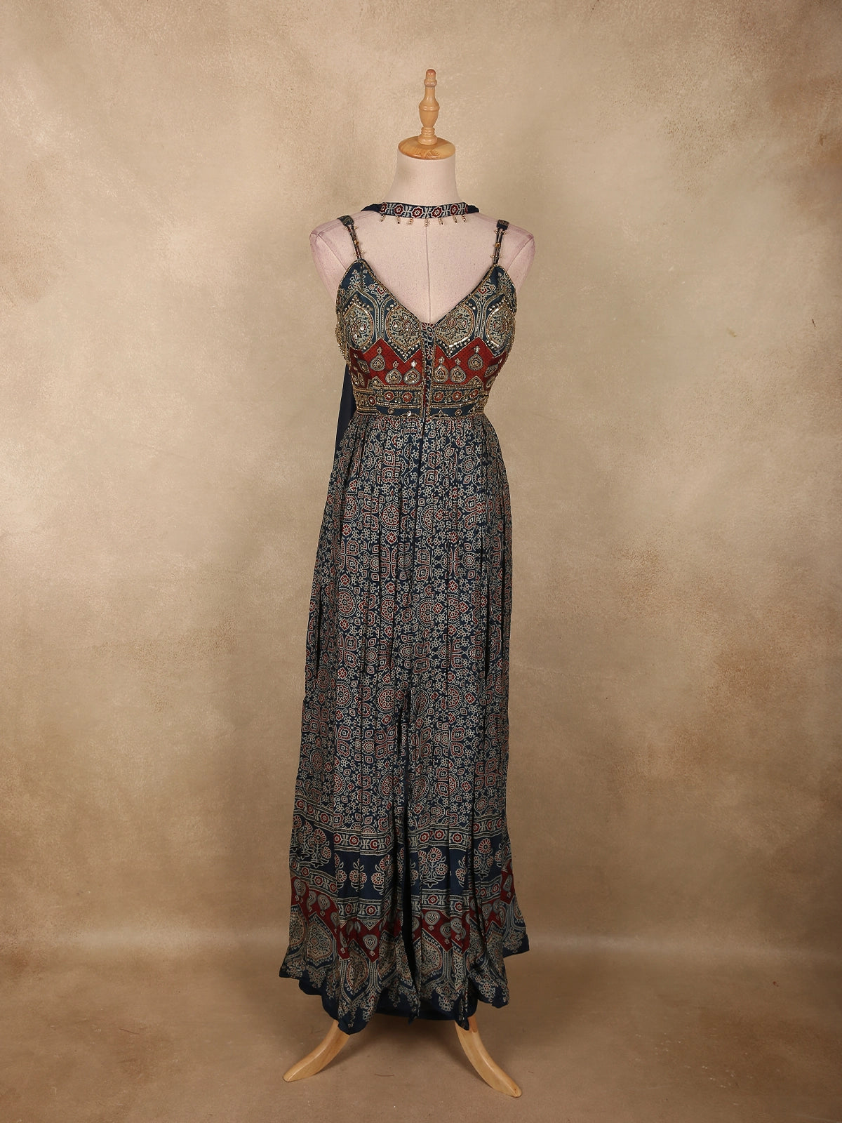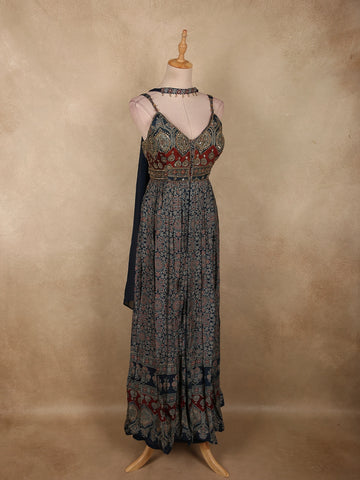 Ideal for festive gatherings, cultural events, and evening celebrations, this palazzo suit is perfect for those who appreciate traditional prints, deep earthy hues, and effortlessly elegant styling.