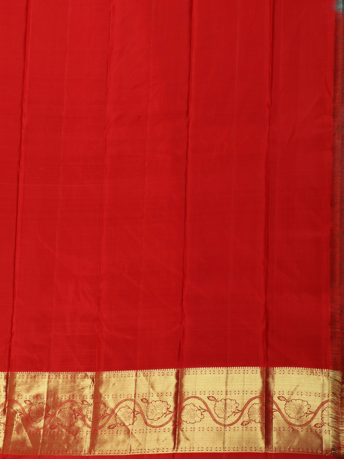 Crafted from authentic Kanchipuram silk, the saree offers a luxurious texture, natural sheen, and a graceful fall that elevates every drape. The highlight lies in its contrast zari border, woven in antique gold with intricate traditional patterns and finished with a bold red edging, lending a striking and festive appeal.