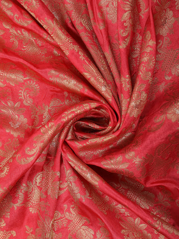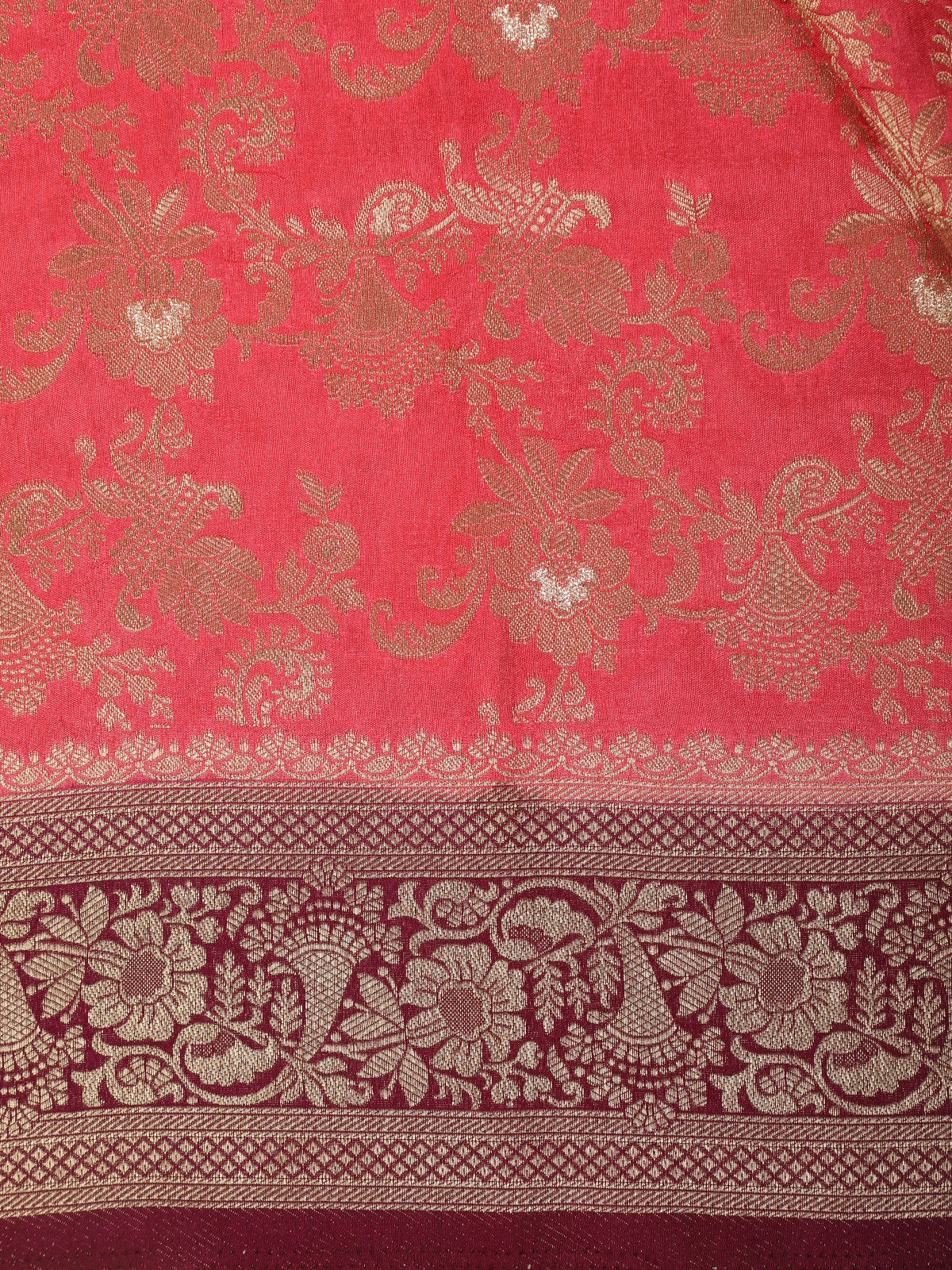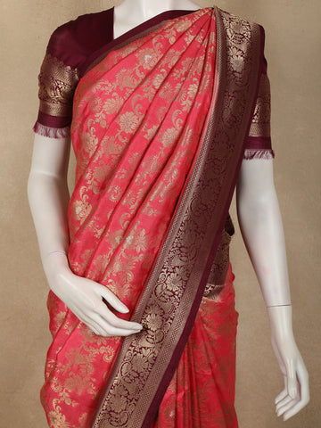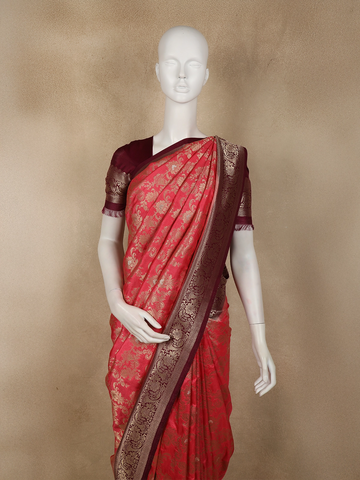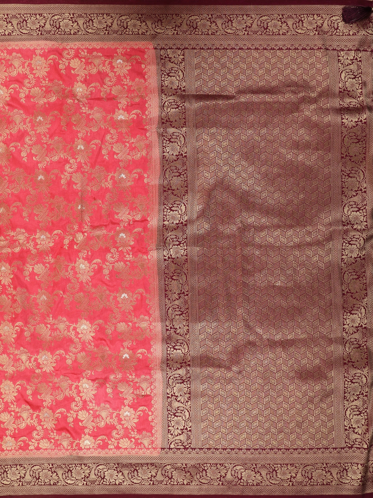 Deep Coral Red Floral Zari Woven Design Banarasi Silk Saree with Contrast Border