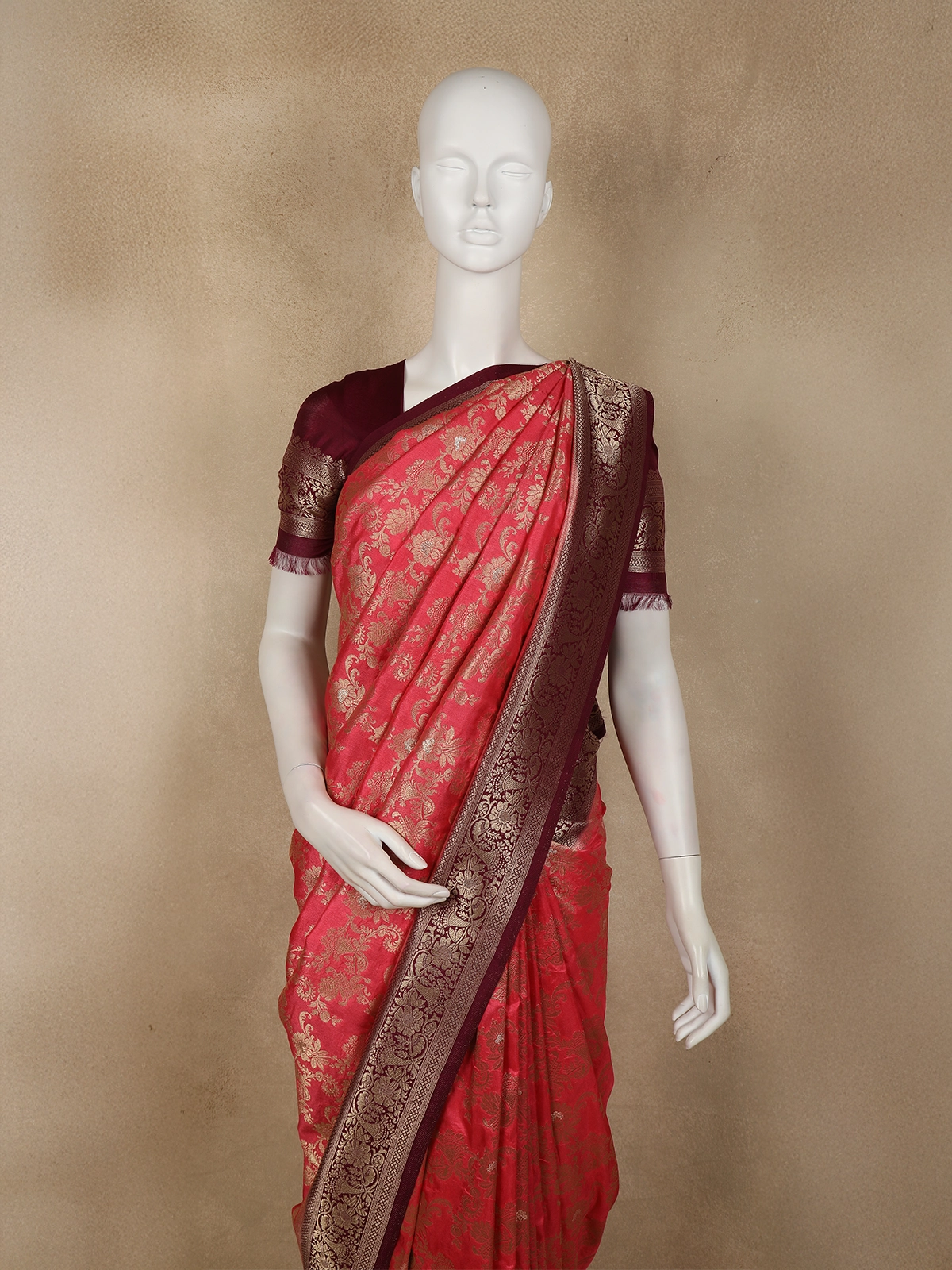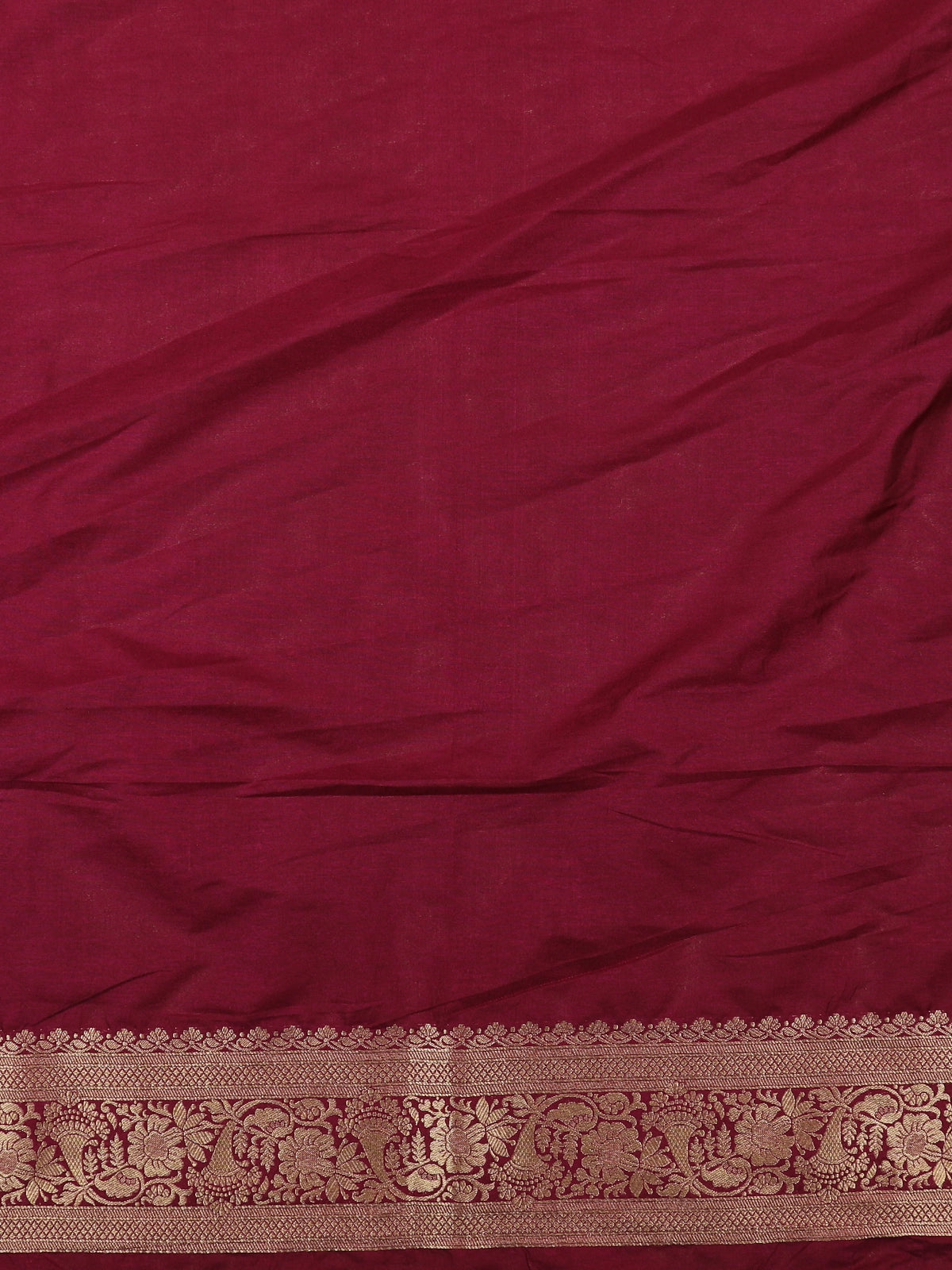 The highlight of the saree is its contrasting deep wine-maroon border, beautifully enhanced with detailed gold zari weaving, adding depth and definition to the silhouette. The harmonious contrast elevates the overall appeal, making it an ideal choice for weddings, festive celebrations, and traditional occasions. Elegant, opulent, and eternally graceful, this saree is a statement piece that embodies heritage craftsmanship with refined sophistication.