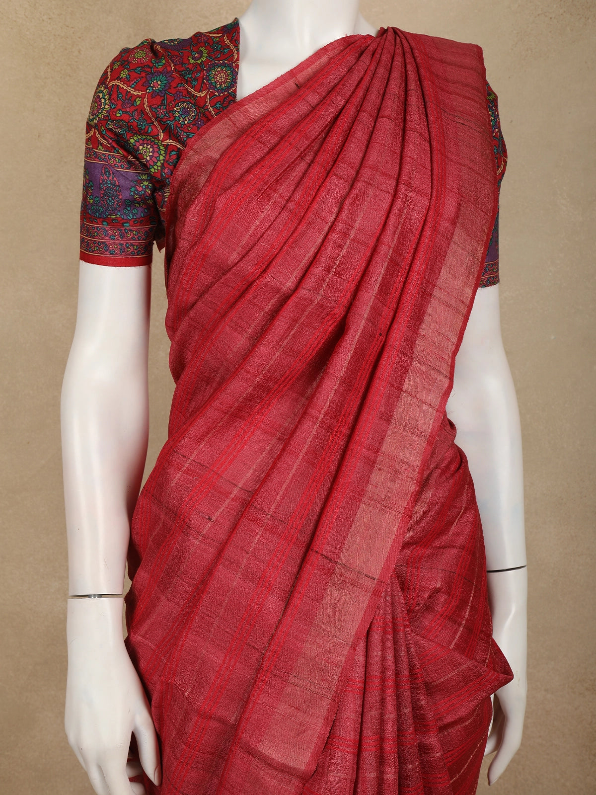 The body of the saree is beautifully balanced by a contrast floral blouse, showcasing intricate multicolour floral patterns that bring a vibrant, artisanal touch to the overall look. The gentle tonal variations within the weave highlight the raw elegance of Tussar silk, making the saree feel graceful and authentic.