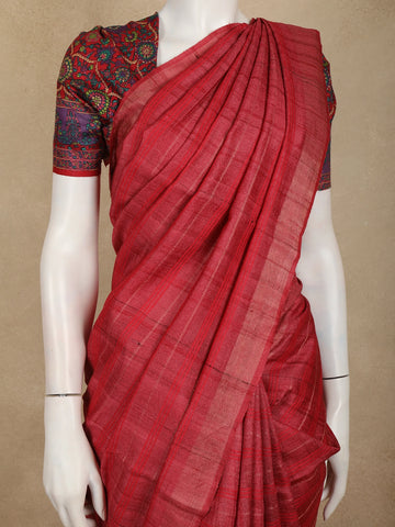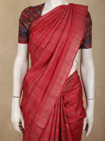 Dark Pink Checked Woven Design Pure Tussar Silk Saree