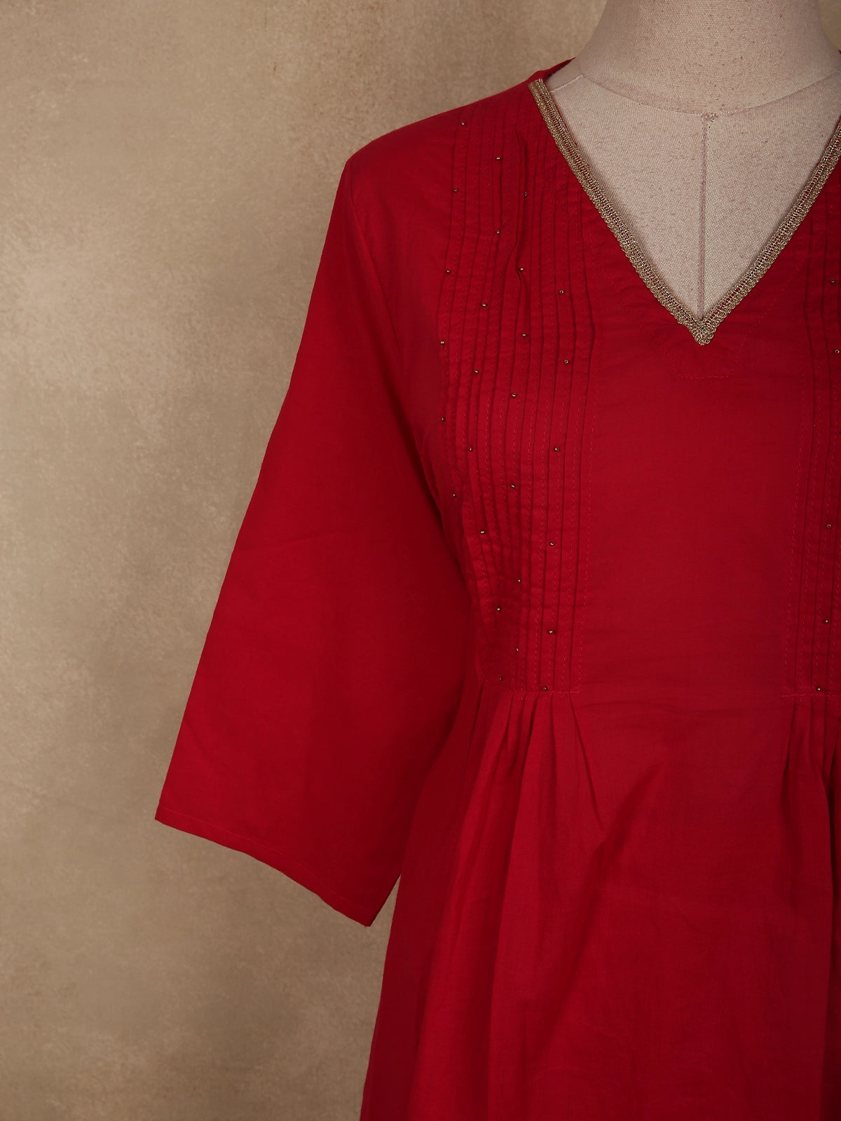 The kurta features a clean V-neckline accented with subtle textured detailing, adding a refined touch to the otherwise solid silhouette. Gentle pleats falling from the neckline enhance the flow and create a flattering fall. The three-quarter sleeves are finished with matching textured borders, lending a hint of understated sophistication. Its straight, relaxed cut ensures ease of movement while maintaining a polished look.