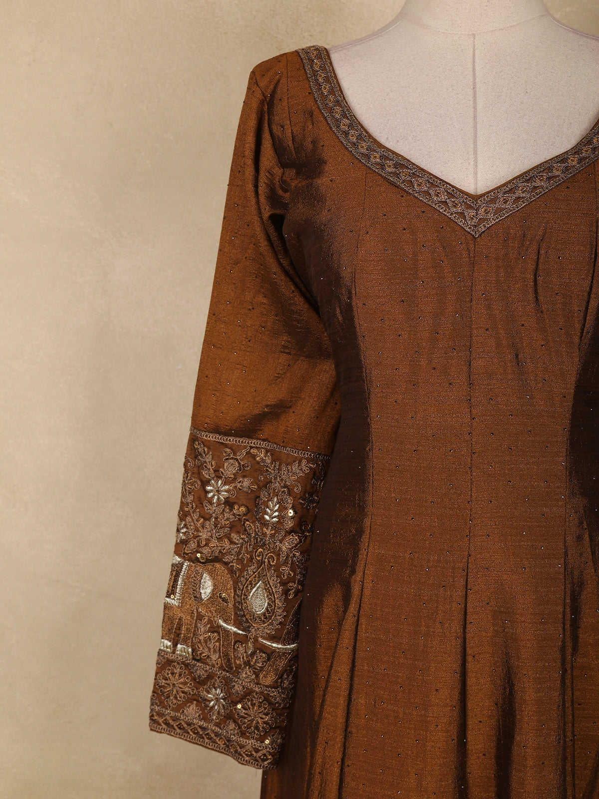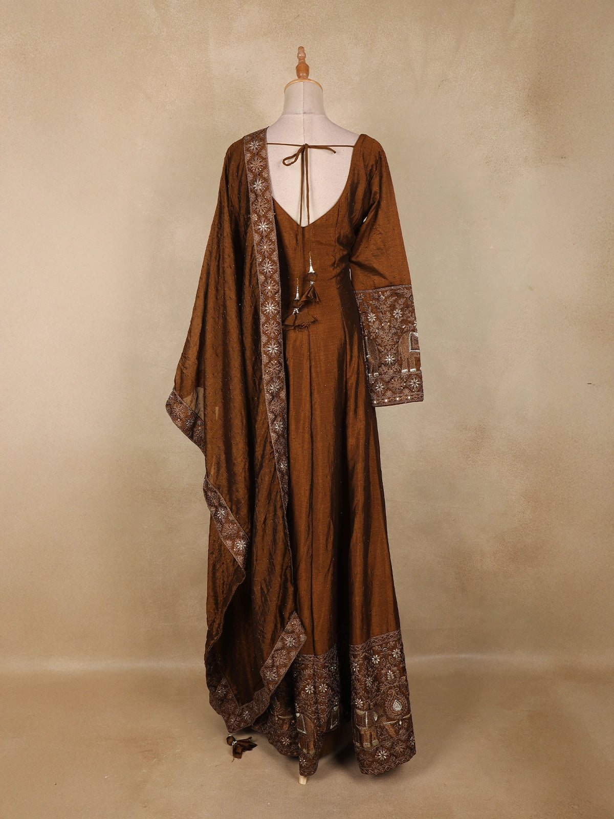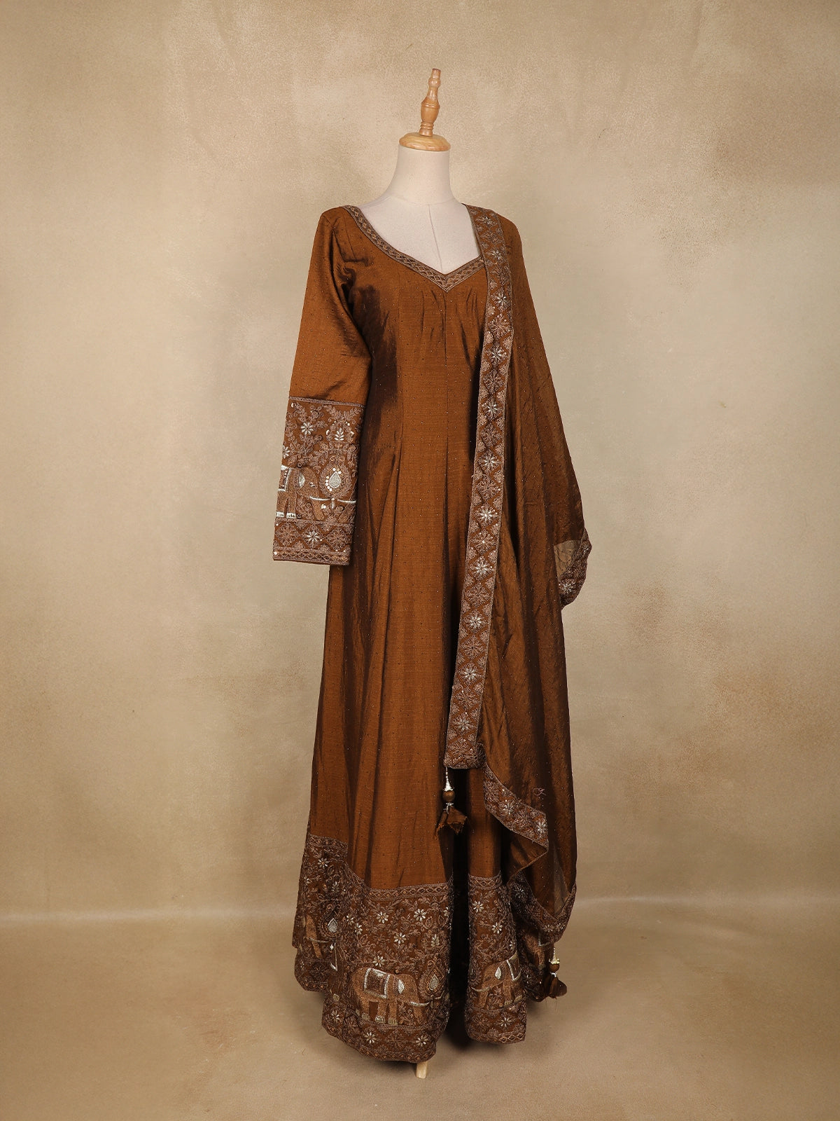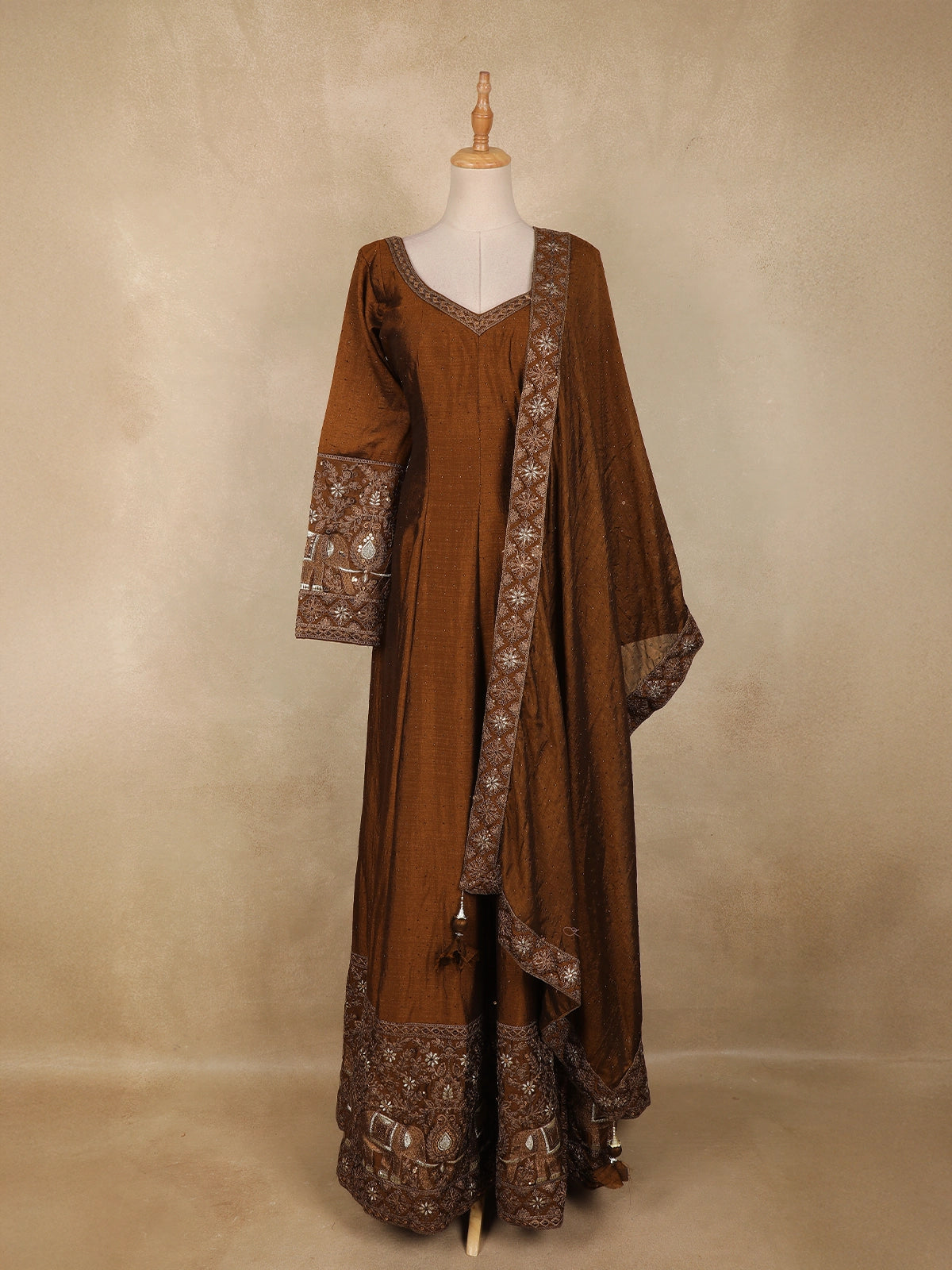 Deep Earthy Brown Floral Embroidered Design Georgette Gown with Dupatta