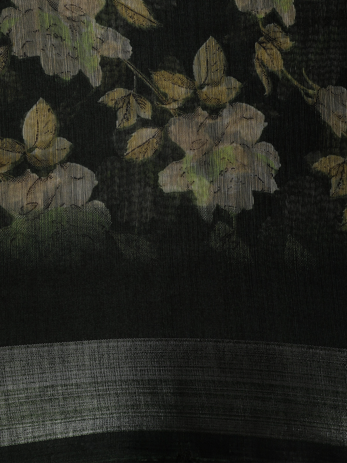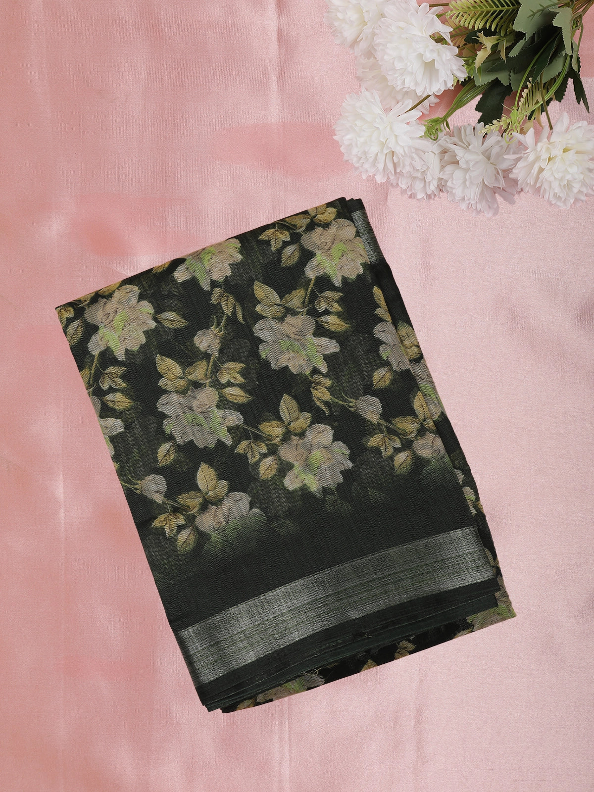 Deep Forest Green Floral Printed Design Mixed Cotton Saree