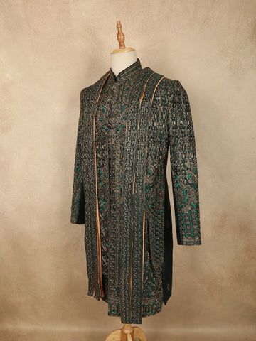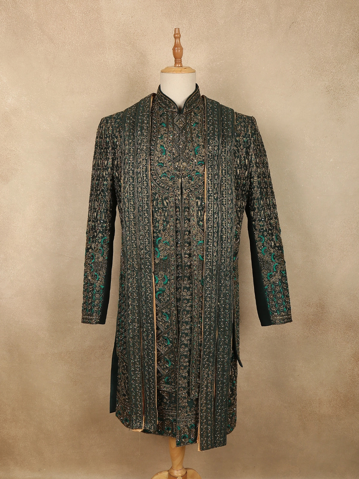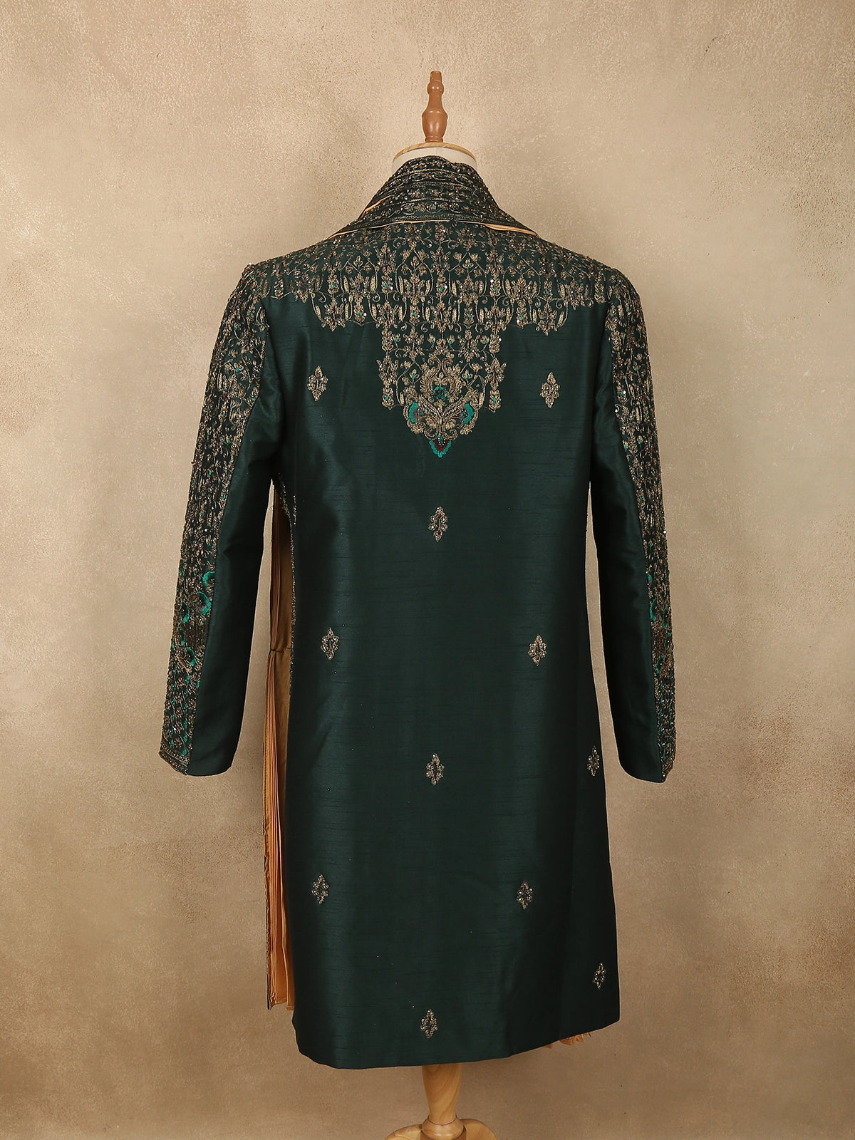 Deep Forest Green Floral Zari Embroidered Design Semi Silk Men's Sherwani Suit with Dupatta