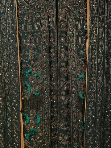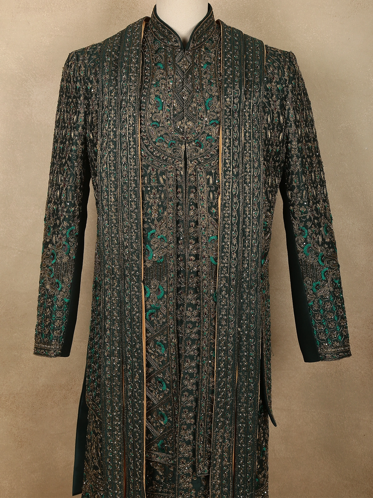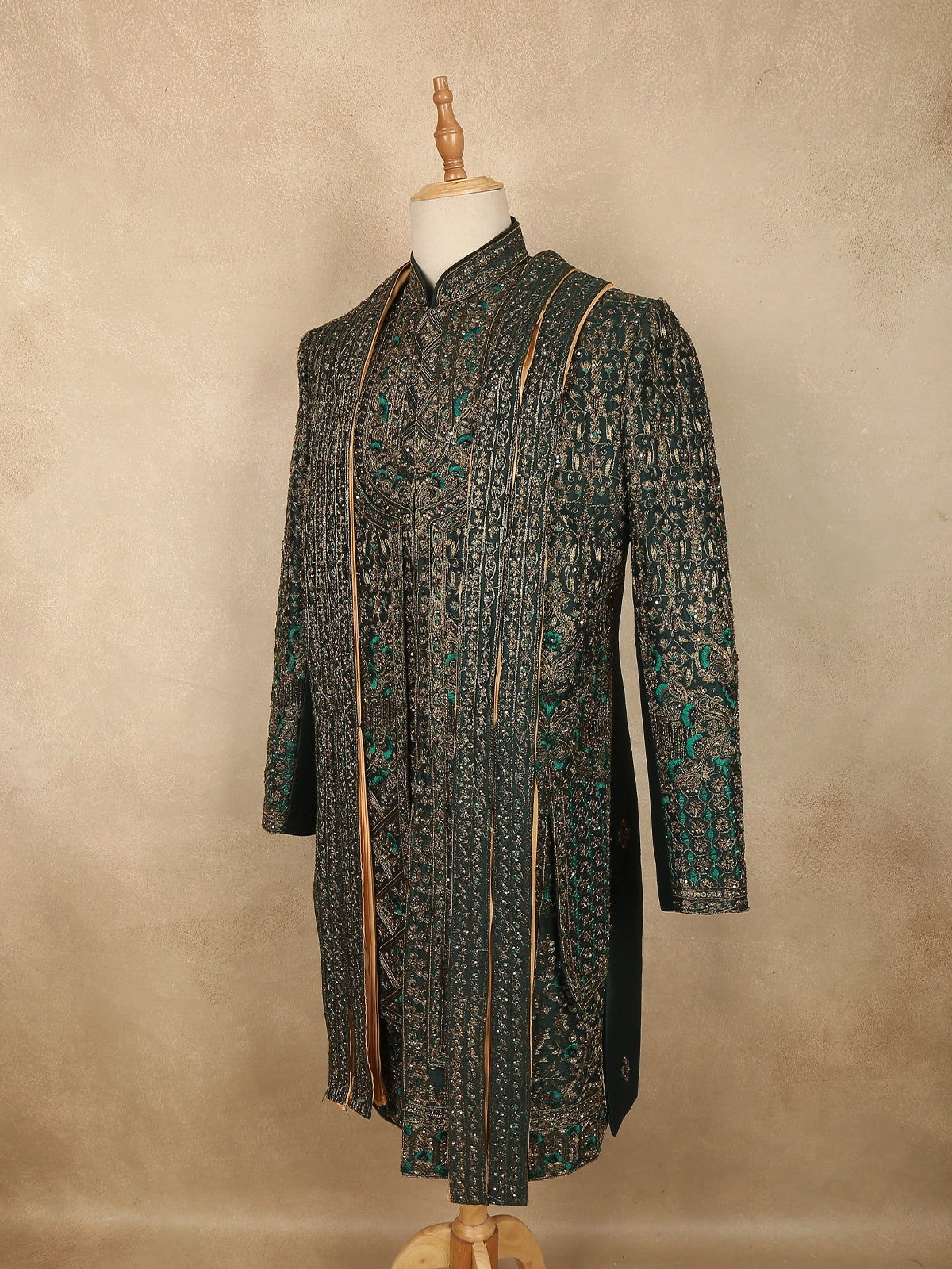 Designed in premium semi-silk fabric, the sherwani offers a soft sheen that enhances its luxurious appeal. The surface is adorned with intricate floral zari embroidery arranged in elegant vertical panel patterns, adding depth and structure to the silhouette. Antique gold zari threads blend seamlessly with delicate teal highlights, creating a refined contrast that enriches the overall design.